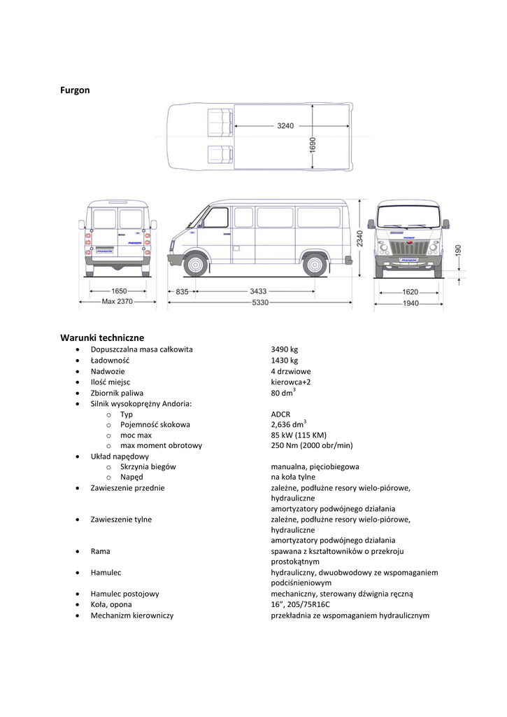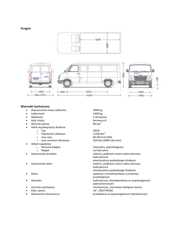 Furgon Warunki techniczne • • • • • • • Dopuszczalna masa całkowita Ładowność Nadwozie Ilość miejsc Zbiornik paliwa Silnik wysokoprężny Andoria: o Typ o Pojemność skokowa o moc max o max moment obrotowy Układ napędowy o Skrzynia biegów o Napęd Zawieszenie przednie • Zawieszenie tylne • Rama • Hamulec • • • Hamulec postojowy Koła, opona Mechanizm kierowniczy • 3490 kg 1430 kg 4 drzwiowe kierowca+2 3 80 dm ADCR 3 2,636 dm 85 kW (115 KM) 250 Nm (2000 obr/min) manualna, pięciobiegowa na koła tylne zależne, podłużne resory wielo-piórowe, hydrauliczne amortyzatory podwójnego działania zależne, podłużne resory wielo-piórowe, hydrauliczne amortyzatory podwójnego działania spawana z kształtowników o przekroju prostokątnym hydrauliczny, dwuobwodowy ze wspomaganiem podciśnieniowym mechaniczny, sterowany dźwignia ręczną 16”, 205/75R16C przekładnia ze wspomaganiem hydraulicznym
