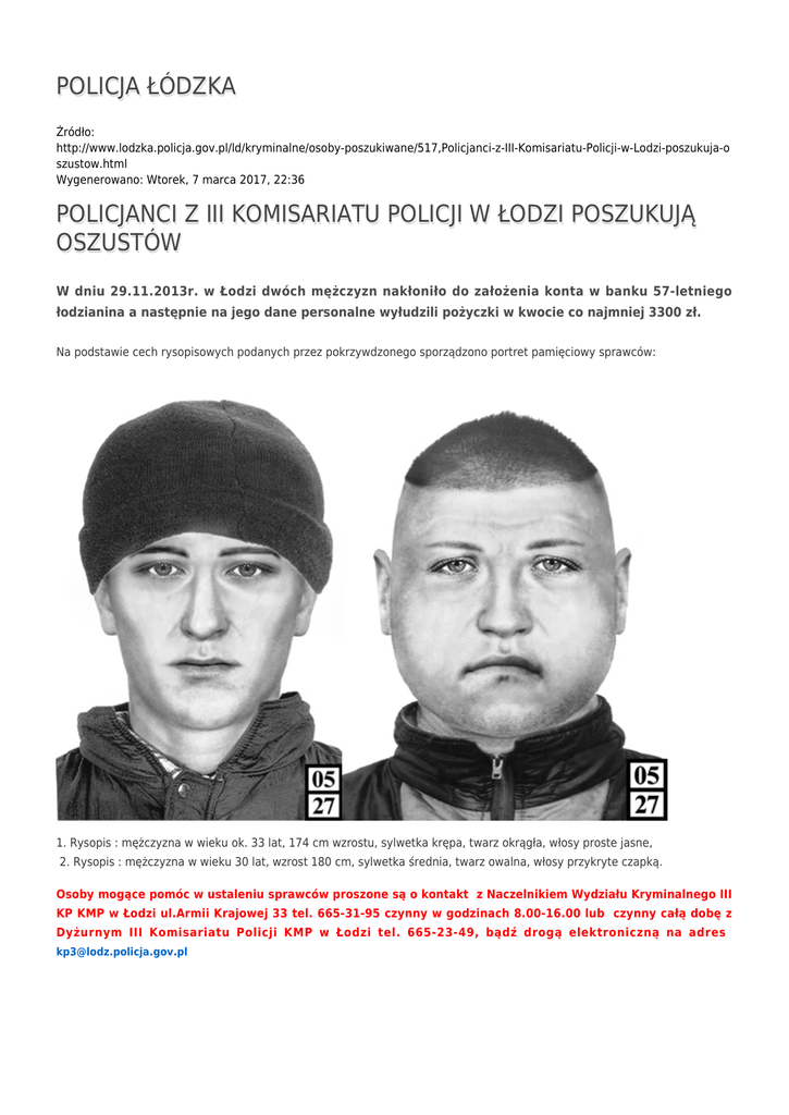POLICJA ŁÓDZKA Źródło: http://www.lodzka.policja.gov.pl/ld/kryminalne/osoby-poszukiwane/517,Policjanci-z-III-Komisariatu-Policji-w-Lodzi-poszukuja-o szustow.html Wygenerowano: Wtorek, 7 marca 2017, 22:36 POLICJANCI Z III KOMISARIATU POLICJI W ŁODZI POSZUKUJĄ OSZUSTÓW W dniu 29.11.2013r. w Łodzi dwóch mężczyzn nakłoniło do założenia konta w banku 57-letniego łodzianina a następnie na jego dane personalne wyłudzili pożyczki w kwocie co najmniej 3300 zł. Na podstawie cech rysopisowych podanych przez pokrzywdzonego sporządzono portret pamięciowy sprawców: 1. Rysopis : mężczyzna w wieku ok. 33 lat, 174 cm wzrostu, sylwetka krępa, twarz okrągła, włosy proste jasne, 2. Rysopis : mężczyzna w wieku 30 lat, wzrost 180 cm, sylwetka średnia, twarz owalna, włosy przykryte czapką. Osoby mogące pomóc w ustaleniu sprawców proszone są o kontakt z Naczelnikiem Wydziału Kryminalnego III KP KMP w Łodzi ul.Armii Krajowej 33 tel. 665-31-95 czynny w godzinach 8.00-16.00 lub czynny całą dobę z Dyżurnym III Komisariatu Policji KMP w Łodzi tel. 665-23-49, bądź drogą elektroniczną na adres [email protected] Ocena: 0/5 (0) Tweetnij