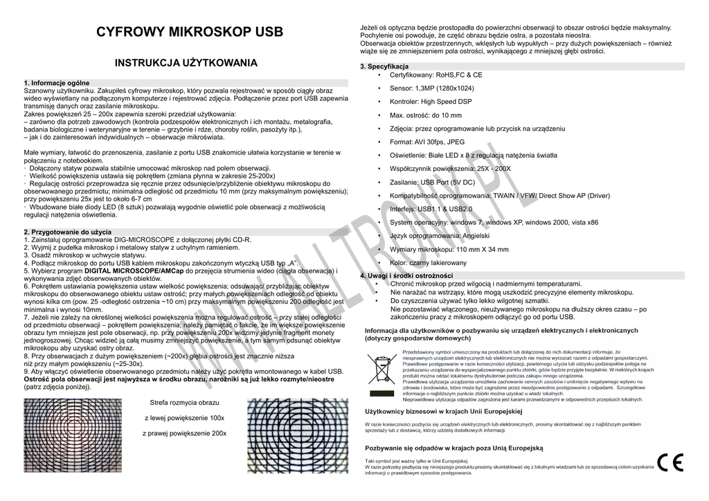 Jeżeli oś optyczna będzie prostopadła do powierzchni obserwacji to obszar ostrości będzie maksymalny. Pochylenie osi powoduje, że część obrazu będzie ostra, a pozostała nieostra. Obserwacja obiektów przestrzennych, wklęsłych lub wypukłych – przy dużych powiększeniach – również wiąże się ze zmniejszeniem pola ostrości, wynikającego z mniejszej głębi ostrości. CYFROWY MIKROSKOP USB INSTRUKCJA UŻYTKOWANIA 3. Specyfikacja • Certyfikowany: RoHS,FC & CE 1. Informacje ogólne Szanowny użytkowniku. Zakupiłeś cyfrowy mikroskop, który pozwala rejestrować w sposób ciągły obraz wideo wyświetlany na podłączonym komputerze i rejestrować zdjęcia. Podłączenie przez port USB zapewnia transmisję danych oraz zasilanie mikroskopu. Zakres powiększeń 25 – 200x zapewnia szeroki przedział użytkowania: – zarówno dla potrzeb zawodowych (kontrola podzespołów elektronicznych i ich montażu, metalografia, badania biologiczne i weterynaryjne w terenie – grzybnie i rdze, choroby roślin, pasożyty itp.), – jak i do zainteresowań indywidualnych – obserwacje mikroświata. Małe wymiary, łatwość do przenoszenia, zasilanie z portu USB znakomicie ułatwia korzystanie w terenie w połączeniu z notebookiem. · Dołączony statyw pozwala stabilnie umocować mikroskop nad polem obserwacji. · Wielkość powiększenia ustawia się pokrętłem (zmiana płynna w zakresie 25-200x) · Regulację ostrości przeprowadza się ręcznie przez odsunięcie/przybliżenie obiektywu mikroskopu do obserwowanego przedmiotu; minimalna odległość od przedmiotu 10 mm (przy maksymalnym powiększeniu); przy powiększeniu 25x jest to około 6-7 cm · Wbudowane białe diody LED (8 sztuk) pozwalają wygodnie oświetlić pole obserwacji z możliwością regulacji natężenia oświetlenia. A . W W Strefa rozmycia obrazu z lewej powiększenie 100x z prawej powiększenie 200x Sensor: 1,3MP (1280x1024) • Kontroler: High Speed DSP • Max. ostrość: do 10 mm • Zdjęcia: przez oprogramowanie lub przycisk na urządzeniu • Format: AVI 30fps, JPEG • Oświetlenie: Białe LED x 8 z regulacją natężenia światła • Współczynnik powiększenia: 25X - 200X • Zasilanie: USB Port (5V DC) • Kompatybilność oprogramowania: TWAIN / VFW/ Direct Show AP (Driver) L P . IN X O R LL T 2. Przygotowanie do użycia 1. Zainstaluj oprogramowanie DIG-MICROSCOPE z dołączonej płytki CD-R. 2. Wyjmij z pudełka mikroskop i metalowy statyw z uchylnym ramieniem. 3. Osadź mikroskop w uchwycie statywu. 4. Podłącz mikroskop do portu USB kablem mikroskopu zakończonym wtyczką USB typ „A”. 5. Wybierz program DIGITAL MICROSCOPE/AMCap do przejęcia strumienia wideo (ciągła obserwacja) i wykonywania zdjęć obserwowanych obiektów. 6. Pokrętłem ustawiania powiększenia ustaw wielkość powiększenia; odsuwając/ przybliżając obiektyw mikroskopu do obserwowanego obiektu ustaw ostrość; przy małych powiększeniach odległość od obiektu wynosi kilka cm (pow. 25 -odległość ostrzenia ~10 cm) przy maksymalnym powiększeniu 200 odległość jest minimalna i wynosi 10mm. 7. Jeżeli nie zależy na określonej wielkości powiększenia można regulować ostrość – przy stałej odległości od przedmiotu obserwacji – pokrętłem powiększenia; należy pamiętać o fakcie, że im większe powiększenie obrazu tym mniejsze jest pole obserwacji, np. przy powiększeniu 200x widzimy jedynie fragment monety jednogroszowej. Chcąc widzieć ją całą musimy zmniejszyć powiększenie, a tym samym odsunąć obiektyw mikroskopu aby uzyskać ostry obraz. 8. Przy obserwacjach z dużym powiększeniem (~200x) głębia ostrości jest znacznie niższa niż przy małym powiększeniu (~25-30x). 9. Aby włączyć oświetlenie obserwowanego przedmiotu należy użyć pokrętła wmontowanego w kabel USB. Ostrość pola obserwacji jest najwyższa w środku obrazu, narożniki są już lekko rozmyte/nieostre (patrz zdjęcia poniżej). W • • Interfejs: USB1.1 & USB2.0 • System operacyjny: windows 7, windows XP, windows 2000, vista x86 • Język oprogramowania: Angielski • Wymiary mikroskopu: 110 mm X 34 mm • Kolor: czarny lakierowany 4. Uwagi i środki ostrożności • Chronić mikroskop przed wilgocią i nadmiernymi temperaturami. • Nie narażać na wstrząsy, które mogą uszkodzić precyzyjne elementy mikroskopu. • Do czyszczenia używać tylko lekko wilgotnej szmatki. Nie pozostawiać włączonego, nieużywanego mikroskopu na dłuższy okres czasu – po zakończeniu pracy z mikroskopem odłączyć go od portu USB. A. DODATEK – Opis programu AmCap 1. File Set Capture File Ustawienie nazwy zapisywanego pliku wideo Alocate File Space Wskazanie foldera do zapisu pliku wideo Save Captured Video Zapis przechwyconej sekwencji wideo jako pliku w formacie *.avi Exit Zakończenie programu AMCAP Parametry strumienia: · Rozmiar klatki w pikselach · Szybkość klatek · Przestrzeń kolorów L P . IN X 2. Devices Model PC Camera jako urządzenie przechwytywania obrazu: DIGITAL MICROSCOPE Wybór urządzeń audio do rejestracji: A . W W 3. Options Preview włączony podgląd Audio Capture Filter Ustawienia parametrów sygnału audio Video Capture Filter Ustawienia parametrów wideo – Regulacja kamery, wybór filtrów graficznych, tworzenie ramek Video Capture Pin… Tryb ustawienia parametrów strumienia: Rozdzielczość, szybkość klatek, przestrzeń kolorów O R LL T W 4. Capture Start Capture Rozpoczęcie przechwytywania wideo Stop Capture Zakończenie przechwytywania wideo Capture audio Przechwytywanie audio – włącz/wyłącz Master Stream Wskazanie podstawowego strumienia Set frame rate Określenie szybkości klatek Set time Limit Możliwość określenia limitu czasu przechwytywania