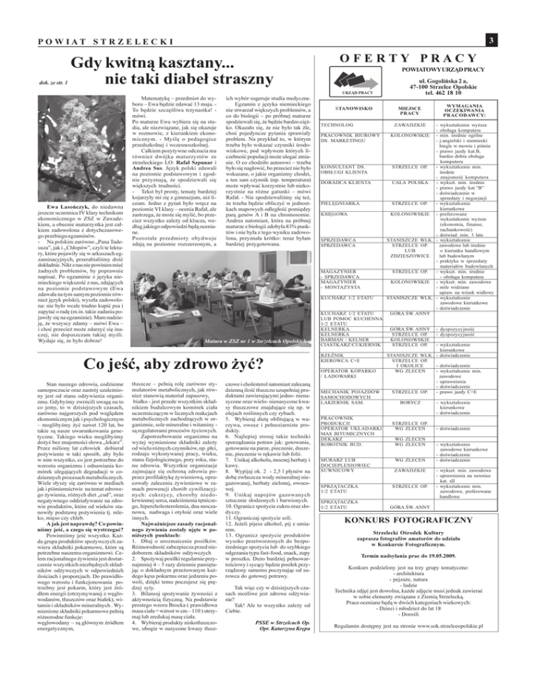 3 POWIAT STR Z E LE C K I dok. ze str. 1 Gdy kwitn¹ kasztany... nie taki diabe³ straszny Ewa Lasoñczyk, do niedawna jeszcze uczennica IV klasy technikum ekonomicznego w ZSZ w Zawadzkiem, a obecnie maturzystka jest ca³kiem zadowolona z dotychczasowego przebiegu egzaminów. - Na polskim zarówno Pana Tadeusza, jak i Ch³opów, czyli te lektury, które pojawi³y siê w arkuszach egzaminacyjnych, przerabialimy doæ dok³adnie. Nikt z nas nie powinien mieæ ¿adnych problemów, by poprawnie napisaæ. Po egzaminie z jêzyka niemieckiego wiêkszoæ z nas, zdaj¹cych na poziomie podstawowym (Ewa zdawa³a na tym samym poziomie równie¿ jêzyk polski), wysz³a zadowolona: nie by³o wcale trudno kupiæ psa i zapytaæ o radê (m.in. takie zadania pojawi³y siê na egzaminie). Mam nadziejê, ¿e wszyscy zdamy mówi Ewa i choæ przecie¿ mo¿e zdarzyæ siê inaczej, nie dopuszczam takiej myli. Wydaje siê, ¿e by³o dobrze! Matematykê przedmiot do wyboru Ewa bêdzie zdawaæ 13 maja. To bêdzie szczêliwa trzynastka! mówi. Po maturze Ewa wybiera siê na studia, ale niezwi¹zane, jak siê okazuje w rozmowie, z kierunkiem ekonomicznym. - Mylê o pedagogice przedszkolnej i wczesnoszkolnej. Ca³kiem pozytywne odczucia ma równie¿ dwójka maturzystów ze strzeleckiego LO: Rafa³ Szpunar i Andrea Sus. Jêzyk polski zdawali na poziomie podstawowym i zgodnie przyznaj¹, ¿e spodziewali siê wiêkszych trudnoci. - Tekst by³ prosty, tematy bardziej kojarzy³y mi siê z gimnazjum, ni¿ liceum. Jedno z pytañ by³o wrêcz na poziomie VI klasy ocenia Rafa³, ale zastrzega, ¿e mo¿e siê myliæ, bo przecie¿ wszystko zale¿y od klucza, wed³ug jakiego odpowiedzi bêd¹ oceniane. Pozosta³e przedmioty obydwoje zdaj¹ na poziomie rozszerzonym, a ich wybór sugeruje studia medyczne. Egzamin z jêzyka niemieckiego nie stwarza³ wiêkszych problemów, a co do biologii po próbnej maturze spodziewali siê, ¿e bêdzie bardzo ciê¿ko. Okaza³o siê, ¿e nie by³o tak le, choæ pojedyncze pytania sprawia³y problem. Na przyk³ad to, w którym trzeba by³o wskazaæ czynniki rodowiskowe, pod wp³ywem których liczebnoæ populacji mo¿e ulegaæ zmianie. O co chodzi³o autorowi trzeba by³o siê nag³owiæ, bo przecie¿ nie by³o wskazane, o jakie organizmy chodzi, a ten sam czynnik (np. temperatura) mo¿e wp³ywaæ korzystnie lub niekorzystnie na ró¿ne gatunki mówi Rafa³. - Nie spodziewalimy siê te¿, ¿e trzeba bêdzie obliczyæ w jednostkach mapowych odleg³oæ pomiêdzy par¹ genów A i B na chromosomie. Andrea natomiast, która na próbnej maturze z biologii zdoby³a 83% punktów i nie by³a z tego wyniku zadowolona, przyzna³a krótko: teraz by³am bardziej przygotowana. POWIATOWY URZ¥D PRACY ul. Gogoliñska 2 a, 47-100 Strzelce Opolskie tel. 462 18 10 STANOWISKO TECHNOLOG PRACOWNIK BIUROWY DS. MARKETINGU KONSULTANT DS. OBS£UGI KLIENTA DORADCA KLIENTA PIELÊGNIARKA KSIÊGOWA SPRZEDAWCA SPRZEDAWCA KUCHARZ 1/2 ETATU Matura w ZSZ nr 1 w Strzelcach Opolskich t³uszcze pe³ni¹ rolê zarówno stymulatorów metabolicznych, jak równie¿ stanowi¹ materia³ zapasowy, bia³ko - jest przede wszystkim sk³adnikiem budulcowym komórek cia³a uczestnicz¹cym w licznych reakcjach metabolicznych zachodz¹cych w organizmie, sole mineralne i witaminy s¹ regulatorami procesów ¿yciowych. Zapotrzebowanie organizmu na wy¿ej wymienione sk³adniki zale¿y od wielu ró¿nych czynników, np. p³ci, rodzaju wykonywanej pracy, wieku, stanu fizjologicznego, pory roku, stanu zdrowia. Wszystkie organizacje zajmuj¹ce siê ochron¹ zdrowia poprzez profilaktykê ¿ywieniow¹, opracowa³y zalecenia ¿ywieniowe w ramach prewencji chorób cywilizacyjnych: cukrzycy, choroby niedokrwiennej serca, nadcinienia têtniczego, hipercholesterolemia, dna moczanowa, nadwaga i oty³oæ oraz wiele innych. Najwa¿niejsze zasady racjonalnego ¿ywienia zosta³y ujête w poni¿szych punktach: 1. Dbaj o urozmaicenie posi³ków. Ró¿norodnoæ zabezpiecza przed niedoborem sk³adników od¿ywczych 2. Spo¿ywaj posi³ki regularnie przynajmniej 4 5 razy dziennie pamiêtaj¹c o dok³adnym prze¿uwanym ka¿dego kêsa pokarmu oraz jedzeniu powoli, dziêki temu poczujesz siê prêdzej syty. 3. Bilansuj spo¿ywanie ¿ywnoci z aktywnoci¹ fizyczn¹. Na podstawie prostego wzoru Brocka ( prawid³owa masa cia³a = wzrost w cm 110 ) utrzymaj lub zredukuj masê cia³a. 4. Wybieraj produkty niskot³uszczowe, ubogie w nasycone kwasy t³usz- czowe i cholesterol natomiast zalecan¹ dzienn¹ iloæ t³uszczu uzupe³niaj produktami zawieraj¹cymi jedno- nienasycone oraz wielo- nienasycone kwasy t³uszczowe znajduj¹ce siê np. w olejach rolinnych czy rybach. 5. Wybieraj dietê obfituj¹c¹ w warzywa, owoce i pe³noziarniste produkty. 6. Najlepiej stosuj takie techniki sporz¹dzania potraw jak: gotowanie, gotowanie na parze, pieczenie, duszenie, pieczenie w rêkawie lub folii. 7. Unikaj alkoholu, mocnej herbaty i kawy. 8. Wypijaj ok. 2 - 2,5 l p³ynów na dobê zw³aszcza wody mineralnej niegazowanej, herbaty zielonej, owocowej. 9. Unikaj napojów gazowanych sztucznie s³odzonych i barwionych. 10. Ogranicz spo¿ycie cukru oraz s³odyczy. 11. Ograniczaj spo¿ycie soli. 12. Je¿eli pijesz alkohol, pij z umiarem. 13. Ogranicz spo¿ycie produktów wysoko przetworzonych do bezporedniego spo¿ycia lub do szybkiego odgrzania typu fast-food, snack, zupy w proszku. Du¿o bardziej pe³nowartociowy i syc¹cy bêdzie posi³ek przyrz¹dzony samemu poczynaj¹c od surowca do gotowej potrawy. Tak wiêc czy w dzisiejszych czasach mo¿liwe jest zdrowe od¿ywianie? Tak! Ale to wszystko zale¿y od Ciebie. PSSE w Strzelcach Op. Opr. Katarzyna Krêpa KUCHARZ 1/2 ETATU LUB POMOC KUCHENNA 1/2 ETATU KELNERKA KELNERKA BARMAN / KELNER CIASTKARZ/CUKIERNIK RZENIK KIEROWCA C+E OPERATOR KOPARKO / £ADOWARKI MECHANIK POJAZDÓW SAMOCHODOWYCH LAKIERNIK SAM. PRACOWNIK PRODUKCJI OPERATOR UK£ADARKI MAS BITUMICZNYCH DEKARZ ROBOTNIK BUD. MURARZ LUB DOCIEPLENIOWIEC SUWNICOWY SPRZ¥TACZKA 1/2 ETATU SPRZ¥TACZKA 1