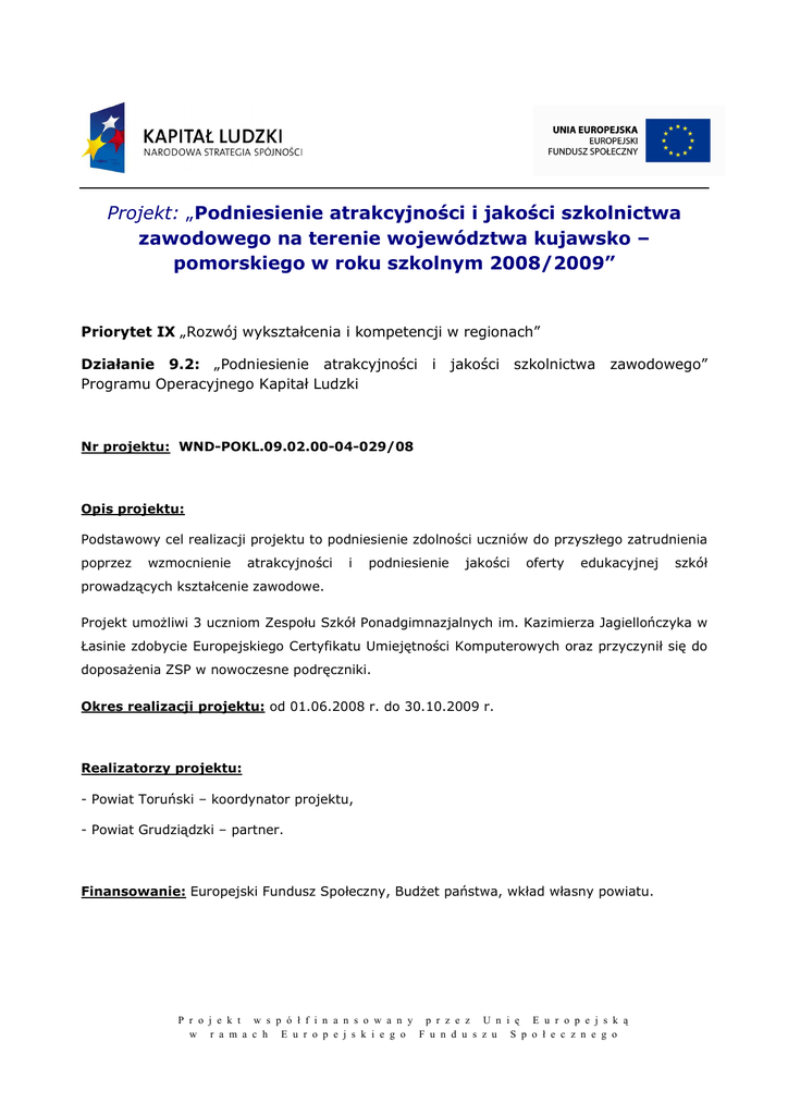 Projekt: „Podniesienie atrakcyjności i jakości szkolnictwa zawodowego na terenie województwa kujawsko – pomorskiego w roku szkolnym 2008/2009” Priorytet IX „Rozwój wykształcenia i kompetencji w regionach” Działanie 9.2: „Podniesienie atrakcyjności Programu Operacyjnego Kapitał Ludzki i jakości szkolnictwa zawodowego” Nr projektu: WND-POKL.09.02.00-04-029/08 Opis projektu: Podstawowy cel realizacji projektu to podniesienie zdolności uczniów do przyszłego zatrudnienia poprzez wzmocnienie atrakcyjności i podniesienie jakości oferty edukacyjnej szkół prowadzących kształcenie zawodowe. Projekt umoŜliwi 3 uczniom Zespołu Szkół Ponadgimnazjalnych im. Kazimierza Jagiellończyka w Łasinie zdobycie Europejskiego Certyfikatu Umiejętności Komputerowych oraz przyczynił się do doposaŜenia ZSP w nowoczesne podręczniki. Okres realizacji projektu: od 01.06.2008 r. do 30.10.2009 r. Realizatorzy projektu: - Powiat Toruński – koordynator projektu, - Powiat Grudziądzki – partner. Finansowanie: Europejski Fundusz Społeczny, BudŜet państwa, wkład własny powiatu. P r o j e k t w s p ó ł f i n a n s o w a n y p r z e z U n i ę E u r o p e j s k ą w r a m a c h E u r o p e j s k i e g o F u n d u s z u S p o ł e c z n e g o