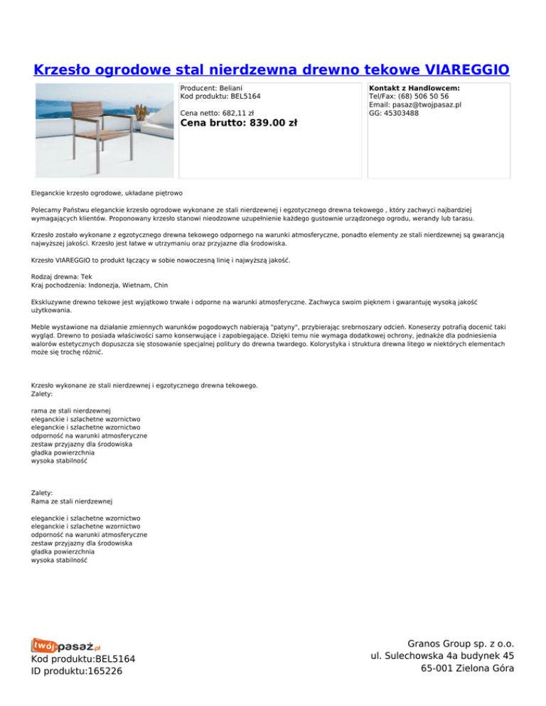 Krzesło ogrodowe stal nierdzewna drewno tekowe VIAREGGIO Producent: Beliani Kod produktu: BEL5164 Cena netto: 682,11 zł Kontakt z Handlowcem: Tel/Fax: (68) 506 50 56 Email: [email protected] GG: 45303488 Cena brutto: 839.00 zł Eleganckie krzesło ogrodowe, układane piętrowo Polecamy Państwu eleganckie krzesło ogrodowe wykonane ze stali nierdzewnej i egzotycznego drewna tekowego , który zachwyci najbardziej wymagających klientów. Proponowany krzesło stanowi nieodzowne uzupełnienie każdego gustownie urządzonego ogrodu, werandy lub tarasu. Krzesło zostało wykonane z egzotycznego drewna tekowego odpornego na warunki atmosferyczne, ponadto elementy ze stali nierdzewnej są gwarancją najwyższej jakości. Krzesło jest łatwe w utrzymaniu oraz przyjazne dla środowiska. Krzesło VIAREGGIO to produkt łączący w sobie nowoczesną linię i najwyższą jakość. Rodzaj drewna: Tek Kraj pochodzenia: Indonezja, Wietnam, Chin Ekskluzywne drewno tekowe jest wyjątkowo trwałe i odporne na warunki atmosferyczne. Zachwyca swoim pięknem i gwarantuję wysoką jakość użytkowania. Meble wystawione na działanie zmiennych warunków pogodowych nabierają "patyny", przybierając srebrnoszary odcień. Koneserzy potrafią docenić taki wygląd. Drewno to posiada właściwości samo konserwujące i zapobiegające. Dzięki temu nie wymaga dodatkowej ochrony, jednakże dla podniesienia walorów estetycznych dopuszcza się stosowanie specjalnej politury do drewna twardego. Kolorystyka i struktura drewna litego w niektórych elementach może się trochę różnić. Krzesło wykonane ze stali nierdzewnej i egzotycznego drewna tekowego. Zalety: rama ze stali nierdzewnej eleganckie i szlachetne wzornictwo eleganckie i szlachetne wzornictwo odporność na warunki atmosferyczne zestaw przyjazny dla środowiska gładka powierzchnia wysoka stabilność Zalety: Rama ze stali nierdzewnej eleganckie i szlachetne wzornictwo eleganckie i szlachetne wzornictwo odporność na warunki atmosferyczne zestaw przyjazny dla środowiska gładka powierzchnia wysoka stabilność Kod produktu:BEL5164 ID produktu:165226 Granos Group sp. z o.o. ul. Sulechowska 4a budynek 45 65-001 Zielona Góra