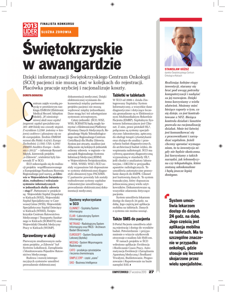 F I N A L I S TA KO N K U R S U S ŁU Ż B A Z D R O W I A Świętokrzyskie w awangardzie Dzięki informatyzacji Świętokrzyskiego Centrum Onkologii (ŚCO) pacjenci nie muszą stać w kolejkach do rejestracji. Placówka pracuje szybciej i racjonalizuje koszty. DOROTA BOGUCKA C entrum zajęło wysoką pozycję w prestiżowym rankingu EMRAM (Elektronic Medical Record Adoption Model). „W ośmiostopniowej skali nasz szpital (segment: szpital specjalistyczny 301–400 łóżek) ma czwarty stopień. Z wynikiem 5,2260 jesteśmy w krajowej czołówce i plasujemy się na tle europejskim. Średnia EMRAM wynosi dla Polski: 0,4243; Europy Zachodniej: 2,1502; USA: 4,2841 (HiMSS Analitics Europe – badania z 2012)” – informuje Ryszard Mężyk, kierownik projektu „e-Zdrowie”, wieloletni były kierownik IT w ŚCO. ŚCO zobowiązało się do realizacji projektu współfinansowanego z Europejskiego Funduszu Rozwoju Regionalnego pod nazwą „e-Zdrowie w Województwie Świętokrzyskim, rozbudowa i wdrażanie systemów informatycznych w jednostkach służby zdrowia – etap I”. Partnerami w projekcie są: Wojewódzki Szpital Zespolony w Kielcach (WSZ), Wojewódzki Szpital Specjalistyczny w Czerwonej Górze (WSS), Wojewódzki Specjalistyczny Szpital Dziecięcy w Kielcach (WSSD), Świętokrzyskie Centrum Ratownictwa Medycznego i Transportu Sanitarnego w Kielcach (ŚCRMiTS) oraz Wojewódzki Ośrodek Medycyny Pracy w Kielcach (WOMP). Sprawdzony w akcji Pierwszym zrealizowanym zadaniem projektu „e-Zdrowie” był Systemu Lokalizacji, Zarządzania i Monitorowania Pojazdów Ratownictwa Medycznego. Budowa i rozwój interoperacyjnych systemów umożliwi prowadzenie elektronicznej dokumentacji medycznej. Dzięki elektronicznej wymianie dokumentacji między partnerami projektu pacjenci nie muszą wędrować między jednostkami. Dane mogą być też udostępniane systemom zewnętrznym. Cztery jednostki (ŚCO, WSZ, WSS, ŚCRMiTS) będą mogły korzystać z Elektronicznej Platformy Wymiany Danych Medycznych, Regionalnego Węzła Teleradiologicznego oraz Regionalnego Centrum Certyfikacji dla Służby Zdrowia. System jest otwarty, możliwe jest dołączanie się kolejnych jednostek ochrony zdrowia w regionie – to zaczątek Regionalnego Systemu Informacji Medycznej (RSIM) w Województwie Świętokrzyskim. WSS, WSSD, WSZ i ŚCO zostały wyposażone lub doposażone w systemy elektronicznej diagnostyki obrazowej typu PACS/RIS. U partnerów powstały lub zostały rozbudowane systemy szpitalne i laboratoryjne umożliwiające prowadzenie elektronicznej dokumentacji medycznej. Tabletki w tabletach CLININET – Szpitalny System Informacyjny W ŚCO od 2006 r. działa Zintegrowany Szpitalny System Informatyczny, a wszystkie dane diagnostyczne i dotyczące leczenia gromadzone są w Elektronicznym Multimedialnym Rekordzie Pacjenta (EMRP). Szpitalnym Systemem Informacyjnym jest Clinnet. Z nim, przez protokół HL7, połączone są systemy specjalistyczne: laboratoryjny, apteczny, do obsługi terapii cytostatykami oraz służące do analizy i przesyłania badań diagnostycznych, do archiwizacji badań wideo, do wspierania radioterapii. ŚCO ma cyfrową aparaturę diagnostyczną wyposażoną w standardy HL7, jeśli chodzi o analizatory laboratoryjne, i DICOM w przypadku aparatów radiologicznych. To umożliwia automatyczne przesyłanie danych do EMPR. Clinnet jest hurtownią danych. To system transakcyjny, który dopuszcza jednoczesną pracę wielu użytkowników. Dokumentowane są wszystkie zdarzenia dotyczące pacjenta. System umożliwia lekarzom dostęp do danych 24 godz. na dobę. Jego częścią jest aplikacja mobilna na tabletach. Danych z systemu nie można usunąć. ELAB – Laboratoryjny System Informacyjny Także SMS do pacjenta Systemy wykorzystane w ŚCO NETRAAD – Radiologiczny System Informacyjny oraz PACS – Archiwum Badań Obrazowych EUROSOFT – System Gospodarki Lekowej (Apteka) MOZAIQ – System Wspomagania Radioterapii CATO - produkcja cytostatyków i leczenia chemioterapią SIMPLE.ERP - część „szara” SAS - Business Intelligence E-Portal Pacjenta umożliwia zdalną rejestrację i dostęp do wyników badań. Potwierdzenie i przypomnienie o wizycie użytkownik otrzymuje e-mailem lub SMS-em. W ramach projektu w ŚCO wdrożono aplikacje: Ewidencja i Rozliczanie Czasu Pracy, Automatyzacja Ewidencji i Zarządzania Aparaturą Medyczną i Środkami Trwałymi, Budżetowanie, Prognozowanie i Raportowanie na bazie narzędzi SAS. COMPUTERWORLD 27 września 2013 27 STANISŁAW GÓŹDŹ dyrektor Świętokrzyskiego Centrum Onkologii w Kielcach Realizując kolejne etapy inwestycji, staramy się brać pod uwagę potrzeby komputeryzacji i nadążać za jej rozwojem. Dzięki temu korzystamy z wielu ułatwień. Możemy mieć bieżące raporty o tym, co się dzieje, co jest kontraktowane z NFZ. Bieżąca kontrola działań i kosztów pozwala na racjonalizację działań. Mnie też łatwiej jest komunikować się z pracownikami i zarządzać szpitalem. Jeżeli chcemy sprostać wymaganiom, to ta inwestycja nigdy nie będzie skończona. Już korzystamy z takich narzędzi, jak telemedycyna czy telepatologia, które zostaną udoskonalone i będą jeszcze lepiej dostępne. System umożliwia lekarzom dostęp do danych 24 godz. na dobę. Jego częścią jest aplikacja mobilna na tabletach. Ma to szczególne znaczenie w przypadku onkologii, gdzie stosuje się leczenie skojarzone przez wielu specjalistów.