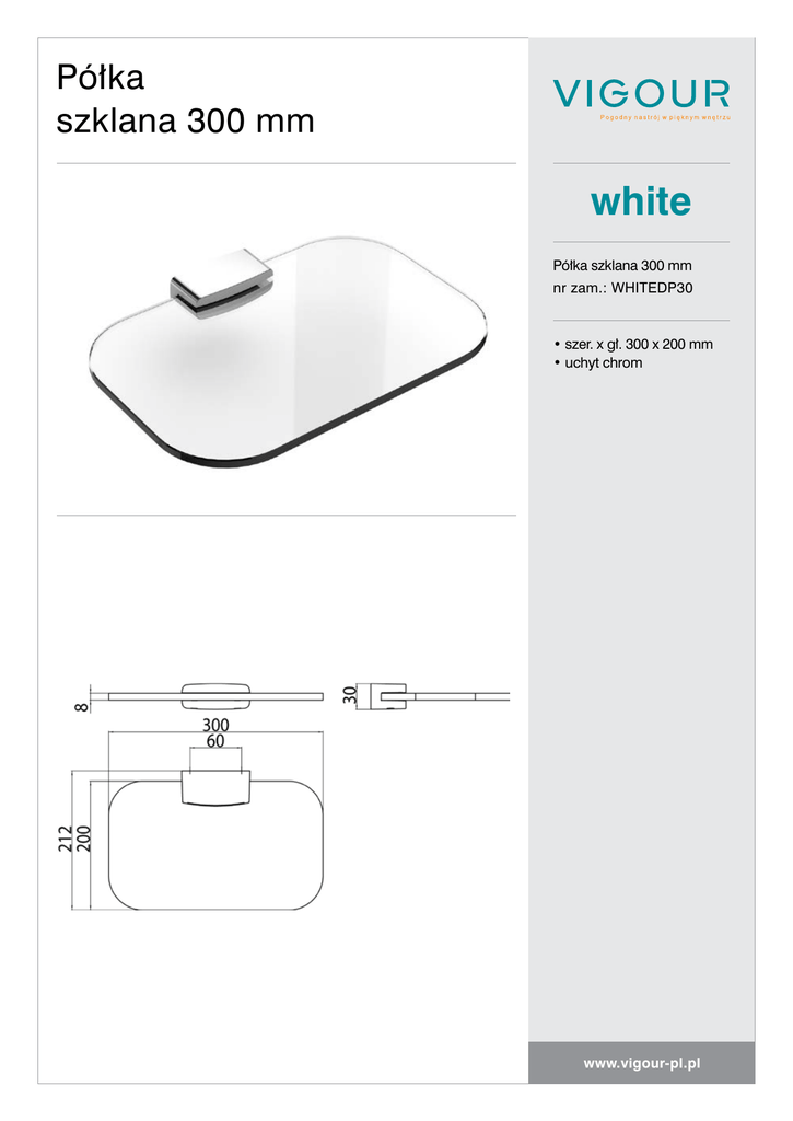 Półka szklana 300 mm white Półka szklana 300 mm nr zam.: WHITEDP30 •szer. x gł. 300 x 200 mm •uchyt chrom www.vigour-pl.pl