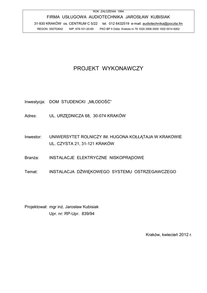 ROK ZAŁOŻENIA 1994 FIRMA USŁUGOWA AUDIOTECHNIKA JAROSŁAW KUBISIAK 31-930 KRAKÓW os. CENTRUM C 5/22 REGON: 350753642 NIP: 678-101-20-69 tel. 012 6432519 e-mail: [email protected] PKO BP II Oddz. Kraków nr 78 1020 2906 0000 1002 0014 8262 PROJEKT WYKONAWCZY Inwestycja: DOM STUDENCKI „MŁODOŚĆ” Adres: UL. URZĘDNICZA 68, 30-074 KRAKÓW Inwestor: UNIWERSYTET ROLNICZY IM. HUGONA KOŁŁĄTAJA W KRAKOWIE UL. CZYSTA 21, 31-121 KRAKÓW Branża: INSTALACJE ELEKTRYCZNE NISKOPRĄDOWE Temat: INSTALACJA DŹWIĘKOWEGO SYSTEMU OSTRZEGAWCZEGO Projektował: mgr inż. Jarosław Kubisiak Upr. nr: RP-Upr. 839/94 Kraków, kwiecień 2012 r. INSTALACJA DŹWIĘKOWEGO SYSTEMU OSTRZEGAWCZEGO Dom Studencki Młodość w Krakowie przy ul. Urzędniczej 68 ZAWARTOŚĆ OPRACOWANIA I. WSTĘP 1. Podstawa i zakres opracowania II. OPIS TECHNICZNY 1. Dźwiękowy system ostrzegawczy (DSO) 2. Instalacja 3. Dobór urządzeń 4. Zestawienie podstawowych urządzeń i materiałów III. WYKAZ RYSUNKÓW Lp. Numer: Treść rysunku: 1. 1 Rzut piwnicy. Plan instalacji. 2. 2 Rzut parteru. Plan instalacji. 3. 3 Rzut I piętra. Plan instalacji. 4. 4 Rzut II piętra. Plan instalacji. 5. 5 Rzut III piętra. Plan instalacji. 6. 6 Schemat ideowy instalacji dźwiękowego systemu ostrzegawczego IV. KLAUZULA V. ZAŁĄCZNIKI 1. Kopia uprawnień projektanta Firma Usługowa AUDIOTECHNIKA Jarosław Kubisiak Kraków kwiecień 2012 r. Strona 2 INSTALACJA DŹWIĘKOWEGO SYSTEMU OSTRZEGAWCZEGO Dom Studencki Młodość w Krakowie przy ul. Urzędniczej 68 I. WSTĘP 1. Podstawa opracowania 1.1. Podstawa prawna opracowania Zlecenie od Inwestora 1.2. Nazwa i adres Inwestycji: DOM STUDENCKI "MŁODOŚĆ", UL. URZĘDNICZA 68, 30-074 KRAKÓW 1.3. Inwestor: UNIWERSYTET ROLNICZY IM. HUGONA KOŁŁĄTAJA W KRAKOWIE, UL. CZYSTA 21, 31-121 KRAKÓW 1.4. Jednostka projektująca Firma Usługowa AUDIOTECHNIKA Jarosław Kubisiak 31-930 Kraków os. Centrum C 5/22 tel. 012 6432519, faks. 012 3504347, kom. +48 698419327 1.5. Podstawy techniczne opracowania: • Inwentaryzacja w zakresie architektury obiektu • uzgodnienia z Użytkownikiem i Inwestorem obiektu • inwentaryzacja własna do celów projektowych • Prawo Budowlane z dn. 23-03-2003r DzU Nr 80 poz. 718 z późniejszymi zmianami • Rozporządzenie Ministra Infrastruktury z dn. 12-04-2002r. DzU Nr 75 poz. 690 "W sprawie warunków technicznych, jakim powinny odpowiadać budynki i ich usytuowanie" z późniejszymi zmianami • Rozporządzenie MSWiA z dn.07-06-2010r. DzU Nr 109 poz. 719 "W sprawie ochrony przeciwpożarowej budynków, innych obiektów budowlanych i terenów" • Rozporządzenie Ministra Spraw Wewnętrznych i Administracji z dnia 20 czerwca 2007 r. w sprawie wykazu wyrobów służących zapewnieniu bezpieczeństwa publicznego lub ochronie zdrowia i życia oraz mienia, a także zasad wydawania dopuszczenia tych wyrobów do użytkowania Dz.U. 2007 nr 143 poz. 1002 • PN-EN 60849:2001 „Dźwiękowe systemy ostrzegawcze” • wytyczne projektowania dźwiękowych systemów ostrzegawczych CNBOP • PKN-CEN/TS 54-14 : 2006 "Systemy sygnalizacji pożarowej. Część 14: Wytyczne projektowania, instalowania, odbioru, eksploatacji i konserwacji." • PN-T-06800 Sygnały: Wizyjny i foniczny • PN-IEC 574-2 Urządzenia i systemy audiowizualne, wizyjne i telewizyjne • właściwe normy krajowe dotyczące instalacji elektrycznych • właściwe normy branżowe i zalecenia dotyczące instalacji teletechnicznych • katalogi urządzeń i materiałów 1.6. Zakres opracowania Opracowanie zawiera projekt wykonawczy instalacji dźwiękowego systemu ostrzegawczego (DSO) dla budynku Domu Studenckiego Młodość w Krakowie przy ul. Urzędniczej 68 Firma Usługowa AUDIOTECHNIKA Jarosław Kubisiak Kraków kwiecień 2012 r. Strona 3 INSTALACJA DŹWIĘKOWEGO SYSTEMU OSTRZEGAWCZEGO Dom Studencki Młodość w Krakowie przy ul. Urzędniczej 68 II OPIS TECHNICZNY 2.1 Dźwiękowy system ostrzegawczy Budynek Domu Studenckiego Młodość w Krakowie przy ul. Urzędniczej 68 jest budynkiem niskim, podpiwniczonym. W obiekcie jest 121 pokojów głównie 2-osobowych. Budynek jest wykonany z cegły, posiada cztery kondygnacje naziemne (parter, Ip, IIp, IIIp) oraz piwnicę. Powierzchnia rzutu poziomego kondygnacji wynosi około 840 m2. Budynek posiada dwie klatki schodowe wydzielone pożarowo. Cały budynek stanowi jedną strefę pożarową. Obiekt wyposażony jest w sprawną instalację sygnalizacji pożarowej opartą na systemie firmy Cooper Lighting & Security Ltd z centralką DF-6000. Centralka sygnalizacji pożarowej (CSP) zlokalizowana jest w portierni budynku na parterze przy wejściu głównym. Zgodnie z decyzją Inwestora, dla Domu Studenckiego Młodość w Krakowie przy ul. Urzędniczej 68 zaprojektowany będzie dźwiękowy system ostrzegawczy (DSO). DSO umożliwia rozgłaszanie sygnałów ostrzegawczych i komunikatów bezpieczeństwa do osób przebywających w budynku. Komunikaty te nadawane są automatycznie po otrzymaniu sygnału z systemu sygnalizacji pożarowej (SAP) lub przez uprawnionego operatora. Komunikaty podawane z „mikrofonu strażaka” posiadają wyższy priorytet od zapowiedzi automatycznych. Po wystąpieniu zweryfikowanego kryterium alarmu pożarowego następuje emisja automatycznych komunikatów w sposób ciągły do czasu przejęcia kierownictwa akcją przez osobę uprawnioną lub zaniku kryterium alarmu. Po zaniku kryterium alarmowego nadawany jest automatyczny komunikat o odwołaniu stanu zagrożenia. W oparciu o instrukcję bezpieczeństwa pożarowego dla obiektu przyjmuje się odpowiednie tryby alarmowania: • przy pracy automatycznej - w przypadku wystąpienia alarmu pożarowego na cały obiekt lub wybrane strefy pożarowe emitowane są komunikaty o zagrożeniu i poleceniu ewakuacji. Po ustąpieniu kryterium alarmowego nadawany jest komunikat o odwołaniu stanu zagrożenia. • przy pracy z nadzorem osoby uprawnionej – oprócz trybu automatycznego, istnieje możliwość nadawania dowolnyc