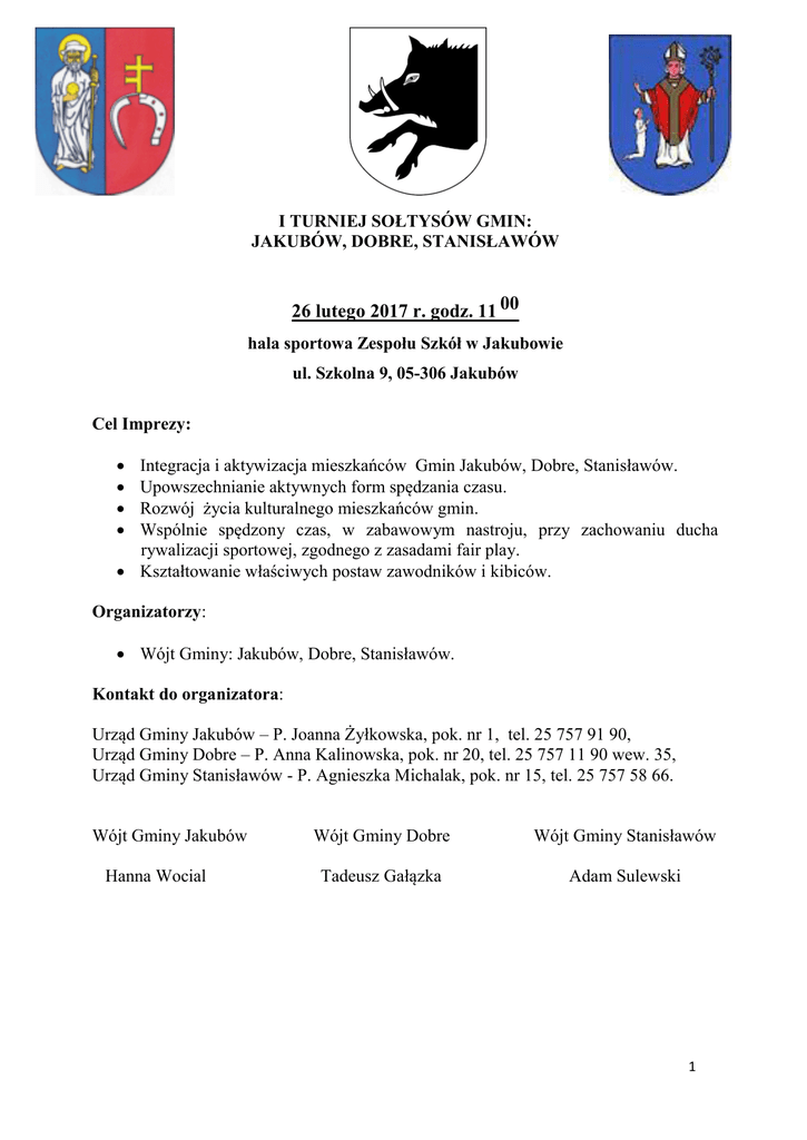 I TURNIEJ SOŁTYSÓW GMIN: JAKUBÓW, DOBRE, STANISŁAWÓW 26 lutego 2017 r. godz. 11 00 hala sportowa Zespołu Szkół w Jakubowie ul. Szkolna 9, 05-306 Jakubów Cel Imprezy: Integracja i aktywizacja mieszkańców Gmin Jakubów, Dobre, Stanisławów. Upowszechnianie aktywnych form spędzania czasu. Rozwój życia kulturalnego mieszkańców gmin. Wspólnie spędzony czas, w zabawowym nastroju, przy zachowaniu ducha rywalizacji sportowej, zgodnego z zasadami fair play. Kształtowanie właściwych postaw zawodników i kibiców. Organizatorzy: Wójt Gminy: Jakubów, Dobre, Stanisławów. Kontakt do organizatora: Urząd Gminy Jakubów – P. Joanna Żyłkowska, pok. nr 1, tel. 25 757 91 90, Urząd Gminy Dobre – P. Anna Kalinowska, pok. nr 20, tel. 25 757 11 90 wew. 35, Urząd Gminy Stanisławów - P. Agnieszka Michalak, pok. nr 15, tel. 25 757 58 66. Wójt Gminy Jakubów Hanna Wocial Wójt Gminy Dobre Wójt Gminy Stanisławów Tadeusz Gałązka Adam Sulewski 1 REGULAMIN TURNIEJU SOŁTYSÓW GMIN JAKUBÓW, DOBRE, STANISŁAWÓW POSTANOWIENIA OGÓLNE § 1. Niniejszy regulamin określa warunki, na jakich odbywa się Turniej Sołtysów Gmin Jakubów, Dobre, Stanisławów, ogłoszony we wszystkich sołectwach z terenu trzech gmin oraz na stronie internetowej: www.jakubow.pl, www.gminadobre.pl, www. stanislawow.pl, zwany dalej Konkursem. § 2. 1. Organizatorem Konkursu jest Wójt Gminy: Jakubów, Dobre, Stanisławów. 2. Turniej Sołtysów Gmin odbędzie s i ę 26 lutego 2017 roku na hali sportowej Zespołu Szkół w Jakubowie ul. Szkolna 10, 05-306 Jakubów o godz. 11.00. UCZESTNICY KONKURSU § 3. 1. Do udziału zapraszamy po jednej drużynie, składającej się z 5 sołtysów (w tym przynajmniej jedna kobieta) z poszczególnych gmin. 2. Uczestnicy biorą udział w Konkursie na własny koszt i na własną odpowiedzialność. 3. Dopuszcza się posiadanie w drużynie dwóch osób rezerwowych – 1 mężczyzny i 1 kobiety. WARUNKI KONKURSU § 4. 1. Kapitan drużyny wyłoniony spośród sołtysów zobowiązany jest przesłać do 17 lutego 2017 roku formularz zgłoszeniowy do Konkursu na adres: Urząd Gminy Jakubów, ul. Mińska 15, 05-306 Jakubów lub zgłosić drużynę osobiście w Urzędzie Gminy Jakubów pok. nr 1, tel. (25) 757 91 90. 2. Formularz zgłoszeniowy stanowi załącznik do niniejszego Regulaminu. § 5. Uczestnik Konkursu, oświadcza, ze wyraża zgodę: na przetwarzanie i udostępnianie swoich danych osobowych oraz wykonywanie i wykorzystywanie przez Organizatora zdjęć wykonanych w czasie trwania Konkursu. 2 § 6. 1. Przed rozpoczęciem Konkursu kapitanowie drużyn wylosują numery, które określą kolejność startową drużyn. 2. Dla zawodników obowiązuje obuwie i strój sportowy. KONKURENCJE § 7. 1. Konkurencja muzyczna Każda drużyna wykonuje 1 utwór (max. 3 zwrotki) grupowo dotyczący swojej gminy. Tytuł utworu należy podać na formularzu zgłoszeniowym. (mikrofon) 2. Konkurencje sprawnościowe: Niesienie kobiety Sołtysa w kocu Konkurencja na czas, drużyna w 5-osobowym składzie. Konkurencja polega na jak najszybszym przeniesieniu kobiety Sołtysa w kocu z linii startu do mety. Wygrywa najszybsza drużyna. (3 koce, 6 pachołków, bieg na odległość 15 m) Slalom z hula - hop Konkurencja na czas dla wszystkich członków drużyny. Polega na toczeniu hula-hop między rozstawionymi pachołkami, pierwszy startujący toczy hula-hop do pachołka końcowego, tam przekazuje hula-hop kolejnej osobie, która musi go toczyć z powrotem, również slalomem. Slalom wykonują wszyscy członkowie drużyny. Wygrywa najszybsza drużyna. (3 hula-hop, 3x 5 pachołków, 3 stopery, bieg na odległość 15 m) Skoki na skakance w gumowcach Konkurencja dla jednego członka drużyny, czas max. 3 minuty, wygrywa ten, kto więcej razy skoczy przez skakankę bez skuchy. (3 skakanki, 3 pary kaloszy) Konkurencja odbijania paletką piłeczki do ping-ponga Konkurencja dla wszystkich członków drużyny. Jedna osoba odbija paletką piłeczkę do skuchy i przekazuje paletkę kolejnej osobie, konkurencję wykonują wszyscy z drużyny, (max. 1 minutę każdy) wygrywa ta drużyna, która ma na koncie najwięcej odbić piłeczką. (3 paletki i 3 piłeczki) 3 . K o n k ur e nc j e r o z r y w kow e : Jedzenie pączków na czas Konkurencja dla jednego członka drużyny. Konkurencja polega na zjedzeniu jak największej liczby pączków w czasie 3 minut. Wygrywa ten, kto zje więcej pączków. 3 (pączki, 3 stoliki i krzesełka, 3 tace i 3 talerzyki) Picie soku z butelki ze smoczkiem Konkurencja dla jednego członka drużyny. Konkurencja polega na wypiciu soku z butelki niemowlęcej ze smoczkiem na czas. Wygrywa ten kto wypije sok w jak najkrótszym czasie. (3 butelki ze smoczkiem, sok) 4. Konkurencja dodatkowa Zbieranie podatku na czas Konkurencja specjalnie dla sołtysów. Jeden sołtys z drużyny otrzyma określoną ilość pieniędzy, którą musi przeliczyć i podać komisji w jak najkrótszym czasie. (bardzo drobne monety) Wszystkie rekwizyty, niezbędne do wykonania konkurencji zapewnia organizator. KRYTERIA OCENY § 8. 1. Przebieg konkursu oceni komisja sędziowska, powołana przez Organizatora. Komisja będzie też rozstrzygała wszystkie sprawy związane z przebiegiem konkurencji. 3. Ocena Komisji jest jawna, widoczna dla publiczności i ostateczna. § 9. 1.Punkty za poszczególne konkurencje przyznawane będą wg następujących kategorii: wszystkie konkurencje sprawnościowe: I miejsce – 5 pkt, II miejsce – 4 pkt, III miejsce - 3 pkt, punktacja za konkurencję muzyczną 1-5 pkt (ocena wliczana do punktacji ogólnej), konkurencje rozrywkowe: I miejsce – 5 pkt, II miejsce – 4 pkt, III miejsce - 3 pkt, konkurencja dodatkowa: I miejsce – 5 pkt, II miejsce – 4 pkt, III miejsce - 3 pkt. 2. Zwycięzcą turnieju zostaje drużyna, która po zakończeniu wszystkich konkurencji uzyska największą liczbę punktów. 3. W przypadku jednakowej liczby punktów zwycięzca będzie wyłoniony w dodatkowe