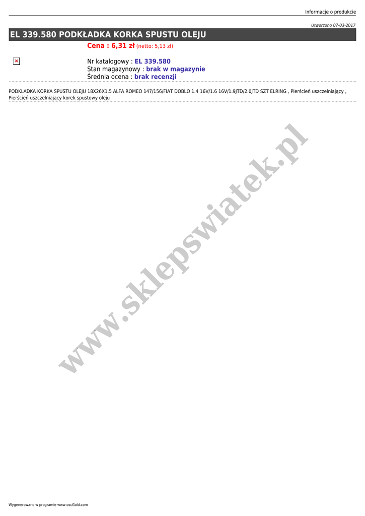 Informacje o produkcie Utworzono 07-03-2017 EL 339.580 PODKŁADKA KORKA SPUSTU OLEJU Cena : 6,31 zł (netto: 5,13 zł) Nr katalogowy : EL 339.580 Stan magazynowy : brak w magazynie Średnia ocena : brak recenzji w w w .s kl ep sw ia te k. pl PODKLADKA KORKA SPUSTU OLEJU 18X26X1.5 ALFA ROMEO 147/156/FIAT DOBLO 1.4 16V/1.6 16V/1.9JTD/2.0JTD SZT ELRING , Pierścień uszczelniający , Pierścień uszczelniający korek spustowy oleju Wygenerowano w programie www.oscGold.com