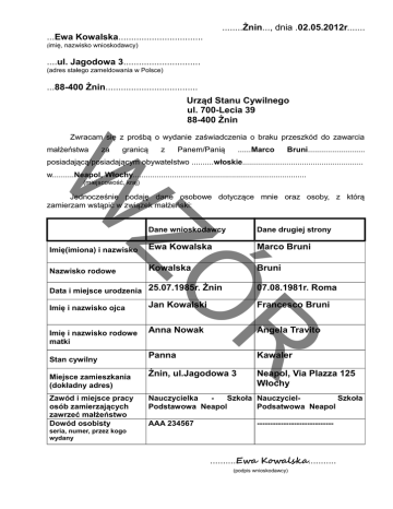 ........Żnin..., dnia .02.05.2012r....... ...Ewa Kowalska................................. (imię, nazwisko wnioskodawcy) ....ul. Jagodowa 3.............................. (adres stałego zameldowania w Polsce) ...88-400 Żnin.................................... Urząd Stanu Cywilnego ul. 700-Lecia 39 88-400 Żnin Zwracam się z prośbą o wydanie zaświadczenia o braku przeszkód do zawarcia małżeństwa za granicą z Panem/Panią ......Marco Bruni.......................... posiadającą/posiadającym obywatelstwo ..........włoskie....................................................... W w..........Neapol, Włochy............................................................................... (miejscowość, kraj) Jednocześnie podaję dane osobowe dotyczące mnie oraz osoby, z którą zamierzam wstąpić w związek małżeński: Dane drugiej strony Imię(imiona) i nazwisko Ewa Kowalska Marco Bruni Nazwisko rodowe Kowalska Bruni ZÓ Dane wnioskodawcy Data i miejsce urodzenia 25.07.1985r. Żnin Imię i nazwisko ojca Stan cywilny Miejsce zamieszkania (dokładny adres) Zawód i miejsce pracy osób zamierzających zawrzeć małżeństwo Dowód osobisty Jan Kowalski Francesco Bruni Anna Nowak Angela Travito Panna R Imię i nazwisko rodowe matki 07.08.1981r. Roma Kawaler Żnin, ul.Jagodowa 3 Neapol, Via Plazza 125 Włochy Nauczycielka Szkoła NauczycielSzkoła Podstawowa Neapol Podsatwowa Neapol AAA 234567 ----------------------------- seria, numer, przez kogo wydany ..........Ewa Kowalska........... (podpis wnioskodawcy)