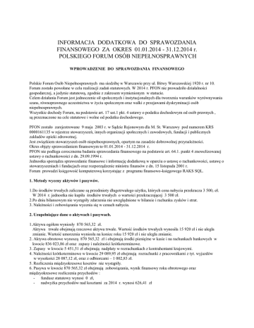INFORMACJA DODATKOWA DO SPRAWOZDANIA FINANSOWEGO ZA OKRES 01.01.2014 - 31.12.2014 r. POLSKIEGO FORUM OSÓB NIEPEŁNOSPRAWNYCH WPROWADZENIE DO SPRAWOZDANIA FINANSOWEGO Polskie Forum Osób Niepełnosprawnych ma siedzibę w Warszawie przy ul. Bitwy Warszawskiej 1920 r. nr 10. Forum zostało powołane w celu realizacji zadań statutowych. W 2014 r. PFON nie prowadziło działalności gospodarczej, a jedynie statutową, zgodnie z zakresem wymienionym w statucie. Celem działania Forum jest jednoczenie sił społecznych i instytucjonalnych dla tworzenia warunków wyrównywania szans, równoprawnego uczestnictwa w życiu społecznym oraz walki z przejawami dyskryminacji osób niepełnosprawnych. Wszystkie dochody Forum, na podstawie art. 17 ust.1 pkt. 4 ustawy o podatku dochodowym od osób prawnych , są przeznaczone na cele statutowe i wolne od podatku dochodowego. PFON zostało zarejestrowane 9 maja 2003 r. w Sądzie Rejonowym dla M. St. Warszawy pod numerem KRS 0000161135 w rejestrze stowarzyszeń, innych organizacji społecznych i zawodowych, fundacji i publicznych zakładów opieki zdrowotnej. Jest związkiem stowarzyszeń osób niepełnosprawnych, opartym na zasadzie dobrowolnej przynależności. Okres objęty sprawozdaniem finansowym to 01.01.2014 - 31.12.2014 r. PFON nie podlega corocznemu badaniu sprawozdania finansowego na podstawie art. 64.1. punkt 4 znowelizowanej ustawy o rachunkowości z dn. 29.09.1994 r. Jednostka sporządza sprawozdanie finansowe i informację dodatkową w oparciu o ustawę o rachunkowości, ustawę o stowarzyszeniach i fundacjach oraz rozporządzenie ministra finansów z dn. 15 listopada 2001 r. Forum prowadzi księgowość komputerową korzystając z programu finansowo-księgowego RAKS SQL. 1. Metody wyceny aktywów i pasywów. 1.Do środków trwałych zaliczane są przedmioty długotrwałego użytku, których cena nabycia przekracza 3 500,-zł. W 2014 r. jednostka nie kupiła środków trwałych o wartości przekraczającej 3 500 zł. 2.Po dniu bilansowym nie wystąpiły zdarzenia nie uwzględnione w bilansie i rachunku zysków i strat. 3. Należności i zobowiązania wycenia się w cenach nabycia. 2. Uzupełniające dane o aktywach i pasywach. 1.Aktywa ogółem wyniosły 870 565,32 zł. Aktywa trwałe obejmują rzeczowe aktywa trwałe. Wartość środków trwałych wynosiła 15 920 zł i nie uległa zmianie. Wartość umorzenia wyniosła na koniec roku 15 920 zł i nie uległa zmianie. 2. Aktywa obrotowe wynoszą 870 565,32 zł i obejmują środki pieniężne w kasie i na rachunkach bankowych w kwocie 836 023,86 zł oraz zapasy i należności krótkoterminowe. 3. Zapasy w kwocie 5 451,51 zł obejmują nadpłaty w rozrachunkach z kontrahentami krajowymi. 4. Należności krótkoterminowe w kwocie 29 089,95 zł obejmują rozrachunki z pracownikami z tyt. wyjazdów w wysokości 28 087,12 zł, oraz z odbiorcami – 1 002,83 zł. 5. Rozliczenia międzyokresowe kosztów nie wystąpiły. 6. Pasywa w kwocie 870 565,32 zł obejmują zobowiązania, wynik finansowy roku obrotowego oraz międzyokresowe rozliczenia przychodów : - fundusz statutowy wynosi 0 zł, - nadwyżka przychodów nad kosztami za 2014 r. wynosi 626,41 zł 7. Zobowiązania krótkoterminowe w kwocie 2 775,88 zł obejmują zobowiązania z tyt. zaliczek, dostaw i usług w kwocie 2 091,60 zł, ZUS – 236,54 zł PIT-4 – 18 zł oraz wynagrodzeń – 429,74 zł. 8. Rozliczenia międzyokresowe przychodów w kwocie 867 163,03 zł obejmują: - przychody przyszłych okresów z tyt. realizowanych projektów – 848 597,91zł - nadwyżkę przychodów nad kosztami z lat ubiegłych – 18 565,12 zł 3. Struktura zrealizowanych przychodów. Przychody razem 3 701 858,93 w tym: 1/ dotacje 3 667 607,42 w tym: - środki w ramach projektu „Trener Pracy jako sposób na zwiększenie zatrudnienia ON” 3 604 816,29 - środki w ramach projektu „Publikacja Życie w integracji. Stargardzki model (…)” 51 400,00 - środki w ramach projektu „Nowe perspektywy dialogu: model deliberacji (…)” 11 475,00 - zwrot środków w ramach projektu „Opracowanie modelu lokalnego systemu rehabilitacji (…)” -83,87 2/ pozostałe przychody (darowizny, składki, refundacje, 1 % podatku ) 34 251,51 4. Struktura kosztów. Koszty razem 3 701 232,52 w tym: 1/ koszty zadań statutowych 3 667 684,99 w tym: - koszty projektu „Trener Pracy jako sposób na zwiększenie zatrudnienia ON” 3 561 597,90 - koszty projektu „Publikacja Życie w integracji. Stargardzki model (…)” 51 394,05 - koszty projektu „Nowe perspektywy dialogu: model deliberacji (…)” 11 475,00 - koszty projektu „Rekomendacje dla włączającej edukacji wyższej i zawodowej (…)” 43 218,04 2/ koszty działalności operacyjnej, w tym - zużycie materiałów (pieczątki) - usługi obce, w tym: remont lokalu usługi księgowe prowizje bankowe usługi informatyczne pozostałe: transport, naprawy, oznakowanie lok. - podatki i opłaty (składka EDF, opłaty skarbowe) - badania lekarskie pracowników - pozostałe koszty - podróże służbowe (EDF), ubezp. 3/ koszty finansowe (odsetki) 33 543,65 94,00 23 755,85 20 970,60 1 149,49 450,10 182,04 1 003,62 4 376,80 373,00 4 944,00 3,88 Nadwyżka przychodów nad kosztami w 2014 r. wynosi 626,41 zł. 5. Dane o zmianach i sposobie wykorzystania funduszu statutowego w roku obrotowym Fundusz statutowy w 2014 nie uległ zmianie. Stan funduszu statutowego na dzień 31.12.2014 r. 0 zł 6. Dane dot. udzielonych gwarancji, poręczeń i innych zobowiązań związanych z działalnością statutową. Polskie Forum Osób Niepełnosprawnych nie udzielało gwarancji i poręczeń w 2014 r. 7. Tendencja zmian w przychodach i kosztach oraz składnikach majątku i źródłach jej finansowania. Jednostka posiada w tej chwili składniki majątkowe w postaci środków trwałych o wartości 15 920 zł. W 2014 roku Forum pozyskiwało przychody z tytułu otrzymanych dotacji celowych na wykonanie zadań zleconych z PFRON, zgodnie z zawartym