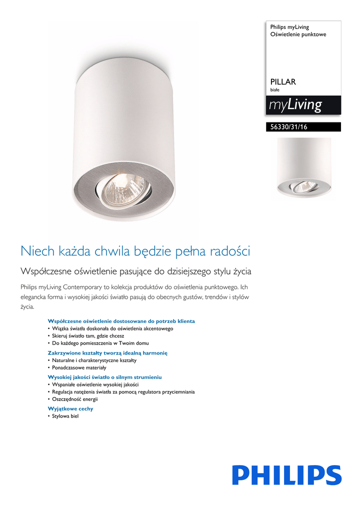 Philips myLiving Oświetlenie punktowe PILLAR białe myLiving 56330/31/16 Niech każda chwila będzie pełna radości Współczesne oświetlenie pasujące do dzisiejszego stylu życia Philips myLiving Contemporary to kolekcja produktów do oświetlenia punktowego. Ich elegancka forma i wysokiej jakości światło pasują do obecnych gustów, trendów i stylów życia. Współczesne oświetlenie dostosowane do potrzeb klienta • Wiązka światła doskonała do oświetlenia akcentowego • Skieruj światło tam, gdzie chcesz • Do każdego pomieszczenia w Twoim domu Zakrzywione kształty tworzą idealną harmonię • Naturalne i charakterystyczne kształty • Ponadczasowe materiały Wysokiej jakości światło o silnym strumieniu • Wspaniałe oświetlenie wysokiej jakości • Regulacja natężenia światła za pomocą regulatora przyciemniania • Oszczędność energii Wyjątkowe cechy • Stylowa biel 563303116 Oświetlenie punktowe PILLAR białe Zalety Oświetlenie akcentowe Ten reflektor punktowy firmy Philips zapewnia wiązkę światła doskonałą do oświetlenia akcentowego i podkreśla każdy element wystroju wnętrza. Naturalne i charakterystyczne kształty Łagodne krawędzie i zakrzywione linie to cechy charakterystyczne dla ponadczasowych produktów z kolekcji Philips myLiving. Reflektory punktowe myLiving są praktyczne, a jednocześnie eleganckie i subtelne — doskonale komponują się z każdym współczesnym wnętrzem. Ponadczasowe materiały Zastosowanie metalu i szkła nadaje pomieszczeniu neutralny i elegancki wygląd. Solidne, proste materiały są zgodne z duchem współczesności. Wspaniałe oświetlenie wysokiej jakości Skieruj światło tam, gdzie chcesz Możliwość przyciemniania Ta lampa firmy Philips jest wyposażona w funkcję regulacji natężenia światła za pomocą regulatora przyciemniania (niedołączony do zestawu). Dzięki temu można podkreślić element wystroju lub stworzyć idealną atmosferę na każdą okazję — niezależnie od tego, czy chodzi o romantyczną kolację we dwoje czy o relaks z rodziną i przyjaciółmi w salonie. Oszczędność energii Ten reflektor punktowy Philips myLiving zapewnia pełną kontrolę nad oświetleniem domu. Jest elastyczny i można go swobodnie obracać w dowolnym kierunku — umożliwia to skierowanie światła tam, gdzie jest ono najbardziej potrzebne. Do każdego pomieszczenia w Twoim domu W pełni funkcjonalny, a jednocześnie bardzo elegancki reflektor punktowy firmy Philips wniesie ozdobny akcent do każdego pomieszczenia w Twoim domu. Ekologiczne żarówki halogenowe firmy Philips oferują wyjątkowe oświetlenie umożliwiające podkreślenie niektórych elementów wystroju pomieszczenia i stworzenie przyjemnego nastroju. Jednocześnie pozwalają zaoszczędzić więcej energii niż tradycyjne żarówki halogenowe. Ta lampa firmy Philips zużywa mniej energii niż tradycyjne źródła światła, co pozwala zmniejszyć rachunki za prąd i przyczynia się do ochrony środowiska. Stylowa biel Prosta, stonowana i zawsze stylowa biel jest ponadczasowym, zachwycającym kolorem, który wnosi czystość do każdego wnętrza. 563303116 Oświetlenie punktowe PILLAR białe Dane techniczne Stylistyka i wykończenie • Materiał: metal • Kolor: biały Dodatkowe funkcje/akcesoria w zestawie • • • • Możliwość przyciemniania Żarówki halogenowe w zestawie Precyzyjne wiązki światła Reflektor z możliwością regulacji Wymiary i waga produktu • • • • Wysokość: 12 cm Długość: 10,3 cm Szerokość: 10,3 cm Waga netto: 0,958 kg • • • • • • • • • Oprawa z możliwością przyciemniania LED: Nie Wbudowane źródło światła LED: NIE Klasa energetyczna dołączonego źródła światła: D Oprawa jest zgodna ze źródłami światła klasy: C do E Współczynnik IP: IP20, ochrona przed przedmiotami powyżej 12,5 mm, brak ochrony przed wodą Klasa ochronności: II — podwójna izolacja Źródło światła odpowiadające tradycyjnej żarówce o mocy: 45 W Moc strumienia świetlnego dołączonego źródła światła w lumenach: 270 lm Serwis • Gwarancja: 2 lata Dane techniczne • • • • • • Zasilanie sieciowe: Przedział 220–240 V, 50–60 Hz Technologia źródła światła: halogen, 230 V Liczba źródeł światła: 1 Trzonek: GU10 Moc źródła światła w zestawie: 35 W Maksymalna moc wymiennego źródła światła: 50 W • Barwa światła: ciepła biel • Maksymalna trwałość źródła światła: 2000 godz. • Kąt rozsyłu: 40° Wymiary i waga opakowania • • • • Wysokość: 13,7 cm Długość: 12,1 cm Szerokość: 12,1 cm Waga: 1,050 kg Różne • Opracowano z myślą o: Salon i sypialnia • Styl: Nowoczesne • Typ: Oświetlenie punktowe • Data wydania 2016-01-18 © 2016 Koninklijke Philips N.V. Wszelkie prawa zastrzeżone. Wersja: 2.0.1 Dane techniczne mogą ulec zmianie bez powiadomienia. Znaki towarowe są własnością Koninklijke Philips N.V. lub własnością odpowiednich firm. 12 NC: 9150 018 08002 EAN: 87 18291 42965 4 www.philips.com