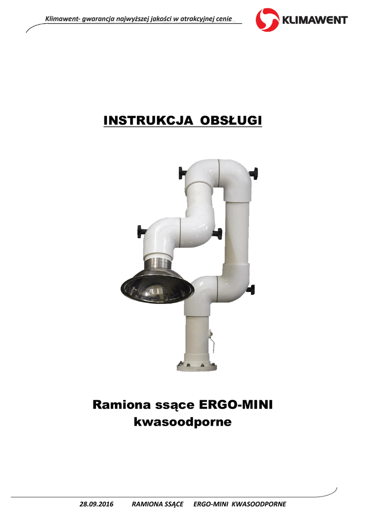 INSTRUKCJA OBSŁUGI Ramiona ssące ERGO-MINI kwasoodporne 28.09.2016 RAMIONA SSĄCE ERGO-MINI KWASOODPORNE Spis treści 1. Uwagi wstępne 2. Przeznaczenie 3. Zastrzeżenia producenta 4. Dane techniczne 5. Budowa i działanie 6. Montaż i uruchomienie 7. Użytkowanie 8. Zakłócenia w pracy, przyczyny, środki zaradcze 9. Instrukcja konserwacji 10. Instrukcja BHP 11. Transport i przechowywanie 12. Warunki gwarancji 2 28.09.2016 RAMIONA SSĄCE ERGO-MINI KWASOODPORNE 1. UWAGI WSTĘPNE Niniejsza instrukcja jest przeznaczona dla przyszłego użytkownika ramion ssących ERGO-MINI. Jej celem jest dostarczenie wskazówek odnośnie zastosowania, uruchamiania i eksploatacji ramion ERGO-MINI. Przed przystąpieniem do użytkowania ramion należy dokładnie zapoznać się z treścią instrukcji. W razie stwierdzenia wadliwej pracy ramion lub usterek, których nie można usunąć we własnym zakresie, należy zwrócić się z zapytaniem do producenta lub jego przedstawiciela. Ze względu na ciągłość prac prowadzonych przy doskonaleniu naszych wyrobów, zastrzegamy sobie możliwość zmian konstrukcyjnych podwyższających walory użytkowe. Konstrukcja urządzenia filtrowentylacyjnego ERGO-MINI odpowiada wymaganiom aktualnego poziomu techniki oraz zapewnienia bezpieczeństwa i zdrowia zawartych w: ● Dyrektywie 2006/42/WE Parlamentu Europejskiego i Rady z dnia17 maja 2006 r. w sprawie maszyn zmieniającej dyrektywę 95/16/WE (przekształcenie)/Dz. Urz. UE L157 z dn. 09.06.2006, str. 24/ Rozporządzenie Ministra Gospodarki z dnia 21 października 2008 r. w sprawie wymagań dla maszyn (Dz. U. Nr 199 z 2008 r. poz. 1228) Spełnia wymagania następujących norm zharmonizowanych: ● PN-EN ISO-12100:2012 Bezpieczeństwo maszyn – Ogólne zasady projektowania – Ocena ryzyka i zmniejszanie ryzyka 2. PRZEZNACZENIE Kwasoodporne ramiona ssące ERGO-MINI przeznaczone są do usuwania zanieczyszczeń pyłowych i gazowych, gdzie występuje emisja niewielkich ilości zanieczyszczeń. Ramiona mają zastosowanie m.in. w przemyśle chemicznym, farmaceutycznym, elektronicznym, złotniczo-jubilerskim. Ramię może współpracować z odpowiednim wentylatorem wyciągowym obsługującym sieć, do której można podłączyć od kilka do kilkudziesięciu ramion. Samonastawne przeguby cierne i obrotowa głowica mocująca pozwalają na dowolne usytuowanie ramienia na stanowisku pracy. Elementy ramienia wykonano z materiałów kwasoodpornych (PCV, poliamid, stal nierdzewna). Ramona ssące ERGO-MINI produkowane są w wersjach różniących się: ● średnicą ramion ● zasięgiem ● ilością przegubów 28.09.2016 RAMIONA SSĄCE ERGO-MINI KWASOODPORNE 3 3. ZASTRZEŻENIA PRODUCENTA 1. Producent nie ponosi odpowiedzialności za skutki wynikające z niezgodnego z przeznaczeniem użytkowania urządzenia. 2. Niedopuszczalne jest instalowanie na urządzeniu dodatkowych elementów niewchodzących w jego skład lub wyposażenie. 3. Niedopuszczalne są samowolne przeróbki lub modyfikacje urządzenia. 4. Należy chronić ramiona przed uszkodzeniami mechanicznymi. 4. DANE TECHNICZNE Dane techniczne dla wszystkich wersji ramion ERGO-MINI podane są w załączniku „Rysunek wymiarowy”. 5. BUDOWA I DZIAŁANIE przegub cierny ssawka skośna rura nastawna ssawka przepustnica uchwyt zaciskowy głowica obrotowa Rys.1 Budowa Ramię ssące ERGO-MINI składa się z następujących elementów: - głowicy obrotowej z rurą obrotową - dwóch lub trzech rur nastawnych - przegubów kolanowych z regulacją momentu tarcia - uchwytu zaciskowego (na życzenie) - ssawek wymiennych (na życzenie) Rura głowicy obrotowej jest zaopatrzona w przepustnicę i może wykonywać pełny obrót wokół osi pionowej. Ramię można mocować w następujący sposób: 1. Bezpośrednio do blatu stołu. 2. Przy użyciu uchwytu zaciskowego mocowanego do blatu stołu lub ściany. Połączone przegubami ciernymi elementy rurowe wraz ze ssawką i głowicą obrotową tworzą kanał wentylacyjny, poprzez który następuje odsysanie zapylonego powietrza. Konfigurację tego ramienia można zmieniać w zasięgu konkretnego typu ramienia. Dodatkową możliwość regulacji zasysanego powietrza daje zainstalowana przepustnica. 4 28.09.2016 RAMIONA SSĄCE ERGO-MINI KWASOODPORNE 6. MONTAŻ I URUCHAMIANIE Ramiona ssące ERGO-MINI możemy konfigurować w dowolny sposób w zależności od potrzeb. Montujemy bezpośrednio do blatu – służy do tego 6 otworów w kołnierzu głowicy obrotowej. W razie potrzeby montujemy przy krawędzi blatu lub przy ścianie wykorzystując przy tym uchwyt zaciskowy. Wówczas kołnierz przykręcamy do uchwytu zaciskowego. Ramię zamocować zgodnie z rys.2 (pozycja „dobrze”). Ssawkę ustawić w odległości takiej, by nie utrudniała pracy i skutecznie odsysała dymy. Dźwignią przepustnicy wyregulować ilość zasysanego powietrza tak, aby skutecznie likwidować zadymienie lub zapylenie bez zbędnego przeciągu. Rys.2 7. UŻYTKOWANIE Konstrukcja urządzenia pozwala na bezawaryjną i bezpieczną pracę bez specjalnych zabiegów. W każdym z przegubów ramienia zabudowany jest pierścień cierny, którego zadaniem jest utrzymywanie urządzenia we właściwej pozycji podczas pracy. Dokręcenie nakrętek radełkowanych zwiększa moment tarcia, a poluzowanie ich powoduje zmniejszenie tego momentu. Regulację hamulców w poszczególnych przegubach należy przeprowadzić tak, aby z jednej strony zapewnić samohamowność urządzenia, (co jest istotne dla utrzymania właściwej pozycji podczas pracy), a z drugiej strony nie spowodować nadmiernych oporów ruchu podczas zmiany tego położenia. Podczas pracy wielokrotnie można zmieniać położenie ssawki ramienia ssącego i przepustnicy, każdorazowo dostosowując je do aktualnych potrzeb użytkownika. Po zakończonej pracy należy wyłączyć wentylator wyciągowy lub, jeśli urządzenie współpracuje ze stacjonarną instalacją wyciągową, zamknąć przepustnicę na ssawce. 28.09.2016 RAMIONA SSĄ