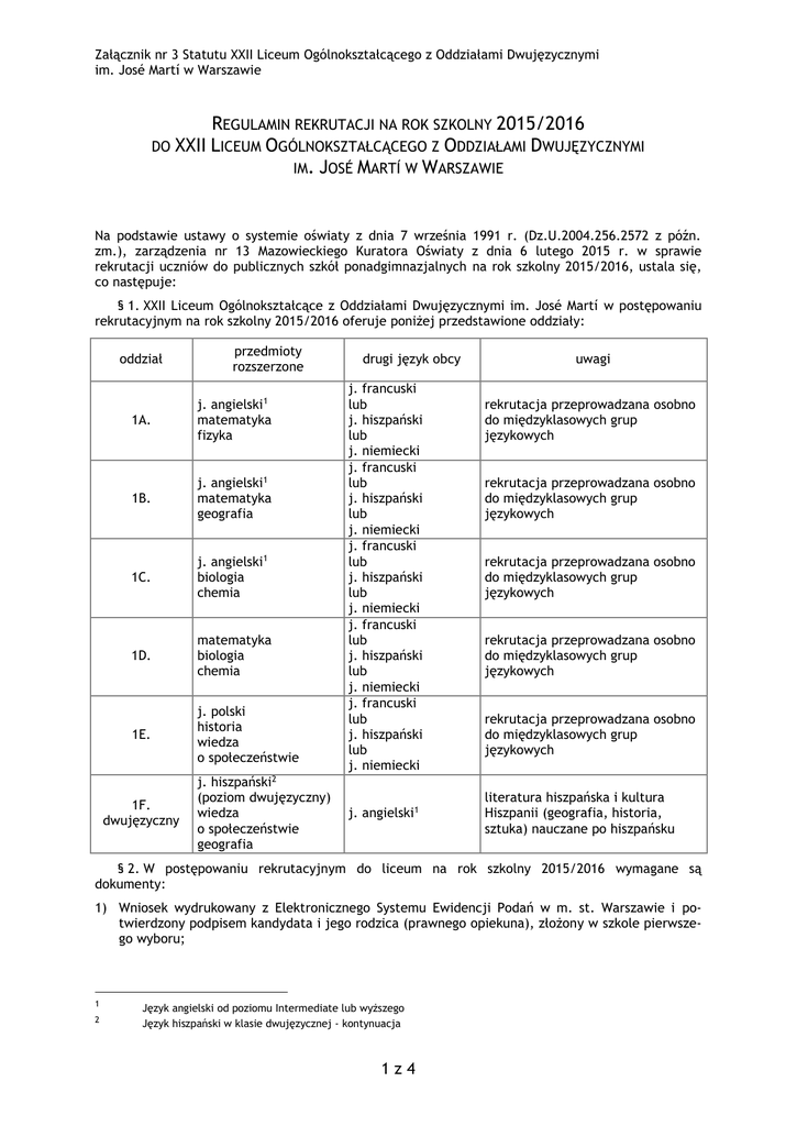 Załącznik nr 3 Statutu XXII Liceum Ogólnokształcącego z Oddziałami Dwujęzycznymi im. José Martí w Warszawie REGULAMIN REKRUTACJI NA ROK SZKOLNY 2015/2016 DO XXII LICEUM OGÓLNOKSZTAŁCĄCEGO Z ODDZIAŁAMI DWUJĘZYCZNYMI IM. JOSÉ MARTÍ W WARSZAWIE Na podstawie ustawy o systemie oświaty z dnia 7 września 1991 r. (Dz.U.2004.256.2572 z późn. zm.), zarządzenia nr 13 Mazowieckiego Kuratora Oświaty z dnia 6 lutego 2015 r. w sprawie rekrutacji uczniów do publicznych szkół ponadgimnazjalnych na rok szkolny 2015/2016, ustala się, co następuje: § 1. XXII Liceum Ogólnokształcące z Oddziałami Dwujęzycznymi im. José Martí w postępowaniu rekrutacyjnym na rok szkolny 2015/2016 oferuje poniżej przedstawione oddziały: oddział przedmioty rozszerzone 1A. j. angielski1 matematyka fizyka 1B. j. angielski1 matematyka geografia 1C. j. angielski1 biologia chemia 1D. matematyka biologia chemia 1E. j. polski historia wiedza o społeczeństwie 1F. dwujęzyczny j. hiszpański2 (poziom dwujęzyczny) wiedza o społeczeństwie geografia drugi język obcy j. francuski lub j. hiszpański lub j. niemiecki j. francuski lub j. hiszpański lub j. niemiecki j. francuski lub j. hiszpański lub j. niemiecki j. francuski lub j. hiszpański lub j. niemiecki j. francuski lub j. hiszpański lub j. niemiecki j. angielski1 uwagi rekrutacja przeprowadzana osobno do międzyklasowych grup językowych rekrutacja przeprowadzana osobno do międzyklasowych grup językowych rekrutacja przeprowadzana osobno do międzyklasowych grup językowych rekrutacja przeprowadzana osobno do międzyklasowych grup językowych rekrutacja przeprowadzana osobno do międzyklasowych grup językowych literatura hiszpańska i kultura Hiszpanii (geografia, historia, sztuka) nauczane po hiszpańsku § 2. W postępowaniu rekrutacyjnym do liceum na rok szkolny 2015/2016 wymagane są dokumenty: 1) Wniosek wydrukowany z Elektronicznego Systemu Ewidencji Podań w m. st. Warszawie i potwierdzony podpisem kandydata i jego rodzica (prawnego opiekuna), złożony w szkole pierwszego wyboru; 1 2 Język angielski od poziomu Intermediate lub wyższego Język hiszpański w klasie dwujęzycznej - kontynuacja 1z4 2) Kopia świadectwa ukończenia gimnazjum i kopia zaświadczeń o szczegółowych wynikach egzaminu przeprowadzanego w ostatnim roku nauki w gimnazjum, poświadczone za zgodność z oryginałem przez Dyrektora gimnazjum, które kandydat ukończył, złożone w szkole pierwszego wyboru; 3) Oryginał świadectwa ukończenia gimnazjum oraz oryginał zaświadczenia o szczegółowych wynikach egzaminu przeprowadzanego w ostatnim roku nauki w gimnazjum; 4) Dwie fotografie; każda podpisana imieniem i nazwiskiem; 5) Kwestionariusz kandydata dostępny na stronie internetowej lub w sekretariacie XXII Liceum Ogólnokształcącego z Oddziałami Dwujęzycznymi im. José Martí; 6) Zaświadczenie o uzyskaniu tytułu laureata lub finalisty ogólnopolskich olimpiad przedmiotowych, tytułu laureata olimpiad dla uczniów gimnazjów z matematyki, informatyki i języka angielskiego uzyskanego w latach szkolnych 2012/2013, 2013/2014, 2014/2015 oraz finalisty ww. olimpiad uzyskanego w roku szkolnym 2014/2015 lub tytułu laureata konkursów przedmiotowych o zasięgu wojewódzkim lub ponadwojewódzkim, przeprowadzonych zgodnie z przepisami wydanymi na podstawie art. 22 ust. 2 pkt 8 ustawy o systemie oświaty z dnia 7 września 1991 r.; 7) Inne zaświadczenia konieczne do skorzystania z uprawnień przewidzianych przez regulamin. § 3. 1. Rekrutacja do szkoły jest prowadzona z wykorzystaniem Elektronicznego Systemu Ewidencji Podań w m. st. Warszawie. 2. Kandydaci do oddziałów klasy pierwszej składają w sekretariacie szkoły pierwszego wyboru wnioski wydrukowane z Elektronicznego Systemu Ewidencji Podań w m. st. Warszawie wraz z niezbędnymi kopiami zaświadczeń. 3. Szkoła przyjmuje wyłącznie wnioski podpisane przez kandydata i jego rodzica (prawnego opiekuna). 4. W trakcie rekrutacji organizowanej z wykorzystaniem Elektronicznego Systemu Ewidencji Podań w m. st. Warszawie: 1) kandydat, składając wniosek, określa pozycję swoich preferencji przyjęcia do danego oddziału; 2) każdy z kandydatów zostaje przydzielony tylko do jednego z preferowanych oddziałów lub nie zostaje przyjęty do żadnego oddziału, jeśli do żadnego ze wskazanych oddziałów nie uzyskał wystarczającej liczby punktów zapewniających mu przyjęcie; 3) jeżeli kandydat uzyskał liczbę punktów uprawniającą go do przyjęcia do większej liczby oddziałów - zostaje on przydzielony do tego i TYLKO DO TEGO oddziału, który znajduje się najwyżej na liście jego preferencji; 4) kandydat, który zostanie zakwalifikowany do przyjęcia do oddziału, nie będzie umieszczony na listach do przyjęcia do oddziałów o niższych preferencjach, choćby spełniał kryteria przyjęć do tych oddziałów; 5) kandydat ubiegający się o przyjęcie do szkoły, składając dokumenty, posługuje się kopiami świadectwa ukończenia gimnazjum i zaświadczenia o szczegółowych wynikach egzaminu przeprowadzanego w ostatnim roku nauki w gimnazjum, poświadczonymi przez Dyrektora gimnazjum, do którego uczęszczał. 5. Kandydat umieszczony na liście przyjętych do danej szkoły składa oryginały świadectwa i zaświadczenia o wynikach egzaminu przeprowadzanego w ostatnim roku nauki w gimnazjum. NIEZŁOŻENIE ORYGINAŁÓW POWODUJE SKREŚLENIE KANDYDATA Z LISTY PRZYJĘTYCH. 6. Wraz z przyjęciem do szkoły kandydat zobowiązuje się do przestrzegania Statutu XXII Liceum Ogólnokształcącego z Oddziałami Dwujęzycznymi im. José Martí w Warszawie oraz innych dokumentów regulujących działalność szkoły. § 4. 1. O przyjęcie do oddziału klasy pierwszej może ubiegać się absolwent gimnazjum. 2. O przyjęciu kandydata do oddziału klasy pierwszej decyduje uzyskana przez niego lokata na listach kandydatów do szkoły w wyniku postępowania rekrutacyjnego. 3. Laureaci i finaliści og