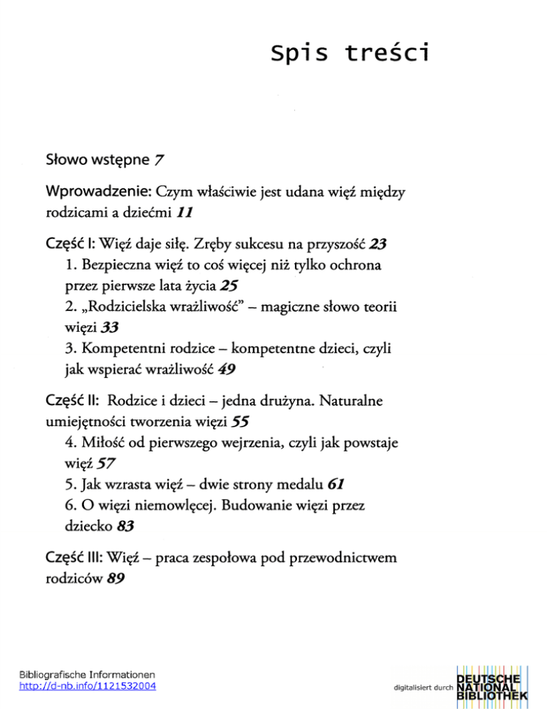 Spis t r e ś c i Słowo wstępne 7 Wprowadzenie: Czym właściwie jest udana więź między rodzicami a dziećmi 11 Część I: Więź daje siłę. Zręby sukcesu na przyszość 23 1. Bezpieczna więź to coś więcej niż tylko ochrona przez pierwsze lata życia 2 5 2. „Rodzicielska wrażliwość” - magiczne słowo teorii więzi 33 3. Kompetentni rodzice - kompetentne dzieci, czyli jak wspierać wrażliwość 49 Część II: Rodzice i dzieci - jedna drużyna. Naturalne umiejętności tworzenia więzi 5 5 4. Miłość od pierwszego wejrzenia, czyli jak powstaje więź 5 7 5. Jak wzrasta więź - dwie strony medalu 61 6. O więzi niemowlęcej. Budowanie więzi przez dziecko 83 Część III: Więź - praca zespołowa pod przewodnictwem rodziców 89 7. Przygotowanie do udanego początku więzi. Rozdział dla matek, który powinni też przeczytać ojcowie 91 8. Doula - nie tylko wsparcie dla matki 110 Część IV: Marzenie i rzeczywistość. Kiedy rodzinę dopadnie proza życia 113 9. Zdrowe dziecko = szczęśliwa matka? Marzenia i rzeczywistość 115 10. Na najwyższych obrotach, czyli dwudziestoczterogodzinny dyżur „nowoczesnej matki” 121 1 1 . 0 dzieleniu się opieką. Rozwiązania rodzinne i pozarodzinne 129 13. Nierówne szanse wcześniaków - choć niesprzyjające, to wcale nie beznadziejne 146 Podziękowania dla dzieci 157 O autorce 161 Przypisy 163