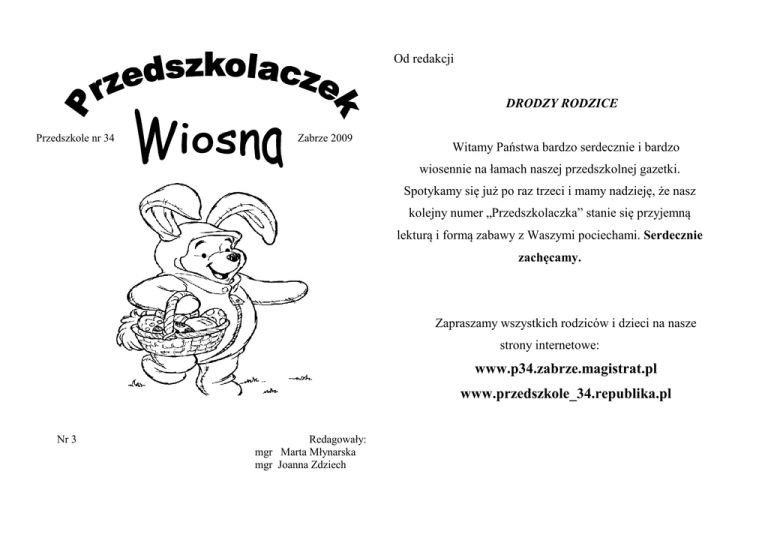Od redakcji DRODZY RODZICE Przedszkole nr 34 Zabrze 2009 Witamy Państwa bardzo serdecznie i bardzo wiosennie na łamach naszej przedszkolnej gazetki. Spotykamy się już po raz trzeci i mamy nadzieję, że nasz kolejny numer „Przedszkolaczka” stanie się przyjemną lekturą i formą zabawy z Waszymi pociechami. Serdecznie zachęcamy. Zapraszamy wszystkich rodziców i dzieci na nasze strony internetowe: www.p34.zabrze.magistrat.pl www.przedszkole_34.republika.pl Nr 3 Redagowały: mgr Marta Młynarska mgr Joanna Zdziech Pedagog radzi CZY ZWIERZĘTA POTRAFIĄ LECZYĆ………??? Kurczak* Małego kurczaka Łatwo narysować. Najpierw spłaszcz kółeczko, Na nim głowę dodaj. Dziobek jak trójkącik, Oko i skrzydełko. I już kurczak na spacerek Ma ochotę wielką Dorysuj dwie nogi Czerwone jak maki I na żółto go pomalujBędzie kurczak taki. Coraz częściej w terapii osób niepełnosprawnych wykorzystywane są zwierzęta. Powszechnie znane są takie nazwy jak: hipoterapia, dogoterapia, fellinoterapia, delfinoterapia. Zooterapia przekonuje do siebie coraz szersze grono odbiorców, zarówno wśród niepełnosprawnych, jak i wśród terapeutów. Również pedagodzy w naszym przedszkolu na czele z panią dyrektor zauważyli konieczność stosowania tego rodzaju terapii w swojej pracy z dziećmi o specjalnych potrzebach edukacyjnych. Opracowany został program autorski i od września 2008 odbywają się regularne zajęcia z pieskami. W tym miejscu można zadać sobie pytanie: czy taka terapia przynosi oczekiwane efekty i jakie te efekty są. Ja sama początkowo zadawałam sobie takie pytania. Szybko wątpliwości zostały jednak rozwiane. Dzieciaki uwielbiają zajęcia, chętnie w nich uczestniczą, pytają o psy, reagują bardzo entuzjastycznie na ich widok. Początkowy lęk szybko przeobraził się w ogromną sympatię. Szczerze mówiąc również w moim przypadku dogoterapia przyniosła pożądane pozytywne efekty – przestawałam „drętwieć” na widok psa i nawiązałam kontakt dotykowy ☺. To jednak moje subiektywne odczucia na temat dogoterapii, natomiast co mówią fachowcy jej temat. Dogoterapia jest formą terapii kontaktowej z udziałem odpowiednio wyszkolonych psów, wspomagająca inne rodzaje terapii (ruchu, mowy, psychoterapię). Może być stosowana u osób z różnymi schorzeniami przynosząc doskonałe efekty. Jest adresowana zarówno do dzieci, osób dorosłych jak i starszych. Obecność psa na zajęciach terapeutycznych stanowi doskonałą motywację do podejmowania działań, wprowadza do terapii spontaniczność, radość i daje poczucie bezpieczeństwa. Pies akceptuje nas takimi, jacy jesteśmy, nie ocenia po wyglądzie i sposobie wysławiania, nie wyznacza norm, kocha nas za to, że jesteśmy. Jest oddany i wierny, pozostanie z nami bez względu na nasze sukcesy i niepowodzenia Zadaniem dogoterapii jest pomoc w przywróceniu ludziom zdrowia, uśmiechu i wiary we własne siły. Poprzez dogoterapię możemy: * rozwijać mowę, wzbogacać słownik * przełamywać lęk * rozwijać funkcje poznawcze * stymulować zmysły, ćwiczyć koncentrację, koordynację ruchów, orientację przestrzenną * rozwijać myślenie przyczynowo-skutkowe * stymulować pracę mięśni poprzez wykonywanie ćwiczeń ruchowych * budować poczucie własnej wartości, pewności siebie, bezpieczeństwa * podnosić aktywność, uczyć samodzielności, odpowiedzialności * łagodzić stres, samotność * rozwijać spontaniczną aktywność * motywować i mobilizować do podejmowania działań * uczyć właściwych postaw w stosunku do zwierząt * uczyć zasad bezpiecznego postępowania z psami * budować więzi emocjonalne u osób z trudnym kontaktem Aby jednak spotkania z udziałem psa, stały się „mostem”, a nie barykadą, należy bardzo dokładnie przemyśleć kroki oddziaływania terapeutycznego. I dlatego na terenie naszego przedszkola zajęcia prowadzą wykwalifikowani terapeuci z fundacji „Ama Canem” (www.dogoterapia.org.pl) Mimo wszystkich niewątpliwie pozytywnych korzyści płynących z dogoterapii należy jednak pamiętać, że to nie jest złoty środek; że to nie jest tak, że ten pies to cudotwórca, który przyjdzie, poliże i dziecko jest zdrowe. Bo naprawdę czasami takie są oczekiwania. Są one zrozumiałe, ale ważne, by wiedzieć, ze dogoterapia jest pożyteczna, może przynieść nieoczekiwane efekty, ale tu nie będzie cudu. Mam nadzieję, że przekonałam Państwa o pozytywach dogoterapii. Jeśli również choć trochę zaciekawiłam odsyłam do pozycji książkowych: „Animaloterapia. Program Przedszkolnego Klubu Animals Cztery Łapy” A. Franczyk, K. Krajewska, J. Skorupa „Witaj, Piesku! Dogoterapia we wspomaganiu rozwoju umysłowego dzieci wolniej rozwijających się” B. Kulisiewicz mgr Ewa Klimas Zadanie dla malucha Pomóż motylkowi dotrzeć do kwiatka. Pokoloruj obrazek Zadanie dla średniaka Przyjrzyj się uważnie, a znajdziesz 4 różnice pomiędzy rysunkami. Zadanie dla starszaka Narysuj niespodziankę: połącz liczby, zaczynając od 1, a zobaczysz co się pojawi. W czasie gdy rodzic czyta bajkę, dziecko wykonuje swoim językiem ćwiczenia. Wielkanoc* Zbliża się Wielkanoc. Trwają przygotowania do świąt. Pan Języczek postanawia upiec ciasto. Najpierw do miski (robimy z języka „miskę”przód i boki języka unosimy ku górze, tak by na środku powstało wgłębienie) wsypuje mąkę i cukier (wysuwamy język z buzi, a potem go chowamy, przesuwając nim po górnej wardze, górnych zębach i podniebieniu). Następnie rozbija jaja (otwierając szeroko buzię, kilkakrotnie uderzamy czubkiem języka w jedno miejsce na podniebieniu). Wszystkie składniki miesza („mieszamy składniki”obracamy językiem w buzi w prawo i w lewo) i mocno uciera („ucieramy składniki”- przesuwamy językiem po górnych zębach, następnie po dolnych). Ciasto już się upiekło (wdychamy powietrze nosem i zatrzymujemy je przez chwilę w buzi, nadymając p