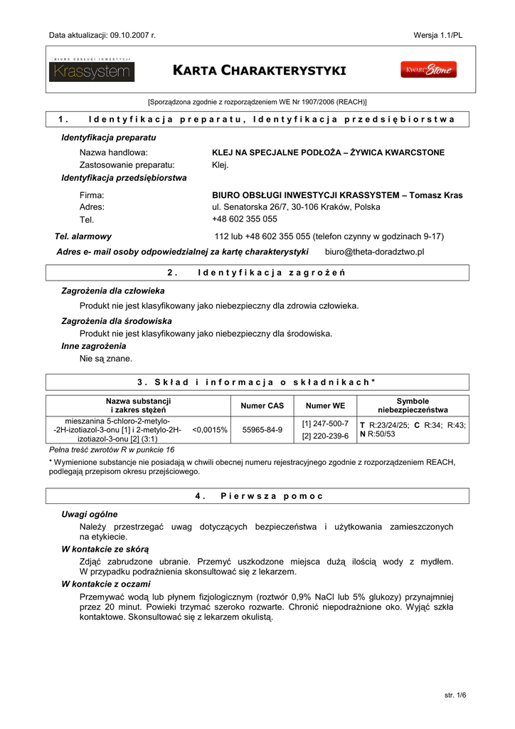 Data aktualizacji: 09.10.2007 r. Wersja 1.1/PL KARTA CHARAKTERYSTYKI [Sporządzona zgodnie z rozporządzeniem WE Nr 1907/2006 (REACH)] 1. Identyfikacja preparatu, Identyfikacja przedsiębiorstwa Identyfikacja preparatu Nazwa handlowa: Zastosowanie preparatu: Identyfikacja przedsiębiorstwa KLEJ NA SPECJALNE PODŁOŻA – ŻYWICA KWARCSTONE Klej. BIURO OBSŁUGI INWESTYCJI KRASSYSTEM – Tomasz Kras ul. Senatorska 26/7, 30-106 Kraków, Polska +48 602 355 055 Firma: Adres: Tel. 112 lub +48 602 355 055 (telefon czynny w godzinach 9-17) Tel. alarmowy Adres e- mail osoby odpowiedzialnej za kartę charakterystyki 2. [email protected] Identyfikacja zagrożeń Zagrożenia dla człowieka Produkt nie jest klasyfikowany jako niebezpieczny dla zdrowia człowieka. Zagrożenia dla środowiska Produkt nie jest klasyfikowany jako niebezpieczny dla środowiska. Inne zagrożenia Nie są znane. 3. Skład i informacja o składnikach* Nazwa substancji i zakres stężeń mieszanina 5-chloro-2-metylo-2H-izotiazol-3-onu [1] i 2-metylo-2Hizotiazol-3-onu [2] (3:1) Pełna treść zwrotów R w punkcie 16 Numer CAS <0,0015% 55965-84-9 Numer WE [1] 247-500-7 [2] 220-239-6 Symbole niebezpieczeństwa T R:23/24/25; C R:34; R:43; N R:50/53 * Wymienione substancje nie posiadają w chwili obecnej numeru rejestracyjnego zgodnie z rozporządzeniem REACH, podlegają przepisom okresu przejściowego. 4. Pierwsza pomoc Uwagi ogólne Należy przestrzegać uwag dotyczących bezpieczeństwa i użytkowania zamieszczonych na etykiecie. W kontakcie ze skórą Zdjąć zabrudzone ubranie. Przemyć uszkodzone miejsca dużą ilością wody z mydłem. W przypadku podrażnienia skonsultować się z lekarzem. W kontakcie z oczami Przemywać wodą lub płynem fizjologicznym (roztwór 0,9% NaCl lub 5% glukozy) przynajmniej przez 20 minut. Powieki trzymać szeroko rozwarte. Chronić niepodrażnione oko. Wyjąć szkła kontaktowe. Skonsultować się z lekarzem okulistą. str. 1/6 KARTA CHARAKTERYSTYKI Nazwa handlowa: Identyfikacja przedsiębiorstwa: Adres: Telefon: Data aktualizacji: KLEJ NA SPECJALNE PODŁOŻA – ŻYWICA KWARCSTONE BIURO OBSŁUGI INWESTYCJI KRASSYSTEM – Tomasz Kras ul. Senatorska 26/7, 30-106 Kraków, Polska +48 602 355 055 09.10.2007 r. Wersja: 1.1/PL W przypadku spożycia Podać do wypicia dużą ilość wody. Zasięgnąć porady lekarza, pokazać opakowanie lub etykietę. Po narażeniu drogą oddechową Wyprowadzić poszkodowaną osobę ze skażonego pomieszczenia i przenieść na świeże powietrze. Zapewnić ciepło i spokój. W razie potrzeby wykonać sztuczne oddychanie lub podać tlen. W przypadku wystąpienia niepokojących objawów skonsultować się z lekarzem. 5. Postępowanie w przypadku pożaru Odpowiednie środki gaśnicze CO2, proszek gaśniczy, piana, rozpylony strumień wody. Nieodpowiednie środki gaśnicze Zwarty strumień wody – ryzyko rozprzestrzeniania się pożaru. Uwagi dodatkowe Środki ochrony ogólnej typowe w przypadku pożaru. Nie należy przebywać w zagrożonej ogniem strefie bez odpowiedniego ubrania odpornego na chemikalia oraz aparatu do oddychania z niezależnym obiegiem powietrza. Nie należy dopuścić do przedostania się wody gaśniczej do kanalizacji, wód powierzchniowych i gruntowych. Uwaga! Produkt po odparowaniu zawartej w nim wody tworzy masę polimeru, która może ulec zapaleniu. Palne są również odpady skoagulowanego produktu. 6. Po st ęp o w an ie w p r z yp ad ku n i ez am ie rz o n e g o u w o ln i en i a d o ś ro d o w isk a Indywidualne środki ostrożności Przestrzegać przepisów prawnych w zakresie ochrony i bezpieczeństwa. Zakładać odzież ochronną. Patrz także pkt 8 karty. Niezbędne środki w zakresie ochrony środowiska Należy poczynić odpowiednie kroki w celu niedopuszczenia do rozprzestrzenienia się w środowisku naturalnym. W przypadku poważnej awarii wezwać odpowiednie służby ratownicze. Metody oczyszczania/wchłaniania Produkt zebrać za pomocą materiałów wchłaniajacych ciecze (np. piasek, ziemia, uniwersalne substancje wiążące, krzemionka, trociny itp.) i umieścić w kontenerach na odpady. Zebrany materiał potraktować jak odpady i dalej postępować wg pkt 13. Oczyścić skażone miejsce. 7. Postępowanie z preparatem i jego magazynowanie Postępowanie z produktem Przestrzegać przepisów prawnych w zakresie ochrony i bezpieczeństwa. Unikać kontaktu ze skórą i oczami. Pracować tylko w dobrze wentylowanych pomieszczeniach. Nie wdychać par. Magazynowanie Przechowywać w beczkach z tworzywa sztucznego z umieszczonym wewnątrz workiem polietylenowym lub zbiornikach magazynowych odpornych na działanie kwasów. Przechowywać w temperaturze od 5-35ºC. Unikać temperatur poniżej 0ºC. Specyficzne zastosowania Klej. 8. Kontrola narażania i środki ochrony indywidualnej Wartości graniczne narażania Produkt nie posiada komponentów podlegających kontroli narażenia w miejscu pracy. str. 2/6 KARTA CHARAKTERYSTYKI Nazwa handlowa: Identyfikacja przedsiębiorstwa: Adres: Telefon: Data aktualizacji: KLEJ NA SPECJALNE PODŁOŻA – ŻYWICA KWARCSTONE BIURO OBSŁUGI INWESTYCJI KRASSYSTEM – Tomasz Kras ul. Senatorska 26/7, 30-106 Kraków, Polska +48 602 355 055 09.10.2007 r. Wersja: 1.1/PL Kontrola narażenia w miejscu pracy Przestrzegać ogólnych zasad bezpieczeństwa i higieny. Unikać kontaktu ze skórą i oczami. Pracować tylko w dobrze wentylowanym pomieszczeniu. Podczas pracy nie jeść, nie pić, nie palić tytoniu oraz nie zażywać leków. Przed przerwą i po pracy należy dokładnie umyć ręce. Ochrona dróg oddechowych – w przypadku niewłaściwej wentylacji stosować ochronę dróg oddechowych. Ochrona rąk i ciała - zalecane rękawice ochronne oraz ubrania ochronne. Materiał, z którego wykonane są rękawice musi być nieprzepuszczalny i odporny na działanie produktu. Wyboru materiału należy dokonać przy uwzględnieniu czasów przebicia, szybkości przenikania i degradacji. Ponadto wybór odpowiednich rękawic