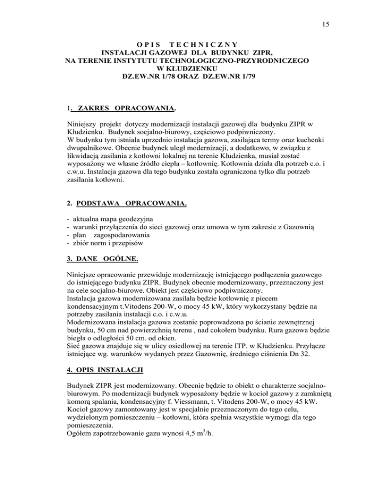 15 opistechniczny instalacji gazowej dla budynku zipr, na terenie