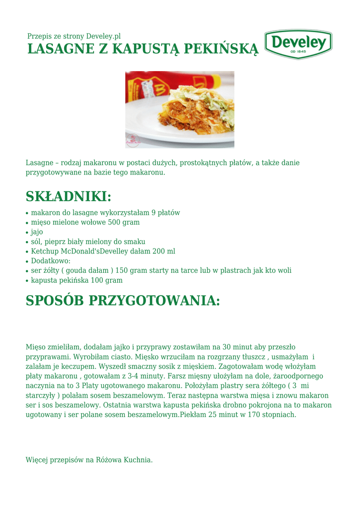Przepis ze strony Develey.pl LASAGNE Z KAPUSTĄ PEKIŃSKĄ Lasagne – rodzaj makaronu w postaci dużych, prostokątnych płatów, a także danie przygotowywane na bazie tego makaronu. SKŁADNIKI: ● ● ● ● ● ● ● ● makaron do lasagne wykorzystałam 9 płatów mięso mielone wołowe 500 gram jajo sól, pieprz biały mielony do smaku Ketchup McDonald'sDevelley dałam 200 ml Dodatkowo: ser żółty ( gouda dałam ) 150 gram starty na tarce lub w plastrach jak kto woli kapusta pekińska 100 gram SPOSÓB PRZYGOTOWANIA: Mięso zmieliłam, dodałam jajko i przyprawy zostawiłam na 30 minut aby przeszło przyprawami. Wyrobiłam ciasto. Mięsko wrzuciłam na rozgrzany tłuszcz , usmażyłam i zalałam je keczupem. Wyszedł smaczny sosik z mięskiem. Zagotowałam wodę włożyłam płaty makaronu , gotowałam z 3-4 minuty. Farsz mięsny ułożyłam na dole, żaroodpornego naczynia na to 3 Platy ugotowanego makaronu. Położyłam plastry sera żółtego ( 3 mi starczyły ) polałam sosem beszamelowym. Teraz następna warstwa mięsa i znowu makaron ser i sos beszamelowy. Ostatnia warstwa kapusta pekińska drobno pokrojona na to makaron ugotowany i ser polane sosem beszamelowym.Piekłam 25 minut w 170 stopniach. Więcej przepisów na Różowa Kuchnia.