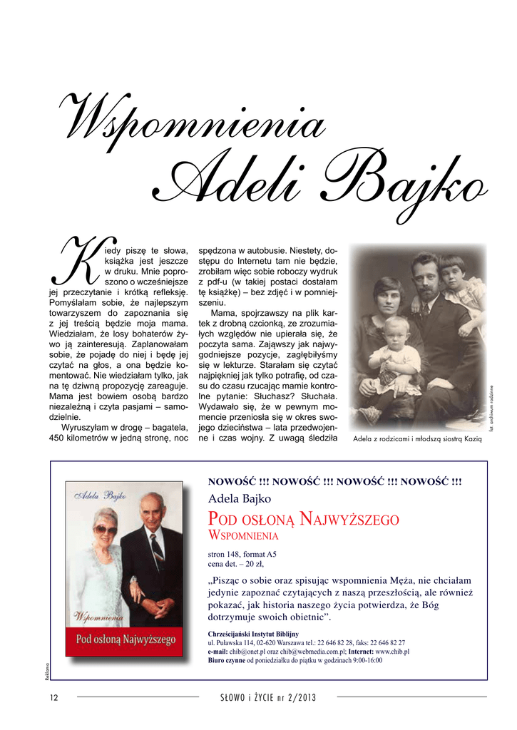 Wspomnienia iedy piszę te słowa, książka jest jeszcze w druku. Mnie poproszono o wcześniejsze jej przeczytanie i krótką refleksję. Pomyślałam sobie, że najlepszym towarzyszem do zapoznania się z jej treścią będzie moja mama. Wiedziałam, że losy bohaterów żywo ją zainteresują. Zaplanowałam sobie, że pojadę do niej i będę jej czytać na głos, a ona będzie ko mentować. Nie wiedziałam tylko, jak na tę dziwną propozycję zareaguje. Mama jest bowiem osobą bardzo niezależną i czyta pasjami – samodzielnie. Wyruszyłam w drogę – bagatela, 450 kilometrów w jedną stronę, noc spędzona w autobusie. Niestety, dostępu do Internetu tam nie będzie, zrobiłam więc sobie roboczy wydruk z pdf-u (w takiej postaci dostałam tę książkę) – bez zdjęć i w pomniej szeniu. Mama, spojrzawszy na plik kartek z drobną czcionką, ze zrozumiałych względów nie upierała się, że poczyta sama. Zająwszy jak najwygodniejsze pozycje, zagłębiłyśmy się w lekturze. Starałam się czytać najpiękniej jak tylko potrafię, od czasu do czasu rzucając mamie kontrolne pytanie: Słuchasz? Słuchała. Wydawało się, że w pewnym momencie przeniosła się w okres swojego dzieciństwa – lata przedwojenne i czas wojny. Z uwagą śledziła fot. archiwum rodzinne K Adeli Bajko Adela z rodzicami i młodszą siostrą Kazią NOWOŚĆ !!! NOWOŚĆ !!! NOWOŚĆ !!! NOWOŚĆ !!! Adela Bajko Pod osłoną najwyższego wsPomnienia stron 148, format A5 cena det. – 20 zł, Reklama „Pisząc o sobie oraz spisując wspomnienia Męża, nie chciałam jedynie zapoznać czytających z naszą przeszłością, ale również pokazać, jak historia naszego życia potwierdza, że Bóg dotrzymuje swoich obietnic”. 12 Chrześcijański Instytut Biblijny ul. Puławska 114, 02-620 Warszawa tel.: 22 646 82 28, faks: 22 646 82 27 e-mail: [email protected] oraz [email protected]; Internet: www.chib.pl Biuro czynne od poniedziałku do piątku w godzinach 9:00-16:00 SŁOWO i ŻYC IE n r 2/2013 fot. archiwum rodzinne losy głównej bohaterki i autorki – Adeli Bajko. Apostoł Paweł pisał do wierzących w Koryncie: „Bo choćbyście mieli Szczególnie ożywiła się, kiedy dziesięć tysięcy nauczycieli, to jednak ojców macie niewielu” (1 Kor 4:15). we wspomnieniach Adeli pojawił się Dla wielu pracowników Kościoła w Polsce Brat Paweł był, jest i pozostanie jej przyszły mąż Paweł. Stąd „opodobrym nauczycielem i niezmordowanym w pracy misjonarzem, ale przede wiadania Pawła” wywołały w mamie wszystkim troskliwym ojcem. A nie mógłby takim być, gdyby nie dzielna najwięcej emocji i wzruszeń. Przy żona Adela u Jego boku. O takich Biblia mówi: „rozpamiętując koniec ich woływały ich splatane życiowe drożycia, naśladujcie wiarę ich” (Hbr 13:7). gi. Mówiąc o swoich losach, opowiaTa publikacja z pewnością nam w tym pomoże. Jestem pewien, iż do lektudał o jej rodzinnych stronach. O Po ry tych wspomnień nie trzeba nikogo specjalnie zachęcać, bowiem to świa lesiu i początkach Kościoła Chrystu dectwo wiary będzie dla współczesnych i potomnych ogromną inspiracją. sowego w Polsce. Paweł Bajko jest To przykład życia godny naśladowania, dla mnie – wzór niedościgniony. zaledwie pięć lat starszy od mojej Prezbiter Piotr Karel mamy. Pamięta go jako aktywnego, Kościół Chrystusowy w Kołobrzegu oddanego Bogu młodego człowieka. Znajome są dla niej wszystkie miejsca, które wymienia, wydarzenia, jakie wspomina, nazwiska, których szego”. Bo to On pozwolił im rozwi- dle, chciałam zrezygnować z odczynie sposób było w tej biograficznej nąć wspaniałą służbę – Polską tywania niektórych z nich. Spoj opowieści pominąć. W jej oczach Chrześcijańską Misję. Z książki po- rzałam na mamę. – Tak, znam wierszkliły się łzy. znajemy szerokie spectrum działań sze Adeli Bajko – powiedziała. – Zatrzymałam się na chwilę, aby tej misji, a tak naprawdę – tych Czytałam je. Recytowałam. Są posłuchać jej wspomnień o nabo- dwojga niezwykle aktywnych i odda- piękne. No, czytaj... żeństwach, które odbywały się rów- nych Bożej sprawie ludzi. Warto Nie mogłam, niestety, pokazać nież w jej rodzinnym domu, o słyn- o tym przeczytać. Sama czytałam mamie fotografii, a jest ich tu kilkanej orkiestrze dętej z Targoszyc, zadziwiona, a moja słuchaczka też dziesiąt, zwłaszcza w ostatnim dziao chrzcie, który przyjęła z rąk z uznaniem kiwała głową. le „Kartki z albumu”. Już widzę, jak Grzegorza Bajko. O zsyłbędzie się nimi delektoce na roboty do Niemiec… wać, oglądając po wieloWróciłyśmy do lektury. kroć. Kolejny etap życia naZe „Wspomnieniami” szych bohaterów to koniec Adeli Bajko spędziłam wojny i pobyt w Niemczech, dwa popołudnia. Podwój połączony z oczekiwanie cenne. Z powodu saniem na emigrację do mej ich treści, przed Ameryki. W obozie dla stawionej przez autorkę uchodźców śledzimy rozw sposób niezwykle ciewój pięknej, czystej i ropły, plastyczny, poruszająmantycznej miłości Adeli cy. Oraz z powodu czasu i Pawła. Ale nie głównie na spędzonego z mamą, roztym upływał ich tam pobyt. mów z nią i jej wspomnień. Jak pisze autorka: Ludzie Polecam tę niezwykle wierzący potrafią wykorzywartościową pozycję, któstywać czas. Przebywa ra pokazuje, że życie jący w obozie kaznodzieje z Bogiem i służba dla Adela z narzeczonym – Pawłem Bajko, 1951 r. zorganizowali Seminarium Niego, mimo bolesnych Biblijne. Odbywały się wspaniałe Nic więc dziwnego, że swoją i trudnych momentów, jest wspanianabożeństwa, powstał chór, rozwi opowieść Adela Bajko kończy sło- łą przygodą, jest życiem obfitym, jała się praca wśród dzieci i mło wami: Gdy patrzę wstecz na nasze spełnionym, przeżytym z pasją. dzieży. życie, dziękuję Bogu z całego serca Takie życie jest warte przeżycia. Te lata ukształtowały i przygoto- za ogrom Jego błogosław