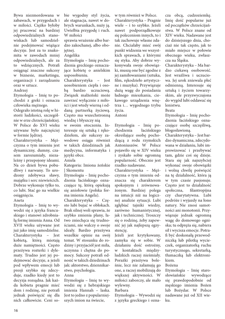 Bywa niezmordowana w zabawach, w przygodach i w miłości. Ciężko byłoby jej pracować na bardziej odpowiedzialnych stanowiskach lub samodzielnie podejmować wiążące decyzje. Jest za to znakomita w zawodach mniej odpowiedzialnych, ale za to wdzięcznych. Potrafi osiągnąć znaczne sukcesy w biznesie, marketingu, organizacji i zarządzaniu oraz w sztuce. Andrzej Etymologia – Imię to pochodzi z greki i oznacza człowieka mężnego. Odegrało istotną rolę w historii ludzkości, szczególnie w erze chrześcijańskiej. W Polsce do XVI wieku używane było najczęściej w formie Jędrzej. Charakterystyka – Mężczyzna o tym imieniu jest dynamiczny, dumny, czasem zarozumiały, niezależny i przepojony ideami. Na co dzień bywa pobudliwy i narwany. To urodzony zdobywca sławy, majątku i serc niewieścich. Dobrze wykonuje tylko to, co lubi. Stać go na wielkie osiągnięcia. Aneta Etymologia – Imię to wywodzi się z języka francuskiego i stanowi zdrobniałą formę imienia Anna. Od XVII wieku używane jest już jako imię samodzielne. Charakterystyka – Jest kobietą, którą miotają duże namiętności. Często przeżywa rozterki i dylematy. Trudno jest jej podejmować decyzje, a jeżeli pod wpływem emocji lub presji szybko się zdecyduje, rzadko kiedy jest to decyzja rozsądna. Jak każda kobieta pragnie mieć dom i rodzinę, nie potrafi jednak poświęcić się dla nich całkowicie. Ceni so16 bie wygodny styl życia, ale stagnacja, nawet w dobrych warunkach, nuży ją. Uwielbia przygodę i ruch. W miłości sprawia wrażenie albo bardzo zakochanej, albo obojętnej. Angelika Etymologia – Imię pochodzenia greckiego oznaczające kobietę o anielskim usposobieniu. Charakterystyka – Jest uosobieniem ciepła i osobą bardzo uczuciową. Związek małżeński może zawrzeć wyłącznie z miłości i jest wtedy wierną i oddaną partnerką życiową. Często ma wszechstronną wiedzę i błyszczy nią w swoim otoczeniu. Interesuje się sztuką i rękodziełem, ale sukcesy zawodowe osiąga również w takich dziedzinach jak medycyna, informatyka i języki obce. Aniela Kategoria: Imiona żeńskie | Skomentu Etymologia – Imię pochodzenia łacińskiego oznaczające tę, którą opiekują się aniołowie (polska forma imienia Angela). Charakterystyka – Często lubi bujać w obłokach. Brak silnej woli sprawia, że szybko zmienia plany, łatwo zniechęca się trudnościami, nie walczy o swoje ideały. Bardzo przeżywa wszelkie opinie na swój temat. W stosunku do rodziny i przyjaciół jest miła, uczynna i chętna do pomocy. Sukcesy potrafi odnosić w takich dziedzinach jak: aktorstwo, dziennikarstwo, psychologia. Anna Etymologia – Imię to wywodzi się z hebrajskiego imienia Hannah – laska. Jest to jedno z popularniejszych imion na świecie, w tym również w Polsce. Charakterystyka – Pragnie wiele – i to szybko. Jeżeli nawet podporządkowuje się poleceniom innych, to i tak zachowuje własne zdanie. Chciałaby mieć swój punkt widzenia we wszystkich sprawach, z którymi się styka. Aby dobrze wykonywała swoje obowiązki, muszą one być zgodne z jej zamiłowaniami (sztuka, film, rękodzieło artystyczne i muzyka). Przywiązuje dużą wagę do posiadania ładnego mieszkania, ciekawego urządzenia wnętrza i… wygodnego trybu życia. Antoni Etymologia – Imię pochodzenia łacińskiego określające osobę pochodzącą z rodu rzymskich Antoniuszów. W Polsce pojawiło się w XIV wieku i zyskało sobie ogromną popularność. Obecnie jest rzadko nadawane. Charakterystyka – Mężczyzna o tym imieniu odznacza się charakterem spokojnym i zrównoważonym. Bardziej polega na intuicji niż na logicznej analizie sytuacji. Lubi zgłębiać tajniki wiedzy, zarówno humanistycznej, jak i technicznej. Troszczy się o rodzinę, żeby zapewnić jej jak najlepszą egzystencję. Jeżeli jest krytykowany, zamyka się w sobie. W działaniu dość ostrożny, w kontaktach międzyludzkich raczej nieśmiały. Porażki przeżywa boleśnie, lecz nie załamują go one, a raczej mobilizują do większej aktywności. W miłości zaborczy, ale mało wylewny. Barbara Etymologia – Wywodzi się z języka greckiego i ozna- cza obcą, cudzoziemkę. Imię dość popularne już od początków chrześcijaństwa. W Polsce znane od XIV wieku. Nadawane jest do dzisiejszego dnia, chociaż nie tak często, jak to miało miejsce w połowie obecnego wieku, zwłaszcza na Śląsku. Charakterystyka – Ma bardzo ciekawą osobowość. Jest wrażliwa i uczuciowa. Jej urok zniewala płeć odmienną. Interesuje się sztuką i życiem towarzyskim, ale przyzwyczajona do wygód lubi oddawać się lenistwu. Beata Etymologia – Imię pochodzenia łacińskiego oznaczające osobę szczęśliwą, błogosławioną. Charakterystyka – Jest bardzo dynamiczna, zdecydowana w działaniu, lubi improwizować i przebywać tam, gdzie coś się dzieje. Stara się jak najszybciej wykonać swoje obowiązki i wolną chwilę poświęcić na tę działalność, która ją w tym czasie pasjonuje. Często jest to działalność społeczna, filantropijna czy charytatywna. Lubi podróże i wyjazdy na łono natury. Nie znosi samotności ani monotonii. Przywiązuje jednak ogromną wagę do domowego ogniska; tu odpręża się, nabiera sił i wycisza emocje. Potrafi być doskonałą przewodniczką lub pilotką wycieczek, organizatorką ruchu turystycznego, sekretarką, tłumaczką lub elektronikiem. Bożena Etymologia – Imię starosłowiańskie wywodzące się prawdopodobnie od męskiego imienia Bożen lub Bożydar. W Polsce nadawane już od XII wieku.
