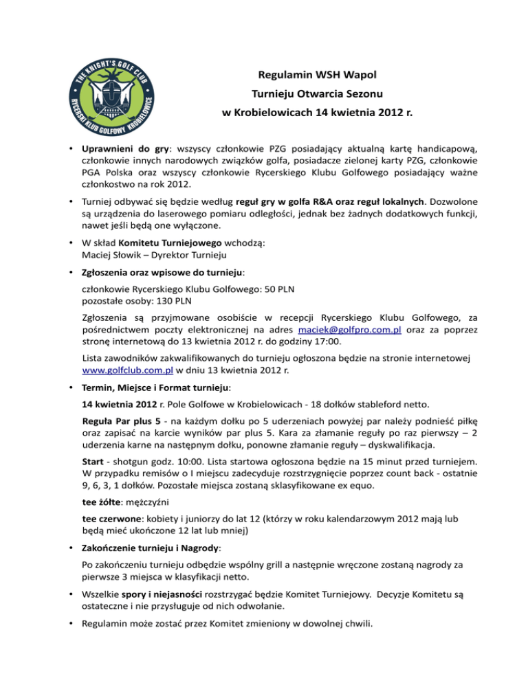 Regulamin WSH Wapol Turnieju Otwarcia Sezonu w Krobielowicach 14 kwietnia 2012 r. • Uprawnieni do gry: wszyscy członkowie PZG posiadający aktualną kartę handicapową, członkowie innych narodowych związków golfa, posiadacze zielonej karty PZG, członkowie PGA Polska oraz wszyscy członkowie Rycerskiego Klubu Golfowego posiadający ważne członkostwo na rok 2012. • Turniej odbywać się będzie według reguł gry w golfa R&A oraz reguł lokalnych. Dozwolone są urządzenia do laserowego pomiaru odległości, jednak bez żadnych dodatkowych funkcji, nawet jeśli będą one wyłączone. • W skład Komitetu Turniejowego wchodzą: Maciej Słowik – Dyrektor Turnieju • Zgłoszenia oraz wpisowe do turnieju: członkowie Rycerskiego Klubu Golfowego: 50 PLN pozostałe osoby: 130 PLN Zgłoszenia są przyjmowane osobiście w recepcji Rycerskiego Klubu Golfowego, za pośrednictwem poczty elektronicznej na adres [email protected] oraz za poprzez stronę internetową do 13 kwietnia 2012 r. do godziny 17:00. Lista zawodników zakwalifikowanych do turnieju ogłoszona będzie na stronie internetowej www.golfclub.com.pl w dniu 13 kwietnia 2012 r. • Termin, Miejsce i Format turnieju: 14 kwietnia 2012 r. Pole Golfowe w Krobielowicach - 18 dołków stableford netto. Reguła Par plus 5 - na każdym dołku po 5 uderzeniach powyżej par należy podnieść piłkę oraz zapisać na karcie wyników par plus 5. Kara za złamanie reguły po raz pierwszy – 2 uderzenia karne na następnym dołku, ponowne złamanie reguły – dyskwalifikacja. Start - shotgun godz. 10:00. Lista startowa ogłoszona będzie na 15 minut przed turniejem. W przypadku remisów o I miejscu zadecyduje rozstrzygnięcie poprzez count back - ostatnie 9, 6, 3, 1 dołków. Pozostałe miejsca zostaną sklasyfikowane ex equo. tee żółte: mężczyźni tee czerwone: kobiety i juniorzy do lat 12 (którzy w roku kalendarzowym 2012 mają lub będą mieć ukończone 12 lat lub mniej) • Zakończenie turnieju i Nagrody: Po zakończeniu turnieju odbędzie wspólny grill a następnie wręczone zostaną nagrody za pierwsze 3 miejsca w klasyfikacji netto. • Wszelkie spory i niejasności rozstrzygać będzie Komitet Turniejowy. Decyzje Komitetu są ostateczne i nie przysługuje od nich odwołanie. • Regulamin może zostać przez Komitet zmieniony w dowolnej chwili.