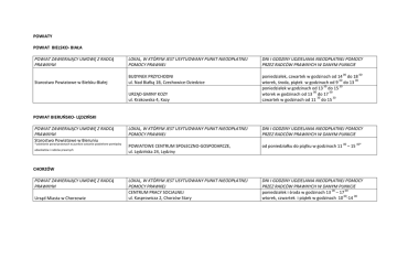 POWIATY POWIAT BIELSKO- BIAŁA POWIAT ZAWIERAJĄCY UMOWĘ Z RADCĄ PRAWNYM LOKAL, W KTÓRYM JEST USYTUOWANY PUNKT NIEODPŁATNEJ POMOCY PRAWNEJ DNI I GODZINY UDZIELANIA NIEODPŁATNEJ POMOCY PRZEZ RADCÓW PRAWNYCH W DANYM PUNKCIE Starostwo Powiatowe w Bielsku-Białej BUDYNEK PRZYCHODNI ul. Nad Białką 1B, Czechowice-Dziedzice URZĄD GMINY KOZY ul. Krakowska 4, Kozy poniedziałek, czwartek w godzinach od 14 do 18 00 00 wtorek, środa, piątek w godzinach od 9 do 13 30 30 poniedziałek w godzinach od 13 do 15 00 00 wtorek w godzinach od 13 do 17 30 30 czwartek w godzinach od 11 do 15 LOKAL, W KTÓRYM JEST USYTUOWANY PUNKT NIEODPŁATNEJ POMOCY PRAWNEJ DNI I GODZINY UDZIELANIA NIEODPŁATNEJ POMOCY PRZEZ RADCÓW PRAWNYCH W DANYM PUNKCIE POWIATOWE CENTRUM SPOŁECZNO-GOSPODARCZE, ul. Lędzińska 24, Lędziny od poniedziałku do piątku w godzinach 11 LOKAL, W KTÓRYM JEST USYTUOWANY PUNKT NIEODPŁATNEJ POMOCY PRAWNEJ CENTRUM PRACY SOCJALNEJ ul. Kasprowicza 2, Chorzów Stary DNI I GODZINY UDZIELANIA NIEODPŁATNEJ POMOCY PRZEZ RADCÓW PRAWNYCH W DANYM PUNKCIE 00 00 poniedziałek i środa w godzinach 13 – 17 00 00 wtorek, czwartek i piątek w godzinach 10 -14 00 00 POWIAT BIERUŃSKO- LĘDZIŃSKI POWIAT ZAWIERAJĄCY UMOWĘ Z RADCĄ PRAWNYM Starostwo Powiatowe w Bieruniu *udzielanie porad prawnych w punkcie zostanie podzielone pomiędzy adwokatów i radców prawnych 00 – 15 00* CHORZÓW POWIAT ZAWIERAJĄCY UMOWĘ Z RADCĄ PRAWNYM Urząd Miasta w Chorzowie POWIAT CIESZYŃSKI POWIAT ZAWIERAJĄCY UMOWĘ Z RADCĄ PRAWNYM Starostwo Powiatowe w Cieszynie LOKAL, W KTÓRYM JEST USYTUOWANY PUNKT NIEODPŁATNEJ POMOCY PRAWNEJ SKOCZÓW ul. Mickiewicza 9, Skoczów GOLESZÓW ul. Cieszyńska 29, Goleszów DNI I GODZINY UDZIELANIA NIEODPŁATNEJ POMOCY PRZEZ RADCÓW PRAWNYCH W DANYM PUNKCIE 00 poniedziałek, wtorek, czwartek, piątek w godzinach od 8 00 do 12 00 00 środa w godzinach od 12 do 16 00 00 poniedziałek i piątek w godzinach od 9 do 14 POWIAT CHRZANOWSKI POWIAT ZAWIERAJĄCY UMOWĘ Z RADCĄ PRAWNYM Starostwo Powiatowe w Chrzanowie LOKAL, W KTÓRYM JEST USYTUOWANY PUNKT NIEODPŁATNEJ POMOCY PRAWNEJ MIEJSKA BIBLIOTEKA PUBLICZNA ul. Broniewskiego 10C, Chrzanów DNI I GODZINY UDZIELANIA NIEODPŁATNEJ POMOCY PRZEZ RADCÓW PRAWNYCH W DANYM PUNKCIE LOKAL, W KTÓRYM JEST USYTUOWANY PUNKT NIEODPŁATNEJ POMOCY PRAWNEJ ul. Obrońców Pokoju 7 , Dąbrowa Górnicza DNI I GODZINY UDZIELANIA NIEODPŁATNEJ POMOCY PRZEZ RADCÓW PRAWNYCH W DANYM PUNKCIE 00 00 od poniedziałku do piątku w godzinach od 13 do 17 LOKAL, W KTÓRYM JEST USYTUOWANY PUNKT NIEODPŁATNEJ POMOCY PRAWNEJ PYSKOWICE ul. Strzelców Bytomskich 3, Pyskowice DNI I GODZINY UDZIELANIA NIEODPŁATNEJ POMOCY PRZEZ RADCÓW PRAWNYCH W DANYM PUNKCIE 30 30 poniedziałek, wtorek, środa w godzinach od 11 do 15 30 30 czwartek w godzinach od 9 do 17 od poniedziałku do piątku w godzinach od 15 00 do 19 00 DĄBROWA GÓRNICZA POWIAT ZAWIERAJĄCY UMOWĘ Z RADCĄ PRAWNYM Urząd Miasta w Dąbrowie Górniczej POWIAT GLIWICKI POWIAT ZAWIERAJĄCY UMOWĘ Z RADCĄ PRAWNYM Starostwo Powiatowe w Gliwicach JASTRZĘBIE ZDRÓJ LOKAL, W KTÓRYM JEST USYTUOWANY PUNKT NIEODPŁATNEJ POWIAT ZAWIERAJĄCY UMOWĘ Z RADCĄ PRAWNYM Urząd Miasta w Jastrzębiu Zdroju POMOCY PRAWNEJ 1. 2. 3. *radcowie prawni świadczyć będą pomoc prawną w jednym ze wskazanych punktów 4. ul.Dunikowskiego 5-7 , Jastrzębie Zdrój URZĄD MIASTA CENTRUM ORGANIZACJI POZARZĄDOWYCH ul. Wrzosowa 12a, Jastrzębie Zdrój OŚRODEK POMOCY SPOŁECZNEJ ul. Opolska 9, Jastrzębie Zdrój OŚRODEK POMOCY SPOŁECZNEJ ul. Opolska 9, Jastrzębie Zdrój DNI I GODZINY UDZIELANIA NIEODPŁATNEJ POMOCY PRZEZ RADCÓW PRAWNYCH W DANYM PUNKCIE 00 00 od poniedziałku do piątku w godzinach od 14 do 18 od poniedziałku do piątku w godzinach od 8 00 do 12 00 od poniedziałku do piątku w godzinach od 7 30 do 11 30 od poniedziałku do piątku w godzinach od 11 30 do 15 30 KATOWICE LOKAL, W KTÓRYM JEST USYTUOWANY PUNKT NIEODPŁATNEJ POWIAT ZAWIERAJĄCY UMOWĘ Z RADCĄ PRAWNYM Urząd Miasta w Katowicach POMOCY PRAWNEJ 1. 2. 3. ul. Traktorzystów 42, Katowice ul. Hallera 22, Katowice ul. Markiefiki 44a, Katowice DNI I GODZINY UDZIELANIA NIEODPŁATNEJ POMOCY PRZEZ RADCÓW PRAWNYCH W DANYM PUNKCIE 00 00 od poniedziałku do piątku w godzinach od 16 do 20 00 00 od poniedziałku do piątku w godzinach od 11 do 15 00 00 od poniedziałku do piątku w godzinach od 9 do 13 POWIAT MIKOŁOWSKI POWIAT ZAWIERAJĄCY UMOWĘ Z RADCĄ PRAWNYM LOKAL, W KTÓRYM JEST USYTUOWANY PUNKT NIEODPŁATNEJ POMOCY PRAWNEJ Starostwo Powiatowe w Mikołowie URZĄD MIASTA ORZESZE ul. Św. Wawrzyńca 21, Orzesze DNI I GODZINY UDZIELANIA NIEODPŁATNEJ POMOCY PRZEZ RADCÓW PRAWNYCH W DANYM PUNKCIE poniedziałek, wtorek, środa, piątek 00 00 w godzinach od 8 do 12 00 00 czwartek w godzinach od 13 do 17 LOKAL, W KTÓRYM JEST USYTUOWANY PUNKT NIEODPŁATNEJ POMOCY PRAWNEJ URZĄD MIASTA PIEKARY ŚLĄSKIE ul. Bytomska 92, Piekary Śląskie DNI I GODZINY UDZIELANIA NIEODPŁATNEJ POMOCY PRZEZ RADCÓW PRAWNYCH W DANYM PUNKCIE według harmonogramu dyżurów ustalonego z powiatem PIEKARY ŚLĄSKIE POWIAT ZAWIERAJĄCY UMOWĘ Z RADCĄ PRAWNYM Urząd Miasta w Piekarach Śląskich POWIAT RACIBORSKI LOKAL, W KTÓRYM JEST USYTUOWANY PUNKT NIEODPŁATNEJ POWIAT ZAWIERAJĄCY UMOWĘ Z RADCĄ PRAWNYM 1. Starostwo Powiatowe w Raciborzu *udzielanie porad prawnych w punktach zostanie podzielone pomiędzy adwokatów i radców prawnych DNI I GODZINY UDZIELANIA NIEODPŁATNEJ POMOCY PRZEZ RADCÓW PRAWNYCH W DANYM PUNKCIE 00 poniedziałek, środa , czwartek, piątek w godzinach od 8 00 do 12 STAROSTWO POWIATOWE W RACIBORZU Plac Okrzei 4, 00 00 Racibórz wtorek w godzinach od 12 do 16 00 00 CENTRUM SPOŁECZNO-KULTURALNE, ul. 1 Maja 8B, Pietrowice poniedziałek, środa w godzinach od 14 do 18 00 00 Wielkie wtorek, czwartek, piątek w godzinach od 10 do 14 POMOCY PRAWNEJ 2. RUDA ŚLĄSKA POWIAT ZAWIERAJĄCY UMOWĘ Z RADCĄ PRAWNYM LOKAL, W KTÓRYM JEST USYTUOWANY PUNKT NIEODPŁATNEJ POMOCY PRAWNEJ 1.