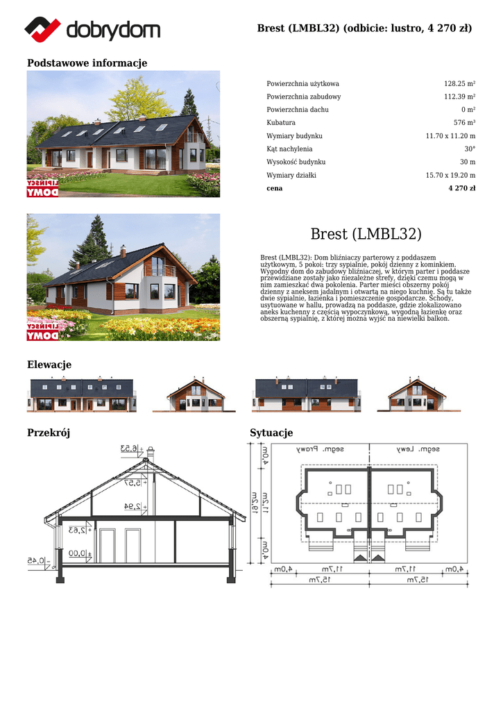 Brest (LMBL32) (odbicie: lustro, 4 270 zł) Podstawowe informacje Powierzchnia użytkowa 128.25 m² Powierzchnia zabudowy 112.39 m² Powierzchnia dachu Kubatura 0 m² 576 m³ Wymiary budynku Kąt nachylenia Wysokość budynku Wymiary działki cena 11.70 x 11.20 m 30° 30 m 15.70 x 19.20 m 4 270 zł Brest (LMBL32) Brest (LMBL32): Dom bliźniaczy parterowy z poddaszem użytkowym, 5 pokoi: trzy sypialnie, pokój dzienny z kominkiem. Wygodny dom do zabudowy bliźniaczej, w którym parter i poddasze przewidziane zostały jako niezależne strefy, dzięki czemu mogą w nim zamieszkać dwa pokolenia. Parter mieści obszerny pokój dzienny z aneksem jadalnym i otwartą na niego kuchnię. Są tu także dwie sypialnie, łazienka i pomieszczenie gospodarcze. Schody, usytuowane w hallu, prowadzą na poddasze, gdzie zlokalizowano aneks kuchenny z częścią wypoczynkową, wygodną łazienkę oraz obszerną sypialnię, z której można wyjść na niewielki balkon. Elewacje Przekrój Sytuacje Brest (LMBL32) (odbicie: lustro, 4 270 zł) Rzuty Parter 87.32 m² Komunikacja Taras Wiatrołap 5.20 m² 5.37 m² 10.02 m² Kuchnia 6.17 m² Pokój dzienny 8.52 m² Komunikacja 28.96 m² C.o. 5.70 m² Pokój 4.77 m² Łazienka 12.49 m² Pokój 4.36 m² Podest 11.15 m² Poddasze 72.38 m² Schody 4.58 m² Pokój 9.97 m² Aneks kuchenny 6.17 m² Łazienka 5.61 m² Pokój Balkon 14.60 m² 4.13 m²