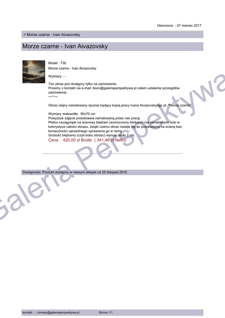 Utworzono : 07 marzec 2017 > Morze czarne - Ivan Aivazovsky Morze czarne - Ivan Aivazovsky Model : 730 Morze czarne - Ivan Aivazovsky a w ty Wymiary : - Ten obraz jest dostępny tylko na zamówienie. Prosimy o kontakt via e-mail: [email protected] celem ustalenia szczegółów zamówienia. ~~*~~ k e Obraz olejny namalowany ręcznie będący kopią pracy Ivana Aivazovskyego pt. "Morze czarne". Wymiary malowidła: 90x70 cm Powyższe zdjęcie przedstawia namalowaną przez nas pracę. Płótno naciągnięte na sosnowy blejtram (wzmocniony klinkami) ma zamalowane boki w kolorystyce całości obrazu, dzięki czemu obraz nadaje się do powieszenia na ścianę bez konieczności uprzedniego oprawiania go w ramę. Grubość blejtramy (czyli boku obrazu) wynosi około 2 cm. p rs e P Cena : 420,00 zł Brutto ( 341,46 zł Netto) a i r e l a Dostępność: Produkt dostępny w naszym sklepie od 25 listopad 2016 G kontakt : - [email protected] Strona 1/1