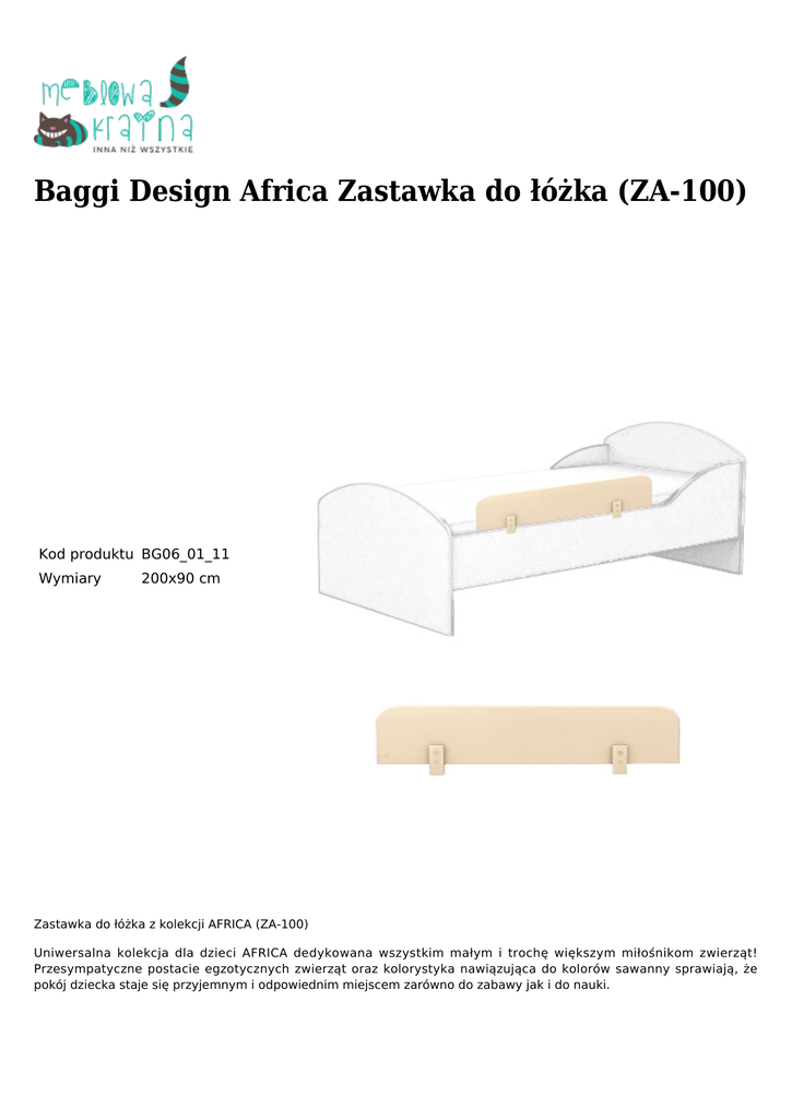 Baggi Design Africa Zastawka do łóżka (ZA-100) Kod produktu BG06_01_11 Wymiary 200x90 cm Zastawka do łóżka z kolekcji AFRICA (ZA-100) Uniwersalna kolekcja dla dzieci AFRICA dedykowana wszystkim małym i trochę większym miłośnikom zwierząt! Przesympatyczne postacie egzotycznych zwierząt oraz kolorystyka nawiązująca do kolorów sawanny sprawiają, że pokój dziecka staje się przyjemnym i odpowiednim miejscem zarówno do zabawy jak i do nauki. Zastawka zabezpieczająca przed upadkiem dziecka w czasie snu. Wykonana z lakierowanego MDF, łatwa do montażu i demontażu. Istnieje możliwość montowania jej po obu stronach łóżka. Czas oczekiwania: 4-6 tygodni. Wymiary: 20 cm x 100 cm (wysokość x szerokość) Konstrukcja: lakierowany MDF. Kolorystyka: beżowy. Gwarancja: 24 miesiące. Mebel do samodzielnego montażu.