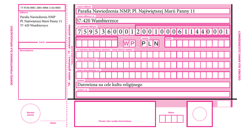 nazwa odbiorcy 75 9536 0001 2001 0006 1144 0001 Parafia Nawiedzenia NMP, Pl. Najświętszej Marii Panny 11 57-420 Wambierzyce *niepotrzebne skreślić kwota nazwa odbiorcy c.d. Zleceniodawca nr rachunku odbiorcy 7595 36000120 0 1 0 0 0 6 11440 00 1 waluta WP kwota P L N nr rachunku zleceniodawcy (przelew) / kwota słownie (wpłata) nazwa zleceniodawcy nazwa zleceniodawcy c.d. tytułem Darowizna na cele kultu religijnego tytułem c.d. Stempel dzienny Opłata Opłata Pieczęć, data i podpis zleceniodawcy ODCINEK DLA BANKU ZLECENIODAWCY Parafia Nawiedzenia NMP Pl. Najświętszej Marii Panny 11 57-420 Wambierzyce *W - wpłata gotówkowa / *P - polecenie przelewu DOWÓD/POKWITOWANIE DLA WPŁACAJĄCEGO Odbiorca