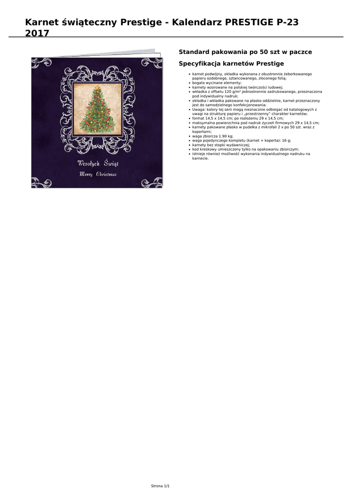 Karnet świąteczny Prestige - Kalendarz PRESTIGE P-23 2017 Standard pakowania po 50 szt w paczce Specyfikacja karnetów Prestige karnet podwójny, okładka wykonana z obustronnie żeberkowanego papieru ozdobnego, sztancowanego, złoconego folią; bogato wycinane elementy; karnety wzorowane na polskiej twórczości ludowej; wkładka z offsetu 120 g/m² jednostronnie zadrukowanego, przeznaczona pod indywidualny nadruk; okładka i wkładka pakowane na płasko oddzielnie, karnet przeznaczony jest do samodzielnego konfekcjonowania; Uwaga: kolory tej serii mogą nieznacznie odbiegać od katalogowych z uwagi na strukturę papieru i „przestrzenny” charakter karnetów; format 14,5 x 14,5 cm; po rozłożeniu 29 x 14,5 cm; maksymalna powierzchnia pod nadruk życzeń firmowych 29 x 14,5 cm; karnety pakowane płasko w pudełka z mikrofali 2 x po 50 szt. wraz z kopertami; waga zbiorcza 1.90 kg; waga pojedynczego kompletu (karnet + koperta): 16 g; karnety bez stopki wydawniczej; kod kreskowy umieszczony tylko na opakowaniu zbiorczym; istnieje również możliwość wykonania indywidualnego nadruku na karnecie. Strona 1/1 Powered by TCPDF (www.tcpdf.org)