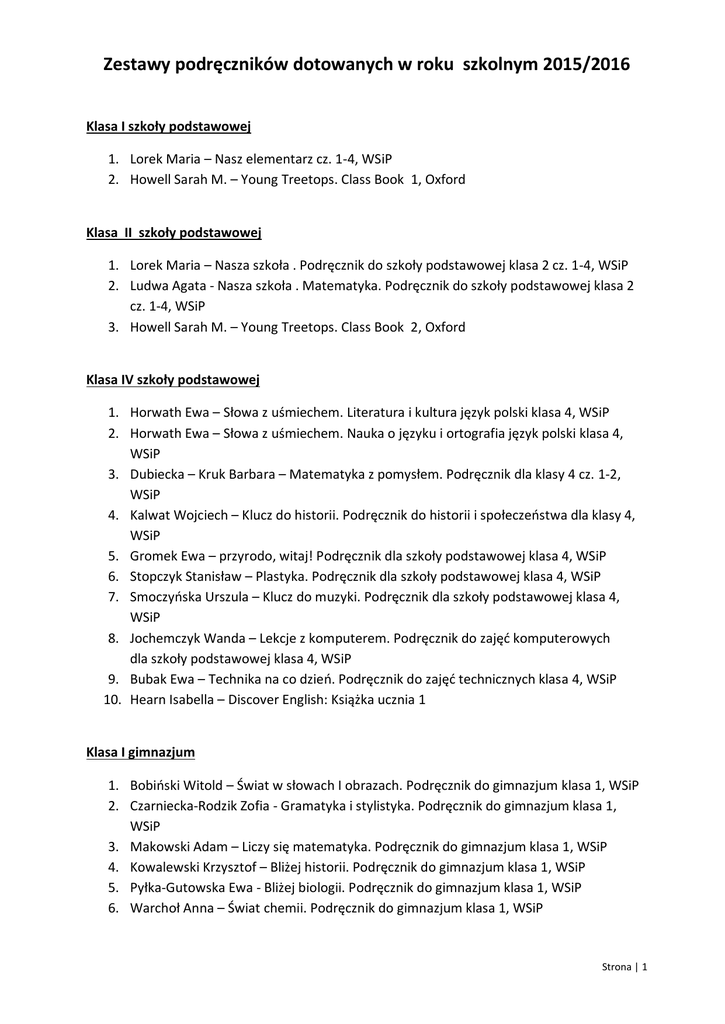 Zestawy podręczników dotowanych w roku szkolnym 2015/2016 Klasa I szkoły podstawowej 1. Lorek Maria – Nasz elementarz cz. 1-4, WSiP 2. Howell Sarah M. – Young Treetops. Class Book 1, Oxford Klasa II szkoły podstawowej 1. Lorek Maria – Nasza szkoła . Podręcznik do szkoły podstawowej klasa 2 cz. 1-4, WSiP 2. Ludwa Agata - Nasza szkoła . Matematyka. Podręcznik do szkoły podstawowej klasa 2 cz. 1-4, WSiP 3. Howell Sarah M. – Young Treetops. Class Book 2, Oxford Klasa IV szkoły podstawowej 1. Horwath Ewa – Słowa z uśmiechem. Literatura i kultura język polski klasa 4, WSiP 2. Horwath Ewa – Słowa z uśmiechem. Nauka o języku i ortografia język polski klasa 4, WSiP 3. Dubiecka – Kruk Barbara – Matematyka z pomysłem. Podręcznik dla klasy 4 cz. 1-2, WSiP 4. Kalwat Wojciech – Klucz do historii. Podręcznik do historii i społeczeństwa dla klasy 4, WSiP 5. Gromek Ewa – przyrodo, witaj! Podręcznik dla szkoły podstawowej klasa 4, WSiP 6. Stopczyk Stanisław – Plastyka. Podręcznik dla szkoły podstawowej klasa 4, WSiP 7. Smoczyńska Urszula – Klucz do muzyki. Podręcznik dla szkoły podstawowej klasa 4, WSiP 8. Jochemczyk Wanda – Lekcje z komputerem. Podręcznik do zajęć komputerowych dla szkoły podstawowej klasa 4, WSiP 9. Bubak Ewa – Technika na co dzień. Podręcznik do zajęć technicznych klasa 4, WSiP 10. Hearn Isabella – Discover English: Książka ucznia 1 Klasa I gimnazjum 1. Bobiński Witold – Świat w słowach I obrazach. Podręcznik do gimnazjum klasa 1, WSiP 2. Czarniecka-Rodzik Zofia - Gramatyka i stylistyka. Podręcznik do gimnazjum klasa 1, WSiP 3. Makowski Adam – Liczy się matematyka. Podręcznik do gimnazjum klasa 1, WSiP 4. Kowalewski Krzysztof – Bliżej historii. Podręcznik do gimnazjum klasa 1, WSiP 5. Pyłka-Gutowska Ewa - Bliżej biologii. Podręcznik do gimnazjum klasa 1, WSiP 6. Warchoł Anna – Świat chemii. Podręcznik do gimnazjum klasa 1, WSiP Strona | 1 7. 8. 9. 10. 11. Sagnowska Barbara - Świat fizyki. Podręcznik do gimnazjum klasa 1, WSiP Lechowicz Agnieszka – Bliżej geografii. Podręcznik do gimnazjum klasa 1, WSiP Stopczyk Stanisław - Bliżej sztuki. Podręcznik do gimnazjum klasa 1, WSiP Panek Wacław - Świat muzyki. Podręcznik do gimnazjum klasa 1, WSiP Jochemczyk Wanda – Lekcje z komputerem. Podręcznik do informatyki dla gimnazjum 1, WSiP 12. Potapowicz Anna – Aha! Neu. Kurs podstawowy. Podręcznik do gimnazjum klasa 1, WSiP 13. Evans Virginia – Smart Time 1: Student`s Book, Express Publishing 14. Evans Virginia – Smart Time 2: Student`s Book, Express Publishing Strona | 2