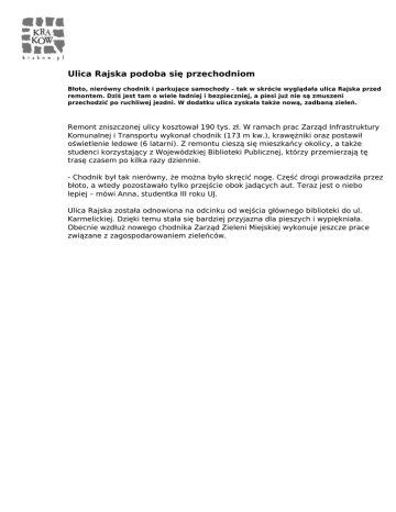 Ulica Rajska podoba się przechodniom Błoto, nierówny chodnik i parkujące samochody – tak w skrócie wyglądała ulica Rajska przed remontem. Dziś jest tam o wiele ładniej i bezpieczniej, a piesi już nie są zmuszeni przechodzić po ruchliwej jezdni. W dodatku ulica zyskała także nową, zadbaną zieleń. Remont zniszczonej ulicy kosztował 190 tys. zł. W ramach prac Zarząd Infrastruktury Komunalnej i Transportu wykonał chodnik (173 m kw.), krawężniki oraz postawił oświetlenie ledowe (6 latarni). Z remontu cieszą się mieszkańcy okolicy, a także studenci korzystający z Wojewódzkiej Biblioteki Publicznej, którzy przemierzają tę trasę czasem po kilka razy dziennie. - Chodnik był tak nierówny, że można było skręcić nogę. Część drogi prowadziła przez błoto, a wtedy pozostawało tylko przejście obok jadących aut. Teraz jest o niebo lepiej – mówi Anna, studentka III roku UJ. Ulica Rajska została odnowiona na odcinku od wejścia głównego biblioteki do ul. Karmelickiej. Dzięki temu stała się bardziej przyjazna dla pieszych i wypiękniała. Obecnie wzdłuż nowego chodnika Zarząd Zieleni Miejskiej wykonuje jeszcze prace związane z zagospodarowaniem zieleńców. Powered by TCPDF (www.tcpdf.org)