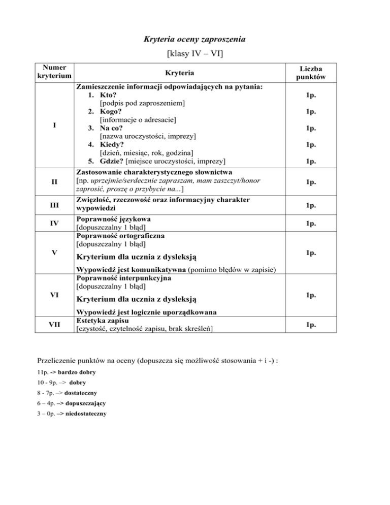 Kryteria oceny zaproszenia [klasy IV – VI]