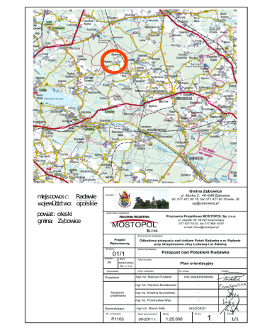 miejscowo : Radawie województwo: opolskie powiat: oleski gmina: Z bowice Gmina Z bowice Inwestor ul. Murka 2, 46+048 Z bowice tel. 077 421 60 76; fax 077 421 60 76 wew. 36 [email protected] Jednostka projektowa Pracownia Projektowa MOSTOPOL Sp. z o.o. ul. Jagie y 39, 46-020 Czarnow sy 077 427-18-20, fax 077 469-15-91 e-mail: [email protected] MOSTOPOL Zamierzenie budowlane Projekt Wykonawczy Nr tomu Odbudowa przepustu nad ciekiem Potok Radawka w m. Radawie przy skrzy owaniu ulicy Ludowej z ul. Szkoln Obiekt budowlany Przepust nad Potokiem Radawka 01/1 Bran a M Biuro Tytu rysunku MOSTOPOL Sp. z o.o. Stanowisko Projektant Asystenci projektanta Sprawdzaj cy Nr. archiwalny P1103 Plan orientacyjny Imi i nazwisko Nr upraw. mgr in . Mariusz Pustelnik Podpis OPL/0504/PWOM/09 mgr in . Karolina Drozdowska - mgr in . Ewelina Szyma ska - mgr in . Przemys aw W s - mgr in . Marcin Solis Data opracowania 09-2011 r. 262/DO /07 Skala 1:25.000 Nr rys. 1 Arkusz