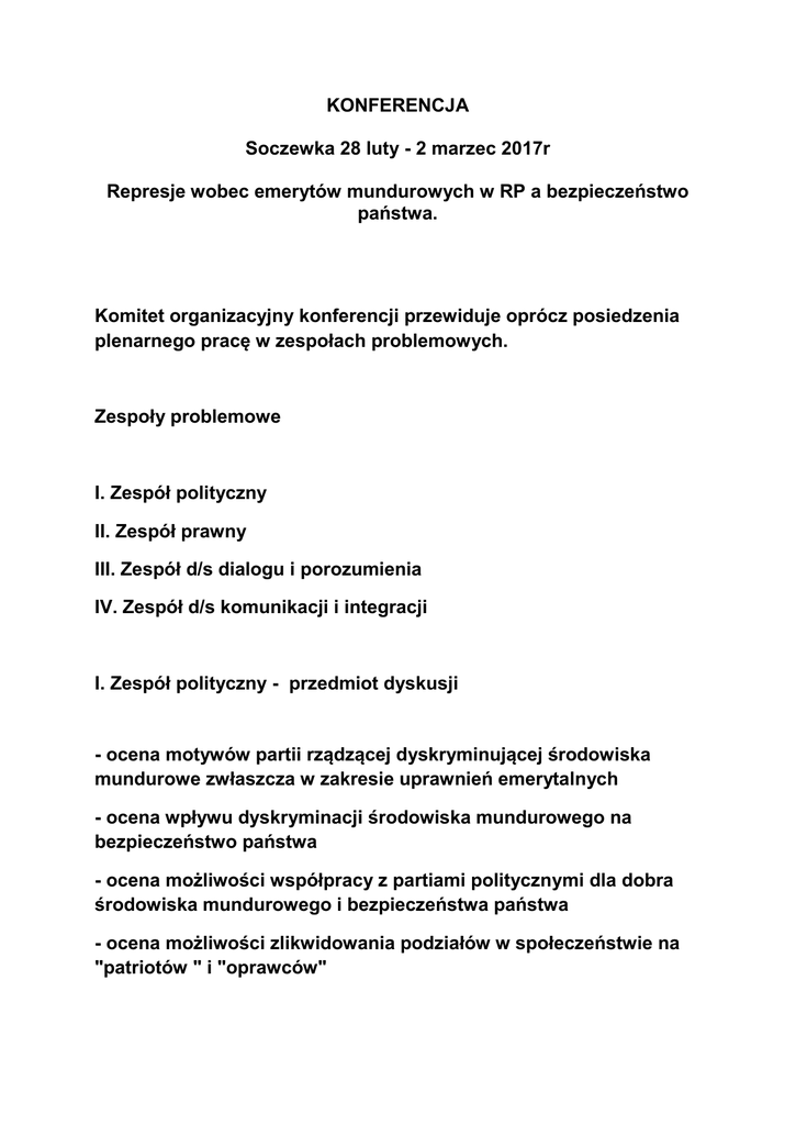KONFERENCJA Soczewka 28 luty - 2 marzec 2017r Represje wobec emerytów mundurowych w RP a bezpieczeństwo państwa. Komitet organizacyjny konferencji przewiduje oprócz posiedzenia plenarnego pracę w zespołach problemowych. Zespoły problemowe I. Zespół polityczny II. Zespół prawny III. Zespół d/s dialogu i porozumienia IV. Zespół d/s komunikacji i integracji I. Zespół polityczny - przedmiot dyskusji - ocena motywów partii rządzącej dyskryminującej środowiska mundurowe zwłaszcza w zakresie uprawnień emerytalnych - ocena wpływu dyskryminacji środowiska mundurowego na bezpieczeństwo państwa - ocena możliwości współpracy z partiami politycznymi dla dobra środowiska mundurowego i bezpieczeństwa państwa - ocena możliwości zlikwidowania podziałów w społeczeństwie na "patriotów " i "oprawców" - możliwości rozwiązania sytuacji kryzysowej na linii środowiska mundurowe a władza ustawodawcza i wykonawcza II. Zespół prawny - przedmiot dyskusji - ocena prawna uchwalonych zmian w ustawach emerytalnych służb mundurowych w kontekście prawa krajowego i międzynarodowego - ocena legalności uchwalonych ustaw - możliwości zaskarżania uchwalonych ustaw na drodze krajowej i międzynarodowej - możliwości zaskarżania indywidualnych decyzji emerytalnych na skutek wprowadzonych zmian w ustawach emerytalnych III. Zespół d/s dialogu i porozumienia - przedmiot dyskusji - ocena podejmowanych działań politycznych i prawnych zmierzających do zablokowania represyjnych ustaw i zarządzeń władzy ustawodawczej i wykonawczej - ocena możliwości zlikwidowania podziałów w społeczeństwie na "patriotów " i "oprawców" - zmiana podejścia do oceny okresu PRL jako systemu totalitarnego w kontekście aktualnej sytuacji społeczno politycznej i ekonomicznej w kraju - możliwości zahamowania wykorzystywania polityki historycznej w bieżącej działalności politycznej, zmiana priorytetów w działalności instytucji takich jak IPN w kreowaniu bieżących zdarzeń politycznych IV. Zespół d/s komunikacji i integracji - przedmiot dyskusji - ocena możliwości przedstawiania stanowiska środowisk mundurowych w mediach - wykorzystanie możliwości komunikacji internetowej / np. Internetowe Forum Policyjne / - wzmocnienie roli Federacji Stowarzyszeń Służb Mundurowych w reprezentowaniu i bronieniu interesów naszego środowiska - stworzenie systemu komunikacji i wymiany informacji pomiędzy poszczególnymi stowarzyszeniami i indywidualnymi członkami naszego środowiska - podejmowanie wspólnych działań protestacyjnych dobra środowiska mundurowego i bezpieczeństwa państwa - współpraca z innymi demokratycznymi stowarzyszeniami i instytucjami