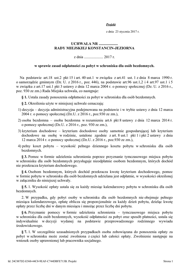 Projekt z dnia 23 stycznia 2017 r. UCHWAŁA NR .................... RADY MIEJSKIEJ KONSTANCIN-JEZIORNA z dnia .................... 2017 r. w sprawie zasad odpłatności za pobyt w schronisku dla osób bezdomnych. Na podstawie art.18 ust.2 pkt 15 i art. 40 ust.1 w związku z art.41 ust. 1 z dnia 8 marca 1990 r. o samorządzie gminnym (Dz. U. z 2016 r., poz. 446), na podstawie art.96 ust.1,2 i 4 art.97 ust.1 i 5 w związku z art.17 ust.1 pkt 3 ustawy z dnia 12 marca 2004 r. o pomocy społecznej (Dz. U. z 2016 r., poz. 930 ze zm.) Rada Miejska uchwala, co następuje: § 1. Ustala zasady ponoszenia odpłatności za pobyt w schronisku dla osób bezdomnych. § 2. Określenia użyte w niniejszej uchwale oznaczają: 1) decyzja – decyzja administracyjna podejmowana na podstawie i w trybie ustawy z dnia 12 marca 2004 r. o pomocy społecznej (Dz.U. z 2016 r., poz.930 ze zm.), 2) osoba bezdomna – osoba bezdomna w rozumieniu art.6 pkt 8 ustawy z dnia 12 marca 2014 r. o pomocy społecznej (Dz.U. z 2016 r., poz. 930 ze zm.), 3) kryterium dochodowe – kryterium dochodowe osoby samotnie gospodarującej lub kryterium dochodowe na osobę w rodzinie, ustalone zgodnie z art. 8 ust.1 pkt 1 i pkt 2 ustawy z dnia 12 marca 2014 r. o pomocy społecznej (Dz.U. z 2016 r., poz.930 ze zm.), 4) pełny koszt pobytu – wysokość pełnego dziennego kosztu pobytu w schronisku dla osób bezdomnych. § 3. Pomoc w formie udzielenia schronienia poprzez przyznanie tymczasowego miejsca pobytu w schronisku dla osób bezdomnych przysługuje nieodpłatnie osobom bezdomnym, których dochód nie przekracza kryterium dochodowego. § 4. Osobom bezdomnym, których dochód przekracza kwotę kryterium dochodowego, pomoc w formie pobytu w schronisku dla osób bezdomnych udzielana jest odpłatnie, w wysokości określonej w załączniku do niniejszej uchwały. § 5. 1. Wysokość opłaty ustala się za każdy miesiąc kalendarzowy pobytu w schronisku dla osób bezdomnych. 2. W przypadku, gdy pobyt osoby w schronisku dla osób bezdomnych nie obejmuje pełnego miesiąca kalendarzowego, opłatę oblicza się proporcjonalnie za każdy dzień pobytu, dzieląc kwotę opłaty przez liczbę dni w danym miesiącu i mnożąc przez liczbę dni pobytu. § 6. Przyznanie pomocy w formie udzielenia schronienia – tymczasowego miejsca pobytu w schronisku dla osób bezdomnych, wysokość odpłatności za pobyt oraz sposób płatności, ustala się indywidualnie w decyzji wydanej na podstawie przeprowadzonego rodzinnego wywiadu środowiskowego. § 7. 1. W szczególnie uzasadnionych przypadkach osoba zobowiązana do ponoszenia opłaty za pobyt w schronisku może zostać zwolniona z części lub całości opłaty. Zwolnienie następuje na wniosek osoby uprawnionej lub pracownika socjalnego. Id: 24C887D2-E560-44C0-9EAF-C744DBFE713B. Projekt Strona 1 2. Przypadki, o których mowa w ust.1 dotyczą w szczególności udokumentowanego ponoszenia wysokich kosztów leczenia, wystąpienia zdarzenia losowego. § 8. Wykonanie uchwały powierza Burmistrzowi Gminy Konstancin-Jeziorna. § 9. Uchwała wchodzi w życie po upływie 14 dni od dnia ogłoszenia w Dzienniku Urzędowym Województwa Mazowieckiego. Id: 24C887D2-E560-44C0-9EAF-C744DBFE713B. Projekt Strona 2 Załącznik do Uchwały Nr .................... Rady Miejskiej Konstancin-Jeziorna z dnia....................2017 r. Tabela odpłatności za pobyt w schronisku dla osób bezdomnych Procentowy dochód osoby przebywającej w schronisku dla osób bezdomnych, określony według kryterium dochodowego do 100% powyżej 100% do 150% powyżej 150% do 200% powyżej 200% do 250% powyżej 250% Id: 24C887D2-E560-44C0-9EAF-C744DBFE713B. Projekt Wysokość odpłatności za pobyt w schronisku dla osób bezdomnych, liczona procentowo w stosunku do pełnego kosztu pobytu nieodpłatnie 25% 50% 75% 100% Strona 1 Uzasadnienie Do projektu Uchwały Nr……….z dnia ……………….Rady Miejskiej Konstancin-Jeziorna w sprawie zasad odpłatności za pobyt w schronisku dla osób bezdomnych. Do zadań własnych gminy o charakterze obowiązkowym należy między innymi udzielenie schronienia, zapewnienie posiłku oraz niezbędnego ubrania osobom tego pozbawianym zgodnie z art.17 ust.1 pkt 3 ustawy z dnia 12 marca 2014 r. o pomocy społecznej. Od dnia 5 września 2016 r. weszła nowelizacja ustawy o pomocy społecznej, która wprowadza nowe zasady udzielenia pomocy w formie schronienia. Udzielenie schronienia następuje poprzez przyznanie tymczasowego miejsca w noclegowni albo schronisku dla osób bezdomnych. Zgodnie z art.97 ust.1 i 5 ustawy o pomocy społecznej opłatę za pobyt w ośrodkach wsparcia i mieszkaniach chronionych ustala podmiot kierujący w uzgodnieniu z osobą kierowaną, uwzględniając zakres usług. Osoby nie ponoszą opłat, jeżeli dochód osoby samotnie gospodarującej lub dochód na osobę w rodzinie nie przekracza kwoty kryterium dochodowego. Wśród osób bezdomnych są osoby, które posiadają własne źródło dochodu przekraczające kryterium dochodowe określone w art.8 ustawy o pomocy społecznej. Osoby te będą ponosiły odpłatność za pobyt w schronisku wg załącznika do uchwały. Rada Miejska w drodze uchwały ustala w zakresie zadań własnych, szczegółowe zasady ponoszenia odpłatności za pobyt w ośrodkach wsparcia. Schronisko dla osób bezdomnych jest jedną z form ośrodka wsparcia. W związku z powyższym konieczne stało się podjęcie uchwały w sprawie ustalenia zasad ponoszenia odpłatności za pobyt w schronisku dla osób bezdomnych. Id: 24C887D2-E560-44C0-9EAF-C744DBFE713B. Projekt Strona 1