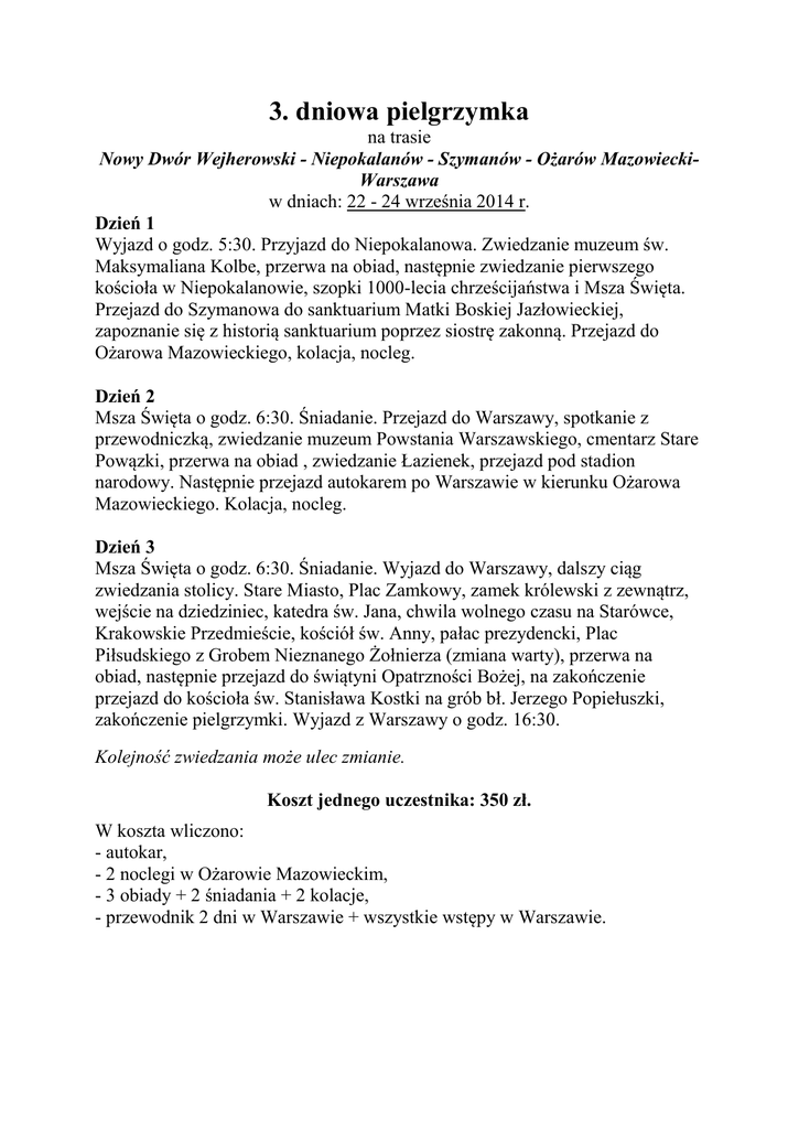 3. dniowa pielgrzymka na trasie Nowy Dwór Wejherowski - Niepokalanów - Szymanów - Ożarów MazowieckiWarszawa w dniach: 22 - 24 września 2014 r. Dzień 1 Wyjazd o godz. 5:30. Przyjazd do Niepokalanowa. Zwiedzanie muzeum św. Maksymaliana Kolbe, przerwa na obiad, następnie zwiedzanie pierwszego kościoła w Niepokalanowie, szopki 1000-lecia chrześcijaństwa i Msza Święta. Przejazd do Szymanowa do sanktuarium Matki Boskiej Jazłowieckiej, zapoznanie się z historią sanktuarium poprzez siostrę zakonną. Przejazd do Ożarowa Mazowieckiego, kolacja, nocleg. Dzień 2 Msza Święta o godz. 6:30. Śniadanie. Przejazd do Warszawy, spotkanie z przewodniczką, zwiedzanie muzeum Powstania Warszawskiego, cmentarz Stare Powązki, przerwa na obiad , zwiedzanie Łazienek, przejazd pod stadion narodowy. Następnie przejazd autokarem po Warszawie w kierunku Ożarowa Mazowieckiego. Kolacja, nocleg. Dzień 3 Msza Święta o godz. 6:30. Śniadanie. Wyjazd do Warszawy, dalszy ciąg zwiedzania stolicy. Stare Miasto, Plac Zamkowy, zamek królewski z zewnątrz, wejście na dziedziniec, katedra św. Jana, chwila wolnego czasu na Starówce, Krakowskie Przedmieście, kościół św. Anny, pałac prezydencki, Plac Piłsudskiego z Grobem Nieznanego Żołnierza (zmiana warty), przerwa na obiad, następnie przejazd do świątyni Opatrzności Bożej, na zakończenie przejazd do kościoła św. Stanisława Kostki na grób bł. Jerzego Popiełuszki, zakończenie pielgrzymki. Wyjazd z Warszawy o godz. 16:30. Kolejność zwiedzania może ulec zmianie. Koszt jednego uczestnika: 350 zł. W koszta wliczono: - autokar, - 2 noclegi w Ożarowie Mazowieckim, - 3 obiady + 2 śniadania + 2 kolacje, - przewodnik 2 dni w Warszawie + wszystkie wstępy w Warszawie.
