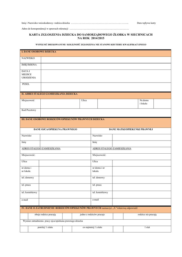 Imię i Nazwisko wnioskodawcy- rodzica dziecka …………………………………………………………….. Data wpływu karty Adres do korespondencji w sprawach rekrutacji ………………………………………………………………. KARTA ZGŁOSZENIA DZIECKA DO SAMORZĄDOWEGO ŻŁOBKA W SIECHNICACH NA ROK 2014/2015 WYPEŁNIĆ DRUKOWANYMI / KOLEJNOŚĆ ZGŁOSZENIA NIE STANOWI KRYTERIU KWALIFIKACYJNEGO I. DANE OSOBOWE DZIECKA NAZWISKO IMIĘ/IMIONA DATA I MIEJSCE URODZENIA PESEL II. ADRES STAŁEGO ZAMIESZKANIA DZIECKA Miejscowość Ulica Nr.domu i lokalu Kod Pocztowy III. DANE OSOBOWE RODZICÓW/OPIEKUNÓW PRAWNYCH DZIECKA DANE OJCA/OPIEKUNA PRAWNEGO DANE MATKI/OPIEKUNKI PRAWNEJ Nazwisko Nazwisko Imię Imię ADRES STAŁEGO ZAMIESZKANIA ADRES STAŁEGO ZAMIESZKANIA Miejscowość: Miejscowość: Ulica Ulica nr domu i nr lokalu nr domu i nr lokalu tel. domowy tel. domowy tel. praca tel. praca tel. komórkowy tel. komórkowy e-mail e-mail IV. DANE O ZATRUDNIENIU RODZICÓW/OPIEKUNÓW PRAWNYCH zaznaczyć ,,X "właściwą odpowiedź oboje rodzice pracują jedno z rodziców pracuje rodzice nie pracują Wymiar zatrudnienia pracy ojca/opiekuna prawnego dziecka poniżej ½ etatu co najmniej ½ etatu 1 etat Wymiar zatrudnienia pracy matki/opiekunki prawnej dziecka poniżej ½ etatu co najmniej ½ etatu 1 etat oboje rodziców studiuje jeden rodzic studiuje rodzice nie studiują V. MIEJSCE ZŁOŻENIA PRZEZ MATKĘ/OPIEKUNKĘ PRAWNĄ ROZLICZENIA PIT ZA ROK 2013 VI. MIEJSCE ZŁOŻENIA PRZEZ OJCA/OPIEKUNA PRAWNEGO ROZLICZENIA PIT ZA ROK 2013 Urząd Skarbowy: Urząd Skarbowy: VII.INFORMACJE DODATKOWE O DZIECKU I JEGO RODZINIE zaznaczyć ,,X "właściwą odpowiedź TAK NIE 1. Rodzice pracujący w systemie dziennym. 2. Niepełnosprawność obojga rodziców kandydata, wobec których orzeczono znaczy stopień niepełnosprawności lub całkowitą niezdolność do pracy. 3. Rodzice obejmujący dziecko pieczą zastępczą. 4. Rodzic samotnie wychowujący dziecko (oznacza to wychowanie dziecka przez pannę, kawalera, wdowę, wdowca, osobę pozostającą w separacji orzeczonej prawomocnym wyrokiem sądu, osobę rozwiedzioną, chyba, że osoba taka wychowuje wspólnie co najmniej jedno dziecko z jego rodzicem). 5. Posiadanie rodzeństwa w Żłobku/ zgłoszenie więcej niż jednego dziecka. 6. Niepełnosprawność dziecka. 7. Rodzice wraz z dzieckiem zameldowani w Gminie Siechnice. 8.Rodzice są płatnikami podatku od osób fizycznych na rzecz gminy Siechnice. 9.Wielodzietność rodziny dziecka (oznacza to rodzinę wychowującą troje i więcej dzieci) VIII.DEKLARACJA POBYTU GODZINNEGO DZIECKA W PLACÓWCE 8h zaznaczyć ,,X "właściwą odpowiedź 9h 10h Dodatkowe informacje, które mogą być istotne i ważne przy sprawowaniu opieki nad dzieckiem, (schorzenia, alergie, przebyte choroby zakaźne, funkcjonowanie, wymagana pomoc (podać w jakim zakresie itp................................................................................... ............................................................................................................................... ....................................................................................... ........................................................................................................................................................................ .............................................. .................................................................................................................................................................................................................. .... ............................................................................................................................. ......................................................................................... ............................................................................................................................. ......................................................................................... ............................................................................................................. ...................................................................................................... ... ............................................................................................................................. ......................................................................................... Uprzedzony o odpowiedzialności karnej (art. 233 k.k.) oświadczam, że podane dane są zgodne ze stanem faktycznym. Podanie nieprawdziwych informacji skutkuje odpowiedzialnością karną oraz skreśleniem z listy rekrutacyjnej. PODPIS OJCA/OPIEKUNA PRAWNEGO PODPIS MATKI/OPIEKUNKI PRAWNEJ IX. OŚWIADCZENIA RODZICÓW/OPIEKUNÓW PRAWNYCH 1.Wyrażam/y zgodę na zbieranie, przetwarzanie i wykorzystanie w celach związanych z przyjęciem i pobytem naszego dziecka, w Żłobku danych osobowych zgodnie z ustawą z dnia 29 sierpnia 1997 r. o ochronie danych osobowych (Dz. U. Nr 133, poz. 883). (Podpisy rodziców/opiekunów) Matki...................................................... Ojca .................................................... miejscowość.................................... data........................................... 2.Dane zawarte w niniejszej karcie służą wyłącznie do zawarcia umów na opiekę nad dzieckiem od 1.09.2014 do 31.08.2015 w Samorządowym Żłobku w Siechnicach na rok 2014/2015. 3. Do wniosku załączam wymagane dokumenty /wypisać/: 1............................................................................................................................................................................ 2............................................................................................................................................................................ 3................................................................................