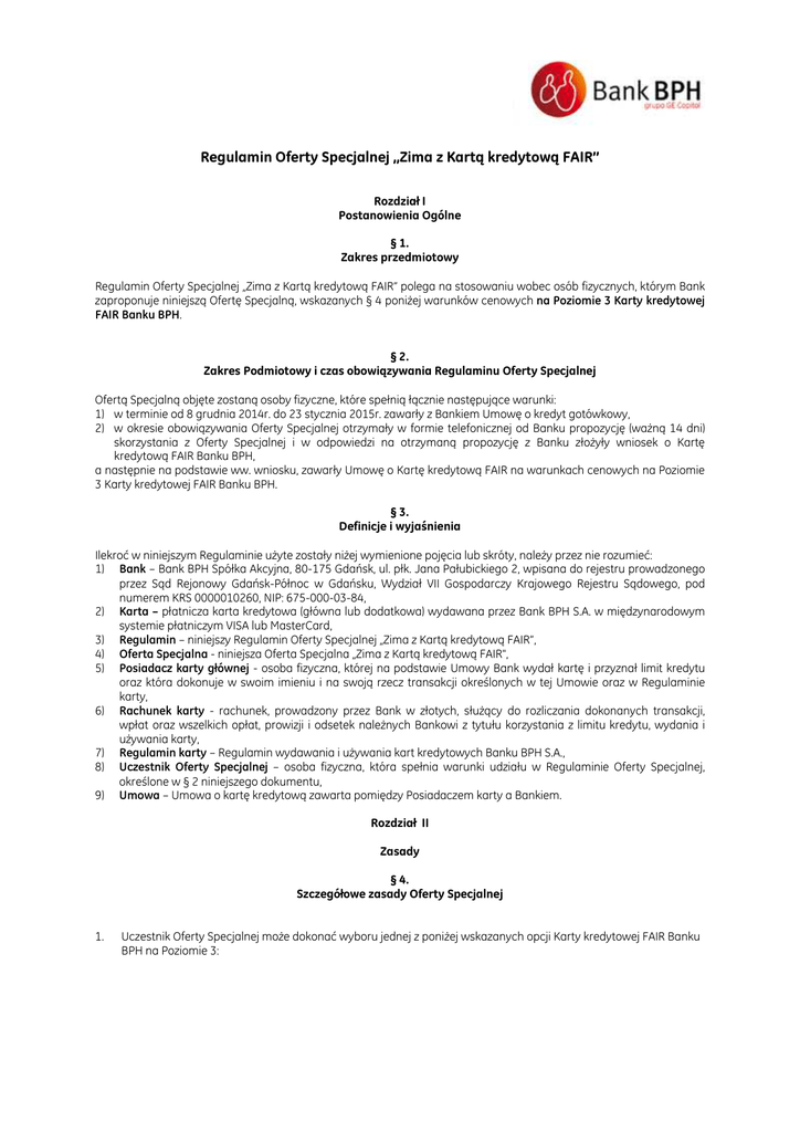 Regulamin Oferty Specjalnej „Zima z Kartą kredytową FAIR” Rozdział I Postanowienia Ogólne § 1. Zakres przedmiotowy Regulamin Oferty Specjalnej „Zima z Kartą kredytową FAIR” polega na stosowaniu wobec osób fizycznych, którym Bank zaproponuje niniejszą Ofertę Specjalną, wskazanych § 4 poniżej warunków cenowych na Poziomie 3 Karty kredytowej FAIR Banku BPH. § 2. Zakres Podmiotowy i czas obowiązywania Regulaminu Oferty Specjalnej Ofertą Specjalną objęte zostaną osoby fizyczne, które spełnią łącznie następujące warunki: 1) w terminie od 8 grudnia 2014r. do 23 stycznia 2015r. zawarły z Bankiem Umowę o kredyt gotówkowy, 2) w okresie obowiązywania Oferty Specjalnej otrzymały w formie telefonicznej od Banku propozycję (ważną 14 dni) skorzystania z Oferty Specjalnej i w odpowiedzi na otrzymaną propozycję z Banku złożyły wniosek o Kartę kredytową FAIR Banku BPH, a następnie na podstawie ww. wniosku, zawarły Umowę o Kartę kredytową FAIR na warunkach cenowych na Poziomie 3 Karty kredytowej FAIR Banku BPH. § 3. Definicje i wyjaśnienia Ilekroć w niniejszym Regulaminie użyte zostały niżej wymienione pojęcia lub skróty, należy przez nie rozumieć: 1) Bank – Bank BPH Spółka Akcyjna, 80-175 Gdańsk, ul. płk. Jana Pałubickiego 2, wpisana do rejestru prowadzonego przez Sąd Rejonowy Gdańsk-Północ w Gdańsku, Wydział VII Gospodarczy Krajowego Rejestru Sądowego, pod numerem KRS 0000010260, NIP: 675-000-03-84, 2) Karta – płatnicza karta kredytowa (główna lub dodatkowa) wydawana przez Bank BPH S.A. w międzynarodowym systemie płatniczym VISA lub MasterCard, 3) Regulamin – niniejszy Regulamin Oferty Specjalnej „Zima z Kartą kredytową FAIR”, 4) Oferta Specjalna - niniejsza Oferta Specjalna „Zima z Kartą kredytową FAIR", 5) Posiadacz karty głównej - osoba fizyczna, której na podstawie Umowy Bank wydał kartę i przyznał limit kredytu oraz która dokonuje w swoim imieniu i na swoją rzecz transakcji określonych w tej Umowie oraz w Regulaminie karty, 6) Rachunek karty - rachunek, prowadzony przez Bank w złotych, służący do rozliczania dokonanych transakcji, wpłat oraz wszelkich opłat, prowizji i odsetek należnych Bankowi z tytułu korzystania z limitu kredytu, wydania i używania karty, 7) Regulamin karty – Regulamin wydawania i używania kart kredytowych Banku BPH S.A., 8) Uczestnik Oferty Specjalnej – osoba fizyczna, która spełnia warunki udziału w Regulaminie Oferty Specjalnej, określone w § 2 niniejszego dokumentu, 9) Umowa – Umowa o kartę kredytową zawarta pomiędzy Posiadaczem karty a Bankiem. Rozdział II Zasady § 4. Szczegółowe zasady Oferty Specjalnej 1. Uczestnik Oferty Specjalnej może dokonać wyboru jednej z poniżej wskazanych opcji Karty kredytowej FAIR Banku BPH na Poziomie 3: Rodzaj produktu Warunki cenowe Karta Kredytowa FAIR Banku BPH Poziom 3 Opcja: Zmniejszające się opłaty i prowizje za korzystanie z karty 0 zł - za wypłatę gotówki z bankomatu, na poczcie, w kasie banku, 0 zł - za wznowienie karty głównej i dodatkowej, 0 zł - za wydanie karty dodatkowej, 0 zł - za polecenie przelewu z karty, 0 zł - za udostępnienie Limitu kredytu i obsługę Karty plastikowej ¹) albo Opcja: Rosnący zwrot za płatności kartą 3 % zwrotu od kwoty zakupów w wybranych punktach handlowo – usługowych (maksymalnie 75 zł kwartalnie) albo Opcja: Malejące oprocentowanie transakcji bezgotówkowych zmienne oprocentowanie Transakcji bezgotówkowych ²) stanowiące iloczyn stałego współczynnika Banku wynoszącego 2,5 oraz zmiennej stopy kredytu lombardowego NBP (2,5 x wysokość stopy kredytu lombardowego = %), 2. Karta kredytowa FAIR Banku BPH ma trzy poziomy. Uczestnik niniejszej Oferty Specjalnej w pierwszym dwunastomiesięcznym okresie trwania Umowy korzysta od razu z najwyższego poziomu - 3, o którym mowa w ust. 1 powyżej. Jeżeli we wskazanym okresie na Rachunku karty zaksięgowane zostaną Transakcje bezgotówkowe na łączną kwotę co najmniej 12 000 złotych oraz w tym okresie będzie spłacane terminowo zadłużenie, Bank utrzyma na kolejny dwunastomiesięczny okres trwania Umowy poziom 3. W przypadku niespełnienia wymogów wskazanych w zdaniu poprzedzającym, poziom ulegnie obniżeniu o jeden. Mechanizm funkcjonowania Karty kredytowej FAIR Banku BPH dla poszczególnych poziomów i opcji opisany jest w Umowie oraz na www.bph.pl. § 5. Termin obowiązywania Oferty Specjalnej Oferta Specjalna obowiązuje od dnia 16 grudnia 2014r. do dnia 16 lutego 2015r. § 6. Reklamacje 1. Reklamacje związane z niniejszą Ofertą Specjalną mogą być składane: 1) pocztą tradycyjną na adres korespondencyjny: 80-175 Gdańsk, ul. płk. Jana Pałubickiego 2, 2) telefonicznie, faksem lub pocztą elektroniczną (dane kontaktowe dostępne na stronie internetowej: www.bph.pl), 3) w placówkach Banku w formie pisemnej. 2. Reklamacje powinny być składane niezwłocznie po wystąpieniu okoliczności budzących wątpliwości Uczestnika Oferty Specjalnej. 3. Pisemna reklamacja powinna zawierać: 1) imię, nazwisko i adres do korespondencji składającego reklamację, 2) numer Umowy/ nr karty, 3) opis podstawy reklamacji, 4) wskazanie, że dotyczy Oferty Specjalnej „Zima z Kartą kredytową FAIR”. 4. Bank rozpatruje zgłoszoną reklamację niezwłocznie, jednak nie później niż w terminie 30 dni od jej otrzymania. W przypadku, gdy rozpatrzenie reklamacji nie będzie możliwe w terminie 30 dni z uwagi na złożoność sprawy, Bank poinformuje o tym Uczestnika, wskazując jednocześnie ostateczny termin udzielania odpowiedzi na reklamację, który nie może być dłuższy niż 90 dni od dnia otrzymania reklamacji. 5. W związku z rozpatrywaną reklamacją, Bank może zwrócić się do Uczestnika o dostarczenie dodatkowych informacji oraz posiadanej przez Uczestnika dokumentacji dotyczącej składanej reklamacji. 6. Bank poinformuje Uczestnika o rozpatrzeniu reklamacji w formie pisemnej (p
