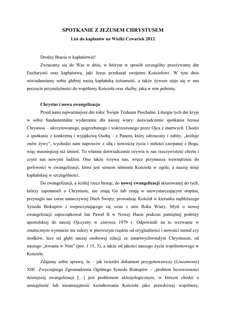 SPOTKANIE Z JEZUSEM CHRYSTUSEM List do kapłanów na Wielki Czwartek 2012 Drodzy Bracia w kapłaństwie! Zwracamy się do Was w dniu, w którym w sposób szczególny przeżywamy dar Eucharystii oraz kapłaństwa, jaki Jezus przekazał swojemu Kościołowi. W tym dniu uświadamiamy sobie głębiej naszą kapłańską tożsamość, a także żywsze staje się w nas poczucie przynależności do wspólnoty Kościoła oraz służby, jaką w nim pełnimy. Chrystus i nowa ewangelizacja Przed nami najważniejsze dni roku: Święte Triduum Paschalne. Liturgia tych dni kryje w sobie fundamentalne wydarzenie dla naszej wiary: doświadczenie spotkania Jezusa Chrystusa – ukrzyżowanego, pogrzebanego i wskrzeszonego przez Ojca z martwych. Chodzi o spotkanie z konkretną i wyjątkową Osobą – z Panem, który odrzucony i zabity, „króluje znów żywy”, wychodzi nam naprzeciw z siłą i nowością życia i miłości czerpanej z Boga, więc mocniejszej niż śmierć. To właśnie doświadczenie ożywia w nas rzeczywistość chrztu i czyni nas nowymi ludźmi. Ono także wzywa nas, wręcz przymusza wewnętrznie do gorliwości w ewangelizacji, która jest sensem istnienia Kościoła w ogóle, a naszej misji kapłańskiej w szczególności. Do ewangelizacji, a ściślej rzecz biorąc, do nowej ewangelizacji skierowanej do tych, którzy zapomnieli o Chrystusie, nie znają Go lub znają w niewystarczającym stopniu, przynagla nas coraz natarczywiej Duch Święty, prowadząc Kościół w kierunku najbliższego Synodu Biskupów i rozpoczynającego się wraz z nim Roku Wiary. Myśl o nowej ewangelizacji zapoczątkował Jan Paweł II w Nowej Hucie podczas pamiętnej podróży apostolskiej do naszej Ojczyzny w czerwcu 1979 r. Odpowiedź na to wezwanie w ostatecznym wymiarze nie zależy w pierwszym rzędzie od oryginalności i nowości metod czy środków, lecz od głębi naszej osobowej relacji ze zmartwychwstałym Chrystusem, od naszego „trwania w Nim” (por. J 15, 5), a także od jakości naszego życia wspólnotowego w Kościele. Zdajemy sobie sprawę, że – jak twierdzi dokument przygotowawczy (Lineamenta) XIII Zwyczajnego Zgromadzenia Ogólnego Synodu Biskupów – „problem bezowocności dzisiejszej ewangelizacji […] jest problemem eklezjologicznym, w którym chodzi o umiejętność lub nieumiejętność kształtowania Kościoła jako prawdziwej wspólnoty, 2 autentycznego braterstwa, jako ciała, a nie maszyny czy przedsiębiorstwa” (por. n. 2). W tym sensie powołanie do nowej ewangelizacji jest najpierw wielką łaską i szansą dla nas samych – dla pomnożenia osobistej wiary każdego z nas i dla pogłębienia rzeczywistych relacji we wspólnotach chrześcijańskich, które współtworzymy. Spotkać żywego Pana Teraz, w Święte Triduum, mamy szansę ponownego osobistego spotkania Pana, który nas powołuje i czyni apostołami. Warto więc jeszcze raz zapytać, jak dokonuje się owo spotkanie. Jakim rządzi się scenariuszem i jaką logiką? W poszukiwaniu odpowiedzi warto powrócić do wydarzenia, które w pewnym sensie pozostaje na zawsze wzorcem każdego z takich doświadczeń: do nawrócenia i powołania św. Pawła pod Damaszkiem. Pamiętamy, że Szaweł był człowiekiem – jak absolutna większość z nas – zawsze religijnym, pobożnym, uczestniczącym w kulcie, oddanym „Bożej sprawie”, wykształconym w teologii u najlepszego z mistrzów, modlącym się i składającym przepisane Prawem ofiary. Był ważną osobą w gronie religijnych liderów Izraela. Miał przy tym poczucie – i słusznie zachował je do końca życia – że jest w ten sposób prowadzony przez Boga i służy Mu „z czystym sumieniem” (por. 2 Tm 1, 3). A jednak na przedmieściach Damaszku czekało nań doświadczenie wiary, przy którym wszystko, co znał do tej pory, zdewaluowało się do wartości „śmieci” (por. Flp 3, 8). Odkrył to właśnie, że w wierze chodzi o spotkanie z osobą, że wiara nie jest ani systemem etycznym, ani światopoglądem, ani prawem, ani zbiorem „wartości” czy świętych „rzeczy”. Nie jest też posługiwaniem jakiejś instytucji czy „religią obywatelską” lub zaangażowaniem społecznym. Wiara nie jest niczym takim, a jeśli w jakiejś mierze jest, to tylko wtedy, gdy każda z tych rzeczywistości pojawia się w niej jako owoc naszej żywej relacji z osobowym Bogiem. Bez tej relacji wiara skupiona na „rzeczach”, „sprawach” i „wartościach”, nawet najświętszych, staje się ideologią, czyni nas fanatykami i ślepcami. Taką właśnie ślepotę musiał Szaweł odkryć na progu swego powołania na wielkiego ewangelizatora. Musiał zobaczyć, jak dalece się w życiu pomylił. Wydawało mu się, że służy Bogu, a tymczasem z Nim walczył, prześladował Go i kamienował. Myślał, że służy „sprawie” Boga, a w rzeczywistości zabijał Go obecnego w konkretnych ludziach. Przy całej swej gorliwości i religijnym oddaniu, nie budował ani nawet nie chronił wiary, lecz ją niszczył! Recytował codziennie „Słuchaj, Izraelu…, będziesz miłował!”, i „dyszał” morderczą nienawiścią. Miłość i nienawiść – postawy, których nie sposób przeżywać jednocześnie, w jego głowie zlały się jednak w jakąś dziwną syntezę, której karykaturalności 3 nie był w stanie sam zobaczyć. Odkrył mu ją dopiero Chrystus, nie szczędząc przy tym mocnych gestów: powalając go na ziemię i odbierając wzrok na trzy dni. Każdy z nas może sobie zadać bardzo osobiste pytanie: czy w moim życiu dokonało się takie spotkanie z Jezusem Chrystusem? Czy On rzeczywiście zawładnął całym moim życiem? Czy doświadczyłem osobiście, że to On uwolnił nas od tego wszystkiego, co krępuje ludzką wolność, co nie pozwala mi uczynić z siebie bezinteresownego daru dla Boga i bliźnich? Czy pasją mojego kapłańskiego życia stała się sprawa człowieka, dla której Syn Boży przyszedł na ziemię? A przede wszystkim, czy moja