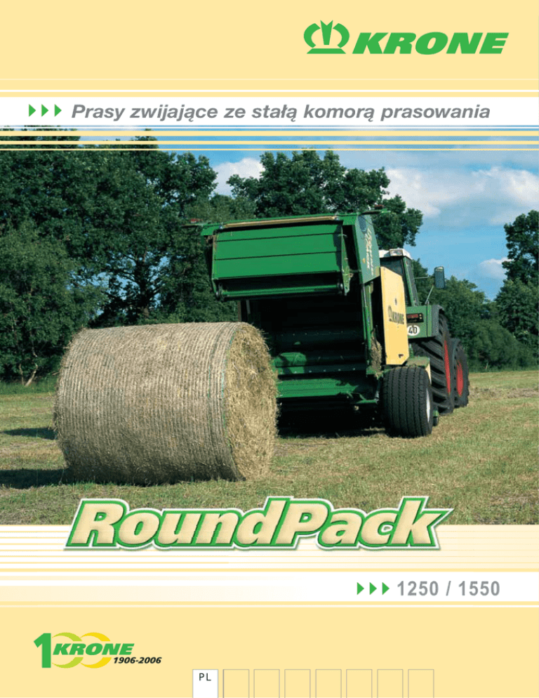Prasy zwijające ze stałą komorą prasowania PL 1250 / 1550 Round Pack – perfekcyjna praca przy zbiorze Silne argumenty ! • Stała komora prasowania Round Pack 1250: bele Ø 1,25 x 1,20 m Round Pack 1550: bele Ø 1,55 x 1,20 m • Całkowicie zamknięta komora prasowania z obiegającym dokoła przenośnikiem łańcuchowo – listwowym - bardzo dobra praca przy zbiorze paszy przeznaczonej na sianokiszonkę, siano oraz przy zbiorze słomy - bez zatrzymywania bel - zwięzłe bele o stabilnych kształtach - bele o dużej masie - niewielkie straty wskutek kruszenia się - niewielkie zapotrzebowanie mocy • Ocynkowane podbieracze z 5 rzędami palców, o szerokości roboczej 1,95 m wg DIN 11220 • Wirnik transportowy albo tnący zapewniający ciągły przepływ materiału z podbieracza do komory prasowania • Hydrauliczny mechanizm zmiany kierunku obrotów wirnika tnącego jako opcja • Automatyczne smarowanie łańcucha • Duży zasobnik na 10 rolek sznurka albo 2 rolki siatki • Komfortowe skrzynki obsługowe „Medium” albo „Comfort”, z automatycznym włączaniem wiązania • Zespół rozdrabniający MultiCut, wyposażony maks. w 17 noży • Włączanie noży w grupach 17 – 15 – 7 – 0 • Hydrauliczne załączanie położenia 0 noży • Całkowicie automatyczne zabezpieczenie przed ciałami obcymi „Non-Stop” • Wyrzutnik bel KRONE MiniStop ze stołem rozładunkowym, pozwalający uzyskać większą liczbę bel w ciągu godziny • Oś tandemowa jako opcja sianokiszonki, siana Wykorzystać przewagę oferowaną przez KRONE ! Najwyższe wydajności prasowania paszy przeznaczonej na sianokiszonkę, siano oraz słomy, bezawaryjna praca oraz duża łatwość obsługi i serwisowania – są to wyróżniające cechy pras zwijających ze stałą komorą prasowania firmy KRONE. Modułowa konstrukcja ułatwia wyposażenie w wiele praktycznych wariantów osprzętu. Mogą Państwo skompletować swoją prasę wg swoich życzeń. Wyposażenie, jak np. rotacyjny zespół rozdrabniający MultiCut, mechanizm do podwójnego wiązania sznurkiem albo owijania folią, urządzenie MiniStop z wyrzutnikiem bel ze stołem rozładunkowym, oś tandemowa oraz skrzynki obsługowe „Basis”, „Medium” albo „Comfort” zapewniają szczególną wydajność maszyny i spełniają całkowicie Państwa życzenia. Na bezpiecznej stopie: do odczepiania prasy zwijającej służy solidna stopa podporowa o regulowanej wysokości, posiadająca składany stopień. Regulację przeprowadza się bezstopniowo za pomocą wrzeciona. ładne k o d dzie Wszę bieranie ! pod Ocynkowany podbieracz, posiadający 5 rzędów palców, podbiera bardzo dokładnie również krótką zielonkę. Automatyczne napinanie łańcucha, koła kopiujące na pneumatykach oraz hydrauliczne podnoszenie należą do wyposażenia seryjnego. Podbieracz z bocznymi ślimakami zwężającymi pokos jest bardzo szeroki. Duża szerokość robocza, wynosząca 1,95 m wg DIN 11220, jest korzystna w narożnikach i na zakrętach. Ten podbieracz pracuje bardzo dokładnie. Jarzmo, zaczep wychylny albo hak zaczepu: wysokość dyszla można bezstopniowo regulować za pomocą segmentów zapadkowych. Np. jeżeli przy zmianie ciągnika trzeba przełożyć dyszel z jarzma na niżej położony zaczep wychylny, wówczas przy użyciu dyszla KRONE nie stanowi to problemu. Z pełną mocą: umieszczona w ramie główna przekładnia przyjęciowa (540 obr/min) jest umieszczona w środku maszyny. Obustronne odbiory napędu zapewniają bezpośrednie i krótkie drogi przenoszenia napędu i gwarantują optymalny rozdział mocy. gnie ! ą i c o On p Tu wszystko idzie dobrze: zawsze ciągły przepływ materiału dzięki rolkowemu dociskaczowi. Nie występuje zjawisko rozsuwania paszy w przypadku wałów o nierównej grubości. Zawsze pełna moc przy najwyższej wydajności. Nawet bez zespołu rozdrabniającego prasy zwijające Round Pack 1250 i 1550 firmy KRONE są wyposażone seryjnie w wirnik podający pomiędzy podbieraczem i komorą prasy. Ciągłe doprowadzanie materiału zwiększa wydajność. Przenośnik łańcuchowo – listwowy KRONE – ze Koncepcja KRONE z całkowicie zamkniętą komorą prasowania i przenośnikiem łańcuchowo – listwowym sprawdziła się doskonale od wielu lat na całym świecie, w najróżniejszych warunkach eksploatacyjnych, przy zbiorze paszy na sianokiszonkę, siano oraz przy zbiorze słomy. Prasy zwijające KRONE są zwycięskimi typami i w wielu krajach liderami rynkowymi. Bezspornymi zaletami tych maszyn są: równomiernie uformowane, twarde i stabilne bele oraz praca bez zatrzymywania bel – również w przypadku krótkiego i suchego materiału. Do tego dochodzą minimalne straty powstające wskutek kruszenia się, mniejsze pylenie i wreszcie mniejsze zapotrzebowanie mocy. Poza tym prasy zwijające przekonują swoją prostą i funkcjonalną budową. Pewny start beli: Round Pack dysponuje nie tylko walcem startowym wyposażonym w listwy, ale posiada dodatkowo walec spiralny, ze zgarniakami. Zapewnia to szybki start beli i optymalizuje proces prasowania. Całkowicie pod napięciem: mechanizm napinający łańcuch przenośnika łańcuchowo – listwowego działa automatycznie. Sprężyny posiadają duży zakres napinania. Zawsze optymalne napięcie łańcucha zwiększa jego trwałość i zapewnia dodatkowe bezpieczeństwo. ściśniętą siłą do przodu ! ! obrót y z s Lep Typowe dla KRONE: całkowicie zamknięta komora prasowania z obiegającym dookoła przenośnikiem łańcuchowo – listwowym w Round Pack. Przenośnik formuje w komorze prasowania dostarczany przez podbieracz materiał, warstwa za warstwą, w mocne, stabilne bele. Dużą zaletą przenośnika łańcuchowo – listwowego są doskonałe właściwości transportowe. Materiał załadowany do komory zaczyna się wcześniej obracać. Bela rozpoczyna się szybciej formować. Rdzeń beli jest twardszy. Bela ma większą gęstość i tym samym większy ciężar – a
