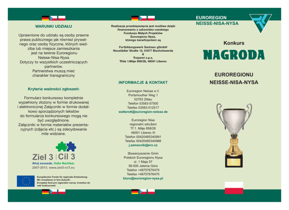 WARUNKI UDZIAŁU Uprawnione do udziału są osoby prawne prawa publicznego jak również prywatnego oraz osoby fizyczne, których siedziba lub miejsce zamieszkania jest na terenie Euroregionu Neisse-Nisa-Nysa Dotyczy to wszystkich uczestniczących partnerów. Partnerstwa muszą mieć charakter transgraniczny Realizacja przedsięwzięcia jest możliwa dzięki finansowaniu z saksońsko-czeskiego Funduszu Małych Projektów Euroregionu Nysa, którego beneficjentem są Fortbildungswerk Sachsen gGmbH Neustädter Straße 12, 01877 Bischofswerda & Trojzemí o.p.s. Třída 1.Máje 858/26, 46001 Liberec Formularz konkursowy kompletnie wypełniony złożony w formie drukowanej i elektronicznej Załączniki w formie dodatkowo sporządzonych tekstów do formularza konkursowego mogą nie być uwzględnione. Załączniki w formie materiałów prezentacyjnych (zdjęcia etc.) są zdecydowanie mile widziane. Europäischer Fonds für regionale Entwicklung: Wir investieren in Ihre Zukunft Evropský fond pro regionální rozvoj: Investice do vaší budoucnosti Konkurs NAGRODA EUROREGIONU INFORMACJE & KONTAKT Kryteria ważności zgłoszeń: EUROREGION NEISSE-NISA-NYSA Euroregion Neisse e.V. Portsmouther Weg 1 02763 Zittau Telefon 03583-57500 Telefax 03583-512517 [email protected] Euroregion Nisa regionalni sdruñeni TÍ.1. Máje 858/26 46001 Liberec III Telefon 00420485340991 Telefax 00420485340988 [email protected] Stowarzyszenie Gmin Polskich Euroregionu Nysa ul. 1 Maja 57 58-500 Jelenia Góra Telefon +48757676470 Telefax +48757676470 [email protected] NEISSE-NISA-NYSA W roku 2009 po raz drugi zostanie przyznana trójstronna NAGRODA EUROREGIONU NEISSE-NISA-NYSA w kategoriach LAUREACI Uczestnicy każdego z nagrodzonych partnerstw otrzymają dyplom oraz symboliczną nagrodę. rzeczową. Nagroda 2009 będzie wykonana z materiału typowego dla Górnych Łużyc. Edukacja Zgłoszenia zostaną ocenione przez trójnarodowe Jury, złożone z niemieckich, czeskich i polskich ekspertów, reprezentujących powiaty, gminy, izby i organizacje z najróżniejszych dziedzin. Nagroda rzeczowa 2008 szkło czeskie Informacje o zwycięzcach zostaną podane przez organizatrów Konkursu do publicznej wiadomości, otrzymają również prawo do posługiwania się tytułem „Laureat Nagrody Euroregionu Neisse-Nisa-Nysa 2009 Partnerstwo komunalne Zdrowie i bezpieczeństwo TRÓJNARODOWE JURY UROCZYSTOŚĆ WRĘCZENIA NAGRÓD Uroczyste wręczenie nagród laureatom Konkursu odbędzie się 17.12.2009 w Bischofswerdzie. Konkurs swoim patronatem objęło Prezydium Euroregionu w składzie: Turystyka i Sport Kultura Celem Konkursu jest uznanie i uhonorowanie wyróżniających się starań i aktywności na rzecz współpracy transgranicznej, jak również promocja i popularyzacja przykładów skutecznych partnerstw godnych naśladowania. Landrat Bernd Lange (D) Petr Skokan (CZ) Prezydent Piotr Roman (PL) Zgłoszenia można składać do 30 września 2009 w biurach Euroregionu. www.neisse-nisa-nysa.org