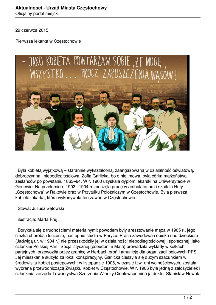 Aktualności - Urząd Miasta Częstochowy Oficjalny portal miejski 29 czerwca 2015 Pierwsza lekarka w Częstochowie Była kobietą wyjątkową – starannie wykształconą, zaangażowaną w działalność oświatową, dobroczynną i niepodległościową. Zofia Garlicka, bo o niej mowa, była córką małżeństwa zesłańców po powstaniu 1863–64. W r. 1900 uzyskała dyplom lekarski na Uniwersytecie w Genewie. Na przełomie r. 1903 i 1904 rozpoczęła pracę w ambulatorium i szpitalu Huty „Częstochowa” w Rakowie oraz w Przytułku Położniczym w Częstochowie. Była pierwszą kobietą lekarką, która wykonywała ten zawód w Częstochowie. Słowa: Juliusz Sętowski ilustracja: Marta Frej Borykała się z trudnościami materialnymi; powodem były aresztowanie męża w 1905 r., jego ciężka choroba i leczenie, następnie studia w Paryżu. Praca zawodowa i opieka nad dzieckiem (Jadwigą ur. w 1904 r.) nie przeszkodziły jej w działalności niepodległościowej i społecznej: jako członkini Polskiej Partii Socjalistycznej (pseudonim Mata) prowadziła wykłady w kółkach partyjnych, przewoziła przez granicę w Herbach broń i amunicję dla organizacji bojowych PPS. Jej mieszkanie służyło za lokal konspiracyjny. Garlicka cieszyła się dużym szacunkiem w środowisku kobiet postępowych: w listopadzie 1905, w czasie tzw. dni wolnościowych, została wybrana przewodniczącą Związku Kobiet w Częstochowie. W r. 1906 była jedną z założycielek i członkinią zarządu Towarzystwa Szerzenia Wiedzy.Ciepłowspomina ją doktor Stanisław Nowak: 1/2 Aktualności - Urząd Miasta Częstochowy Oficjalny portal miejski była ideową socjalistką, bardzo ofiarną działaczką, osobą miłą, poważną i bardzo inteligentną. Z Częstochowy wyjechała na początku 1907 r., pracowała jako lekarka fabryczna w Łodzi, później była organizatorką i kierowniczką Przytułku Położniczego, inicjatorką tworzenia żłobków przyfabrycznych. Jako działaczka „Kropli Mleka” pomagała matkom i dzieciom z rodzin najbiedniejszych. Ideę opieki nad matką i dzieckiem propagowała w latach 20. i 30. w Warszawie. W czasie okupacji niemieckiej ukrywała Żydów i zbiegłych jeńców angielskich, działała w ZWZ-AK. Zginęła w obozie koncentracyjnym w Auschwitz. Jej okupacyjne losy opisała Maria Dąbrowska w opowiadaniu W piękny letni poranek. Pozostałe aktualności 2/2 Powered by TCPDF (www.tcpdf.org)