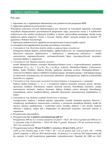 1. Zajęcia organizacyjne Plan zajęć: 1. Zapoznanie się z regulaminem laboratorium oraz podstawowymi przepisami BHP 2. Ogłoszenie podstawowych kryteriów oceny: Warunkiem zaliczenia ćwiczeń laboratoryjnych jest obecność na wszystkich zajęciach, wykonanie wszystkich eksperymentów przewidzianych programem zajęć, pozytywna ocena z 4 kolokwiów wejściowych oraz analiza uzyskanych wyników w formie sprawozdania pisemnego. Każdą ocenę negatywną należy poprawić. Ocena z ćwiczeń „bardzo dobra” pozwala podejść do terminu ”0” egzaminu z Podstaw Enzymologii. 3. Ogłoszenie podstawowych zagadnień do przygotowania na poszczególne zajęcia (o szczegółowych zagadnieniach decyduje prowadzący ćwiczenia). • Ćwiczenie nr 2 pt. Hydroliza lipidów mleka za pomocą lipazy trzustkowej: biologiczne funkcje lipidów, podział lipidów, ogólna budowa tri-, di- i monoacylogliceroli, kwasy tłuszczowe nasycone (palmitynowy i stearynowy) i nienasycone (oleinowy) – zasady nazewnictwa, regiospecyficzność, acylospecyficzność lipaz, stereospecyficzość enzymów, trawienie lipidów w organizmie • Ćwiczenie nr 3 pt. Badanie kinetyki enzymów: model Michaelisa-Menten, równanie Michaelisa-Menten (wraz z wyprowadzeniem), parametry kinetyczne (Vmax, kcat = Vmax/E0, KM i kcat/KM), wykresy: Michaelisa-Menten, LineweaveraBurka, Eadie Hoffstee, Hanesa–Woolfa, graficzna ilustracja (wykres Michaelisa-Menten i Lineweavera-Burka) wpływu inhibitora kompetycyjnego, akompetycyjnego i niekompatycyjnego na aktywność enzymatyczną, cel stosowania substratów chromogeniczny, budowa p-nitroanilidu benzoilio-D,L-argininy • Ćwiczenie nr 4 pt. Oznaczanie zawartości kwaśnej fosfatazy w homogenacie z ziemniaka: budowa białek (struktury 1-, 2-, 3- i 4-rzędowe), budowa enzymów (enzymy proste, złożone, apoenzym, kofaktor, holoenzym), miejsce aktywne enzymu, klasyfikacja enzymów, zasady nazewnictwa enzymów, budowa lizosomu, funkcje fosfataz, prawa absorpcji (absorbancja, transmitancja, prawo Lamberta-Beera), jednostki aktywności enzymatycznej (standardowa U, katal). • Ćwiczenie nr 5 pt. Badanie rozkładu skrobi przez α-amylazę: występowanie, budowa i funkcje amylaz, optymalne warunki działania amylazy ślinowej i trzustkowej, przykładowe zastosowanie α-amylazy w przemyśle (produkcja alkoholi, środki do mycia), enzymy produkowane i wydzielane przez trzustkę, budowa i rola skrobi, budowa dekstryn i maltozy, wpływ pH i temperatury na aktywność enzymów, trawienie cukrów w organizmie 4. Przygotowanie odczynników: • Przygotowanie 0,1 M buforu cytrynianowego pH 5,2 Przygotować 200 mL 0,1 M kwas cytrynowy (C6H8O7 × H2O , M=210,14 g/mol) oraz 400 mL 0,1 M cytrynian sodu (C6H5O7Na3 × 2H2O M=294,12 g/mol). Zmieszać 170 mL roztworu kwasu i 387,3 mL roztworu soli. • Przygotowanie buforu: 50 mM Tris/HCl z dodatkiem 20 mM CaCl2, pH 8,3 6,055 g Tris (Trizma base, CAS 77-86-1, M = 121,14 g/mol) oraz 2,22 g CaCl2 (M = 110,98 g/mol) rozpuścić w 950 mL H2O destylowanej. Za pomocą 2 M roztworu HCl doprowadzić pH do wartości 8,3 (pH kontrolować papierkami wskaźnikowymi). Dopełnić do 1000 mL H2O. Dodać 2 krople Tritonu X-100 zapobiegającego agregacji białka oraz jego adsorpcji na ściankach kuwet. • Przygotowanie buforu: 40 mM weronal z dodatkiem 20 mM CaCl2, pH 8,3 3,7 g weronalu (M.W.=184,19 g/mol, CAS 57-44-3, UWAGA: rozpuszczalność w wodzie wynosi 7,46 g/L) oraz 1,11 g CaCl2 rozpuścić w 450 mL H2O destylowanej. Za pomocą 5 M roztworu NaOH (5g/25 mL H2O) doprowadzić pH do wartości 8,3. Dopełnić do 500 mL H2O. Dodać 2 krople Tritonu X-100 (zapobiega adsorpcji białka na ściankach kuwet). • Przygotowanie wodnego roztworu HCl pH 3 z dodatkiem 20 mM CaCl2 Do 250 mL H2O destylowanej dodać 23 µ L stężonego 36% kwasu solnego. Wartość pH określić za pomocą papierka wskaźnikowego. Do 250 mL roztworu HCl pH 3 dodajemy 555 mg CaCl2. • Przygotowanie buforów McIlvaina (ćwiczenie 5) Przygotować 600 mL 0,1 M kwasu cytrynowego (C6H8O7 × H2O , M=210,14 g/mol) oraz 300 mL 0,2 M Na2HPO4 (M=141,96 g/mol). Przygotowanie buforu o pH 3 – zmieszać 317,8 mL roztworu kwasu cytrynowego i 82,2 mL roztworu Na2HPO4. Przygotowanie buforu o pH 5 – zmieszać 194,0 mL roztworu kwasu cytrynowego i 206,0 mL roztworu Na2HPO4.