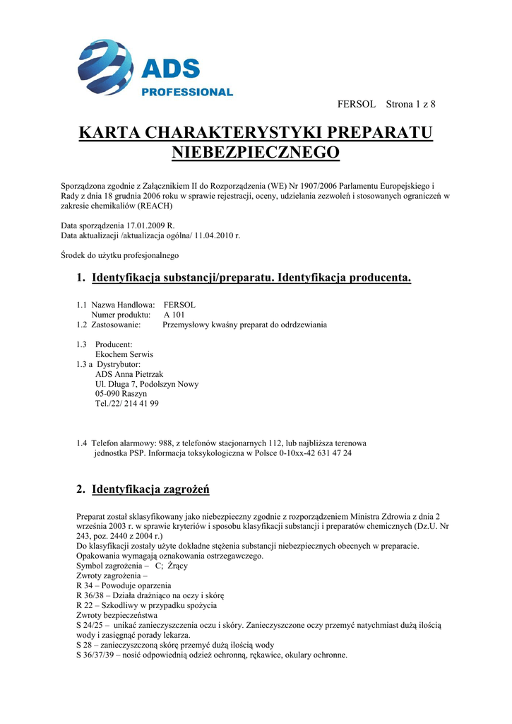 FERSOL Strona 1 z 8 KARTA CHARAKTERYSTYKI PREPARATU NIEBEZPIECZNEGO Sporządzona zgodnie z Załącznikiem II do Rozporządzenia (WE) Nr 1907/2006 Parlamentu Europejskiego i Rady z dnia 18 grudnia 2006 roku w sprawie rejestracji, oceny, udzielania zezwoleń i stosowanych ograniczeń w zakresie chemikaliów (REACH) Data sporządzenia 17.01.2009 R. Data aktualizacji /aktualizacja ogólna/ 11.04.2010 r. Środek do użytku profesjonalnego 1. Identyfikacja substancji/preparatu. Identyfikacja producenta. 1.1 Nazwa Handlowa: FERSOL Numer produktu: A 101 1.2 Zastosowanie: Przemysłowy kwaśny preparat do odrdzewiania 1.3 Producent: Ekochem Serwis 1.3 a Dystrybutor: ADS Anna Pietrzak Ul. Długa 7, Podolszyn Nowy 05-090 Raszyn Tel./22/ 214 41 99 1.4 Telefon alarmowy: 988, z telefonów stacjonarnych 112, lub najbliższa terenowa jednostka PSP. Informacja toksykologiczna w Polsce 0-10xx-42 631 47 24 2. Identyfikacja zagrożeń Preparat został sklasyfikowany jako niebezpieczny zgodnie z rozporządzeniem Ministra Zdrowia z dnia 2 września 2003 r. w sprawie kryteriów i sposobu klasyfikacji substancji i preparatów chemicznych (Dz.U. Nr 243, poz. 2440 z 2004 r.) Do klasyfikacji zostały użyte dokładne stężenia substancji niebezpiecznych obecnych w preparacie. Opakowania wymagają oznakowania ostrzegawczego. Symbol zagrożenia – C; Żrący Zwroty zagrożenia – R 34 – Powoduje oparzenia R 36/38 – Działa drażniąco na oczy i skórę R 22 – Szkodliwy w przypadku spożycia Zwroty bezpieczeństwa S 24/25 – unikać zanieczyszczenia oczu i skóry. Zanieczyszczone oczy przemyć natychmiast dużą ilością wody i zasięgnąć porady lekarza. S 28 – zanieczyszczoną skórę przemyć dużą ilością wody S 36/37/39 – nosić odpowiednią odzież ochronną, rękawice, okulary ochronne. FERSOL Strona 2 z 8 S 46 – w razie połknięcia niezwłocznie zasięgnij porady lekarza – pokaż opakowanie lub etykietę S 51 – stosować wyłącznie w dobrze wentylowanych pomieszczeniach Właściwości niebezpieczne: Nieznane Zagrożenie środowiska: Nieznane 3. Skład i informacja o składnikach Niejonowe środki powierzchniowo czynne, kwasy organiczne i nieorganiczne, rozpuszczalniki rozpuszczalne w wodzie. Składniki niebezpieczne: Niejonowe środki powierzchniowo czynne, CAS -----, WE polimer Xi; R 36/38 Zakres stężenia: < 10% Kwas fosforowy (V), CAS 7664-38-2, WE 231-633-2 C; R 34 Zakres stężenia: < 50% Kwas cytrynowy, CAS 5949-29-1, WE 201-069-1 Xi; R 36 Zakres stężenia: < 15% 2-butoksyetanol, CAS 111-76-2, WE 203-905-0 Xn; R 20/21/22, Xi; R 36/38 Zakres stężenia: < 10% 4. Pierwsza pomoc Po wdychaniu: Osobę poszkodowaną wyprowadzić na świeże powietrze, a w razie konieczności wezwać lekarza Po kontakcie ze skórą: Zanieczyszczoną odzież natychmiast zdjąć, a następnie przemyć skórę wodą z mydłem i spłukać obficie wodą. Po kontakcie z oczami: Zanieczyszczone oczy przemyć natychmiast dużą ilością wody przez kilka minut i zasięgnąć porady lekarza Po spożyciu: Płukać jamę ustną wodą, ale nie pić. Nie wywoływać wymiotów i natychmiast skontaktować się z lekarzem. 5. Postępowanie w wypadku pożaru FERSOL Strona 3 z 8 Sam produkt jest niepalny: pożar w otoczeniu gasić środkami odpowiednimi dla przyczyny pożaru. Nie należy przebywać w strefie zagrożonej ogniem bez odpowiedniego ubrania oraz aparatu do oddychania z należytym obiegiem powietrza. Zagrożone temperaturą pojemniki polewać rozpylonym strumieniem wody. Nie należy dopuścić do przedostania się wody gaśniczej do kanalizacji, wód powierzchniowo-gruntowych. 6. Postępowanie w przypadku niezamierzonego uwolnienia do środowiska Środki ochrony osobistej: Unikać zanieczyszczenia oczu i skóry Nosić odpowiednie ubranie ochronne Usunąć źródła zapłonu – nie palić Zapewnić dobrą wentylację Zabezpieczenie środowiska Zapobiegać przedostawaniu się preparatu do wód gruntowych, cieków i kanalizacji Metoda oczyszczania Zbierać przy pomocy sorbentu (piasek, ziemia okrzemkowa, sorbenty chemiczne) 7. Postępowanie z preparatem i jego magazynowanie Podczas stosowania i przechowywania preparatu stosować ogólnie obowiązujące przepisy bezpieczeństwa i higieny pracy (Rozp. MP i PS Dz.U.Nr 129, poz.844 z 1997 r.,Dz.U.Nr 91, poz 811 z 2002 r. ze zmianami Dz.U.Nr 169, poz. 1650 z 2003 r.) Postępowanie z preparatem: Unikać zanieczyszczenia oczu i skóry Magazynowanie: Przechowywać w szczelnie zamkniętych, oryginalnych opakowaniach, najlepiej w temperaturze pokojowej. Nie przechowywać razem z artykułami spożywczymi i silnymi zasadami 8. Kontrola narażenia i środki ochrony indywidualnej Zalecane procedury monitoringu narażenia w środowisku pracy zgodnie z Rozp. Ministra Zdrowia z dnia 20.04. 2005 r. w sprawie badań i pomiarów czynników szkodliwych dla zdrowia w środowisku pracy, Dz.U. nr 73, poz. 645; Rozp. Ministra Pracy i Polityki Społecznej z dnia 29 listopada 2002 r., Dz.U.217, poz.1833 w sprawie najwyższych dopuszczalnych stężeń i natężeń czynników szkodliwych dla zdrowia w środowisku pracy. Parametry kontroli niebezpiecznych składników w miejscu pracy: Stosowane środki ochrony osobistej powinny spełniać wymogi z Rozp. Ministra Gospodarki z dnia 21 grudnia 2005 r. w sprawie zasadniczych wymagań dla środków ochrony indywidualnej, Dz.U.Nr 259 poz. 2173. FERSOL Strona 4 z 8 Kwas fosforowy (V) NDS – 1 mg/m³, NDSCh – 2 mg/m³ 2-butoksyetanol, NDS – 98 mg/m³, NDSCh – 200 mg/m³ Środki ochrony indywidualnej: Ochrona dróg oddechowych: nie konieczna w przypadku dobrej wentylacji Ochrona rąk: rękawice ochronne nitrylowe, kat III Ochrona oczu: okulary ochronne Stosowane środki ochrony osobistej powinny spełniać wymogi z Rozp. Ministra Gospodarki z dnia 21 grudnia 2005 r. w sprawie zasadniczych wymagań dla środków ochrony indywidualnej, Dz.U.Nr 259 poz. 2173. 9. Właściwości fizykochemiczne Postać: ciekła Barwa: transparentna Zapach: char