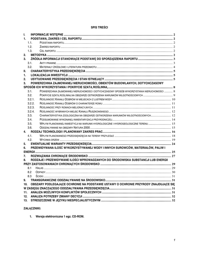 SPIS TREŚCI I. 1. INFORMACJE WSTĘPNE ................................................................................................................................. 2 PODSTAWA, ZAKRES I CEL RAPORTU ............................................................................................................ 2 1.1. PODSTAWA RAPORTU................................................................................................................................. 2 1.2. ZAKRES RAPORTU ..................................................................................................................................... 2 1.3. CEL RAPORTU .......................................................................................................................................... 2 2. METODYKA ..................................................................................................................................................... 2 3. ŹRÓDŁA INFORMACJI STANOWIĄCE PODSTAWĘ DO SPORZĄDZENIA RAPORTU ......................................... 3 3.1. AKTY PRAWNE .......................................................................................................................................... 3 3.2. MATERIAŁY ŹRÓDŁOWE I LITERATURA PRZEDMIOTU .......................................................................................... 4 II. CHARAKTERYSTYKA PRZEDSIĘWZIĘCIA ....................................................................................................... 5 1. LOKALIZACJA INWESTYCJI ............................................................................................................................ 5 2. USYTUOWANIE PRZEDSIĘWZIĘCIA I STAN ISTNIEJĄCY ................................................................................. 5 3. POWIERZCHNIA ZAJMOWANEJ NIERUCHOMOŚCI, OBIEKTÓW BUDOWLANYCH, DOTYCHCZASOWY SPOSÓB ICH WYKORZYSTANIA I POKRYCIE SZATĄ ROŚLINNĄ ............................................................................. 8 3.1. POWIERZCHNIA ZAJMOWANEJ NIERUCHOMOŚCI I DOTYCHCZASOWY SPOSÓB WYKORZYSTANIA NIERUCHOMOŚCI .......... 8 3.2. POKRYCIE SZATĄ ROŚLINNĄ NA OBSZARZE ODTWORZENIA WARUNKÓW WILGOTNOŚCIOWYCH ................................... 9 3.2.1. ROŚLINNOŚĆ KANAŁU DOBRÓW W MIEJSCACH Z LUSTREM WODY...................................................................... 10 3.2.2. ROŚLINNOŚĆ KANAŁU DOBRÓW O CHARAKTERZE ROWU ................................................................................. 11 3.2.3. ROŚLINNOŚĆ PRZY ROWACH MELIORACYJNYCH ............................................................................................. 11 3.2.4. ROŚLINNOŚĆ WYBRANYCH MIEJSC KANAŁU RUSZKOWSKIEGO .......................................................................... 12 3.3. CHARAKTERYSTYKA ZOOLOGICZNA NA OBSZARZE ODTWORZENIA WARUNKÓW WILGOTNOŚCIOWYCH........................ 12 3.4. PODSUMOWANIE WYKONANEJ INWENTARYZACJI PRZYRODNICZEJ...................................................................... 14 3.5. WPŁYW PLANOWANEJ INWESTYCJI NA WARUNKI HYDROLOGICZNE I HYDROGEOLOGICZNE TERENU ........................... 15 3.6. ODDZIAŁYWANIE NA OBSZARY NATURA 2000 ................................................................................................ 15 4. RODZAJ TECHNOLOGII I PLANOWANY ZAKRES PRAC ................................................................................. 16 4.1. WPŁYW PLANOWANEGO PRZEDSIĘWZIĘCIA NA TERENY PRZYLEGŁE ................................................................... 18 4.2. WYCINKA DRZEW .................................................................................................................................... 19 5. EWENTUALNE WARIANTY PRZEDSIĘWZIĘCIA .............................................................................................. 24 6. PRZEWIDYWANA ILOŚĆ WYKORZYSTYWANEJ WODY I INNYCH SUROWCÓW, MATERIAŁÓW, PALIW I ENERGII ................................................................................................................................................................. 25 7. ROZWIĄZANIA CHRONIĄCE ŚRODOWISKO .................................................................................................. 27 8. RODZAJE I PRZEWIDYWANE ILOŚCI WPROWADZANYCH DO ŚRODOWISKA SUBSTANCJI LUB ENERGII PRZY ZASTOSOWANIACH CHRONIĄCYCH ŚRODOWISKO .................................................................................... 29 8.1 HAŁAS ....................................................................................................................................................... 29 8.2 ODPADY..................................................................................................................................................... 30 8.3 ŚCIEKI ....................................................................................................................................................... 31 9. TRANSGRANICZNE ODDZIAŁYWANIE NA ŚRODOWISKO.............................................................................. 31 10. OBSZARY PODLEGAJĄCE OCHRONIE NA PODSTAWIE USTAWY O OCHRONIE PRZYRODY ZNAJDUJĄCE SIĘ W ZASIĘGU ZNACZĄCEGO ODDZIAŁYWANIA PRZEDSIĘWZIĘCIA ......................................................................... 31 11. ANALIZA MOŻLIWYCH KONFLIKTÓW SPOŁECZNYCH .................................................................................. 31 12. ANALIZA POTRZEBY ZMIANY DECYZJI ......................................................................................................... 32 13. STRESZCZENIE W JĘZYKU NIESPECJALISTYCZNYM ................................................................................... 32 ZAŁĄCZNIKI: 1. Wersja elektroniczna 1 egz. CD-ROM. 1 I. 1. INFORMACJE WSTĘPNE PODSTAWA, ZAKRES I CEL RAPORTU 1.1. Podstawa raportu Przedmiotem opracowania jest Raport oceny oddziaływania na środowisko dla przedsięwzięcia pn. „Kompensacja przyrodn