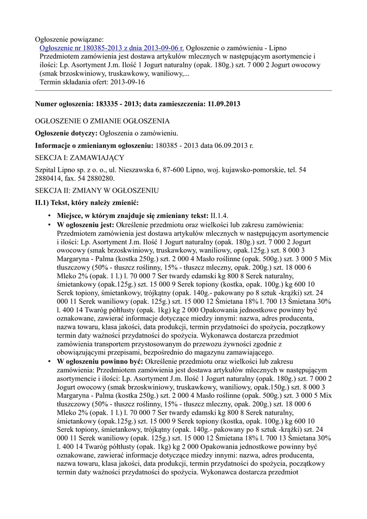 Ogłoszenie powiązane: Ogłoszenie nr 180385-2013 z dnia 2013-09-06 r. Ogłoszenie o zamówieniu - Lipno Przedmiotem zamówienia jest dostawa artykułów mlecznych w następującym asortymencie i ilości: Lp. Asortyment J.m. Ilość 1 Jogurt naturalny (opak. 180g.) szt. 7 000 2 Jogurt owocowy (smak brzoskwiniowy, truskawkowy, waniliowy,... Termin składania ofert: 2013-09-16 Numer ogłoszenia: 183335 - 2013; data zamieszczenia: 11.09.2013 OGŁOSZENIE O ZMIANIE OGŁOSZENIA Ogłoszenie dotyczy: Ogłoszenia o zamówieniu. Informacje o zmienianym ogłoszeniu: 180385 - 2013 data 06.09.2013 r. SEKCJA I: ZAMAWIAJĄCY Szpital Lipno sp. z o. o., ul. Nieszawska 6, 87-600 Lipno, woj. kujawsko-pomorskie, tel. 54 2880414, fax. 54 2880280. SEKCJA II: ZMIANY W OGŁOSZENIU II.1) Tekst, który należy zmienić: • Miejsce, w którym znajduje się zmieniany tekst: II.1.4. • W ogłoszeniu jest: Określenie przedmiotu oraz wielkości lub zakresu zamówienia: Przedmiotem zamówienia jest dostawa artykułów mlecznych w następującym asortymencie i ilości: Lp. Asortyment J.m. Ilość 1 Jogurt naturalny (opak. 180g.) szt. 7 000 2 Jogurt owocowy (smak brzoskwiniowy, truskawkowy, waniliowy, opak.125g.) szt. 8 000 3 Margaryna - Palma (kostka 250g.) szt. 2 000 4 Masło roślinne (opak. 500g.) szt. 3 000 5 Mix tłuszczowy (50% - tłuszcz roślinny, 15% - tłuszcz mleczny, opak. 200g.) szt. 18 000 6 Mleko 2% (opak. 1 l.) l. 70 000 7 Ser twardy edamski kg 800 8 Serek naturalny, śmietankowy (opak.125g.) szt. 15 000 9 Serek topiony (kostka, opak. 100g.) kg 600 10 Serek topiony, śmietankowy, trójkątny (opak. 140g.- pakowany po 8 sztuk -krążki) szt. 24 000 11 Serek waniliowy (opak. 125g.) szt. 15 000 12 Śmietana 18% l. 700 13 Śmietana 30% l. 400 14 Twaróg półtłusty (opak. 1kg) kg 2 000 Opakowania jednostkowe powinny być oznakowane, zawierać informacje dotyczące miedzy innymi: nazwa, adres producenta, nazwa towaru, klasa jakości, data produkcji, termin przydatności do spożycia, początkowy termin daty ważności przydatności do spożycia. Wykonawca dostarcza przedmiot zamówienia transportem przystosowanym do przewozu żywności zgodnie z obowiązującymi przepisami, bezpośrednio do magazynu zamawiającego. • W ogłoszeniu powinno być: Określenie przedmiotu oraz wielkości lub zakresu zamówienia: Przedmiotem zamówienia jest dostawa artykułów mlecznych w następującym asortymencie i ilości: Lp. Asortyment J.m. Ilość 1 Jogurt naturalny (opak. 180g.) szt. 7 000 2 Jogurt owocowy (smak brzoskwiniowy, truskawkowy, waniliowy, opak.150g.) szt. 8 000 3 Margaryna - Palma (kostka 250g.) szt. 2 000 4 Masło roślinne (opak. 500g.) szt. 3 000 5 Mix tłuszczowy (50% - tłuszcz roślinny, 15% - tłuszcz mleczny, opak. 200g.) szt. 18 000 6 Mleko 2% (opak. 1 l.) l. 70 000 7 Ser twardy edamski kg 800 8 Serek naturalny, śmietankowy (opak.125g.) szt. 15 000 9 Serek topiony (kostka, opak. 100g.) kg 600 10 Serek topiony, śmietankowy, trójkątny (opak. 140g.- pakowany po 8 sztuk -krążki) szt. 24 000 11 Serek waniliowy (opak. 125g.) szt. 15 000 12 Śmietana 18% l. 700 13 Śmietana 30% l. 400 14 Twaróg półtłusty (opak. 1kg) kg 2 000 Opakowania jednostkowe powinny być oznakowane, zawierać informacje dotyczące miedzy innymi: nazwa, adres producenta, nazwa towaru, klasa jakości, data produkcji, termin przydatności do spożycia, początkowy termin daty ważności przydatności do spożycia. Wykonawca dostarcza przedmiot zamówienia transportem przystosowanym do przewozu żywności zgodnie z obowiązującymi przepisami, bezpośrednio do magazynu zamawiającego. II.2) Tekst, który należy dodać: • Miejsce, w którym należy dodać tekst: II.1.4. • Tekst, który należy dodać w ogłoszeniu: Określenie przedmiotu oraz wielkości lub zakresu zamówienia: Przedmiotem zamówienia jest dostawa artykułów mlecznych w następującym asortymencie i ilości: Lp. Asortyment J.m. Ilość 1 Jogurt naturalny (opak. 180g.) szt. 7 000 2 Jogurt owocowy (smak brzoskwiniowy, truskawkowy, waniliowy, opak.150g.) szt. 8 000 3 Margaryna - Palma (kostka 250g.) szt. 2 000 4 Masło roślinne (opak. 500g.) szt. 3 000 5 Mix tłuszczowy (50% - tłuszcz roślinny, 15% - tłuszcz mleczny, opak. 200g.) szt. 18 000 6 Mleko 2% (opak. 1 l.) l. 70 000 7 Ser twardy edamski kg 800 8 Serek naturalny, śmietankowy (opak.125g.) szt. 15 000 9 Serek topiony (kostka, opak. 100g.) kg 600 10 Serek topiony, śmietankowy, trójkątny (opak. 140g.- pakowany po 8 sztuk -krążki) szt. 24 000 11 Serek waniliowy (opak. 125g.) szt. 15 000 12 Śmietana 18% l. 700 13 Śmietana 30% l. 400 14 Twaróg półtłusty (opak. 1kg) kg 2 000 Opakowania jednostkowe powinny być oznakowane, zawierać informacje dotyczące miedzy innymi: nazwa, adres producenta, nazwa towaru, klasa jakości, data produkcji, termin przydatności do spożycia, początkowy termin daty ważności przydatności do spożycia. Wykonawca dostarcza przedmiot zamówienia transportem przystosowanym do przewozu żywności zgodnie z obowiązującymi przepisami, bezpośrednio do magazynu zamawiającego.