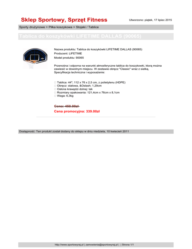 Sklep Sportowy, Sprzęt Fitness Utworzono: piątek, 17 lipiec 2015 Sporty drużynowe > Piłka koszykowa > Stojaki / Tablice Tablica do koszykówki LIFETIME DALLAS (90065) Nazwa produktu: Tablica do koszykówki LIFETIME DALLAS (90065) Producent: LIFETIME Model produktu: 90065 Przenośna i odporna na warunki atmosferyczne tablica do koszykowki, ktorą można zawiesić w dowolnym miejscu. W zestawie obręcz "Classic" wraz z siatką. Specyfikacja techniczna i wyposażenie: Tablica: 44"; 112 x 76 x 2,5 cm, z polietylenu (HDPE) Obręcz: stalowa, Ø 1,29cm Osłona krawędzi dolnej: tak Rozmiary opakowania: 121,4cm x 76cm x 8,1cm Waga: 6,3kg Cena: 450.00zł Cena promocyjna: 339.00zł Dostępność: Ten produkt został dodany do sklepu w dniu niedziela, 10 kwiecień 2011 http://www.sportowyraj.pl | [email protected] | | Strona 1/1