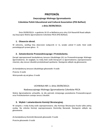 PROTOKÓŁ Zwyczajnego Walnego Zgromadzenia Członków Polish Educational and Cultural Association (PSS Belfast) z dnia 29/09/2012r. Dnia 29/09/2012r. o godzinie 10.15 w Belfaście przy ulicy 514 Ravenhill Road odbyło się Zwyczajne Walne Zgromadzenie Członków PECA (PSS Belfast). 1. Otwarcie obrad. W zebraniu, według listy obecności (załącznik nr 1), wzięło udział 9 osób. Ilość osób posiadających prawo głosu - 9. 2. Zatwierdzenie Przewodniczącego i Protokolanta. Zarząd zaproponował kandydaturę Janusza Libudzkiego (JL) na Przewodniczącego Walnego Zgromadzenia. Ze względu na małą ilość osób biorących w Zgromadzeniu zaproponowano również, aby Janusz Libudzki protokołował spotkanie. Następnie odbyło się głosowanie. Za kandydaturą Janusza Libudzkiego głosowało: 9 osób Przeciw: 0 osób Wstrzymało się od głosu: 0 osób UCHWAŁA NR 1 z dnia 29/09/2012r. Nadzwyczajnego Walnego Zgromadzenia Członków PECA Walne Zgromadzenie uchwaliło, że dla potrzeb niniejszego posiedzenia Przewodniczącym oraz Protokolantem zostaje Janusz Libudzki. 3. Wybór i zatwierdzenie Komisji Skrutacyjnej. W związku z małą liczbą osób zaproponowano, aby Komisja Sktutacyjna liczyła tylko jedną osobę. Na członka Komisji zaproponowano Dominikę Banasiak. Następnie odbyło się głosowanie. Za kandydaturą Dominiki Banasiak głosowało: 9 osób Przeciw głosowało: 0 osób 1 Wstrzymało się od głosu: 0 osób UCHWAŁA NR 2 z dnia 29/09/12 Zwyczajnego Walnego Zgromadzenia Członków PECA Walne Zgromadzenie dla celów niniejszego posiedzenia powołało Dominikę Banasiak do podliczania głosów w czasie zebrania. 4. Zatwierdzenie porządku Zebrania. Przewodniczący zebrania zapoznał uczestników z porządkiem obrad składającym się z następujących punktów: 1. Otwarcie Walnego Zgromadzenia. 2. Wybór Przewodniczącego i Protokolanta. 3. Wybór i zatwierdzenie Komisji Skrutacyjnej. 4. Zatwierdzenie porządku Zebrania. 5. Odczytanie protokołu z poprzedniego Walnego Zgromadzenia. 6. Przedstawienie sprawozdania Zarządu oraz raportu finansowego Stowarzyszenia. 7. Wysłuchanie sprawozdania Dyrektor PSS Belfast. 8. Odczytanie sprawozdania i opinii Komisji Rewizyjnej. 9. Głosowanie nad absolutorium dla ustępującego Zarządu PECA (PSS Belfast). 10. Wybór nowych członków zarządu Stowarzyszenia. 11. Wolne głosy i wnioski. 12. Zamknięcie Zgromadzenia. Przystąpiono do głosowania nad agendą przedstawioną przez Przewodniczącego. Za przyjęciem agendy głosowało: 9 osób Przeciw głosowało: 0 osób Wstrzymało się od głosu: 0 osób UCHWAŁA NR 3 z dnia 29/09/12 Zwyczajnego Walnego Zgromadzenia Członków PECA Nadzwyczajne Walne Zgromadzenie zaakceptowało porządek obrad dla celów niniejszego posiedzenia. 2 5. Odczytanie protokołu z poprzedniego Walnego Zgromadzenia. Przewodniczący, za zgodą uczestników, przedstawił najważniejsze punkty z ostatniego Walnego Zgromadzenia bez odczytywania całości protokołu. Poinformował również, że oryginał protokołu jest dostępny do wglądu u Sekretarza PECA. 6. Przedstawienie sprawozdania Zarządu oraz raportu finansowego Stowarzyszenia. Przewodniczący odczytał sprawozdanie z działalności Zarządu za rok 2011/2012 oraz raport finansowy Stowarzyszenia 7. Wysłuchanie sprawozdania Dyrektor PSS Belfast. Dyrektor PSS w Belfaście Beata Dąbrowska przedstawiła raport z działalności szkoły w roku szkolnym 2011/2012. 8. Odczytanie sprawozdania i opinii Komisji Rewizyjnej. Grzegorz Wardęga odczytał raport pokontrolny Komisji Rewizyjnej oraz przedstawił opinię Komisji o udzielenie ustępującemu Zarządowi absolutorium. 9. Głosowanie nad absolutorium dla ustępującego Zarządu PECA (PSS Belfast). Przystąpiono do głosowania nad absolutorium. Za udzieleniem absolutorium głosowało: 9 osób Przeciw głosowało: 0 osób Wstrzymało się od głosu: 0 osób UCHWAŁA NR 4 z dnia 29/09/12 Zwyczajnego Walnego Zgromadzenia Członków PECA Zwyczajne Walne Zgromadzenie udzieliło absolutorium Zarządowi PECA za rok 2011/2012. W związku z tym Zarząd został rozwiązany i przystąpiono do wyborów nowego Zarządu PECA. 3 10.Wybór nowych członków zarządu Stowarzyszenia. Chęć pracy w Zarządzie PECA wyrazili: Luiza Jackowiak, Katarzyna Garbal, Dominika Banasiak, Katarzyna Augustyniak, Janusz Libudzki. Przystąpiono do głosowania nad poszczególnymi kandydatami na Członków Zarządu. Kandydat: Luiza Jackowiak Za przyjęciem kandydatury głosowało: 9 osób, przeciw: 0 osób, wstrzymało się: 0 osób. Kandydat: Katarzyna Garbal Za przyjęciem kandydatury głosowało: 9osób, przeciw: 0 osób, wstrzymało się: 0 osób. Kandydat: Dominika Banasiak Za przyjęciem kandydatury głosowało: 9 osób, przeciw: 0 osób, wstrzymało się: 0 osób. Kandydat: Katarzyna Augustyniak Za przyjęciem kandydatury głosowało: 9 osób, przeciw: 0 osób, wstrzymało się: 0 osób. Kandydat: Janusz Libudzki Za przyjęciem kandydatury głosowało: 9 osób, przeciw: 0 osób, wstrzymało się: 0 osób. UCHWAŁA NR 5 z dnia 29/09/12 Zwyczajnego Walnego Zgromadzenia Członków PECA Zwyczajne Walne Zgromadzenie wybrało do Zarządu Stowarzyszenia na lata 2012/13 następujące osoby: Luizę Jackowiak, Katarzynę Garbal, Dominikę Banasiak, Katarzynę Augustyniak, Janusza Libudzkiego. 11.Wolne głosy i wnioski. Nie zgłoszono żadnych tematów do dyskusji. 4 12.Zamknięcie Zgromadzenia W związku z wyczerpaniem porządku Walnego Zgromadzenia PECA, Przewodniczący zakończył spotkanie. Protokolant: Janusz Libudzki Podpis: Przewodniczący: Janusz Libudzki Podpis: Załącznik nr 1: Lista obecności członków uprawnionych do głosowania. 5
