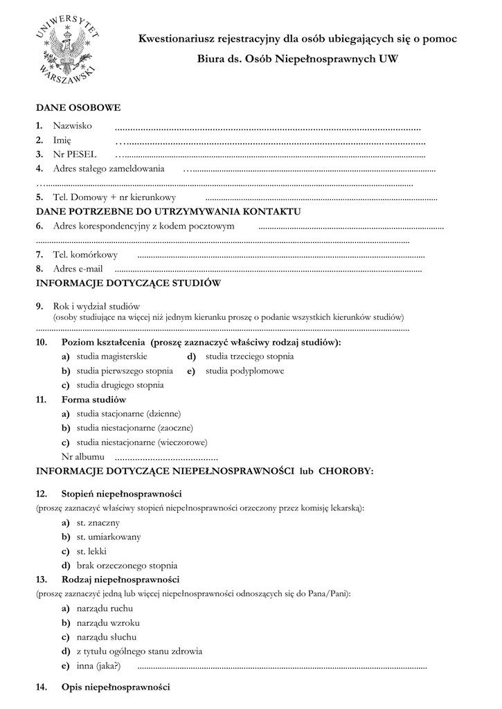 Kwestionariusz rejestracyjny dla osób ubiegających się o pomoc Biura ds. Osób Niepełnosprawnych UW DANE OSOBOWE 1. Nazwisko ....................................................................................................................... 2. Imię ….................................................................................................................... 3. Nr PESEL …........................................................................................................................................ 4. Adres stałego zameldowania ….............................................................................................................. …...................................................................................................................................................................... 5. Tel. Domowy + nr kierunkowy ......................................................................................................... DANE POTRZEBNE DO UTRZYMYWANIA KONTAKTU 6. Adres korespondencyjny z kodem pocztowym .................................................................................... ......................................................................................................................................................................... 7. Tel. komórkowy .................................................................................................................................. 8. Adres e-mail ........................................................................................................................................... INFORMACJE DOTYCZĄCE STUDIÓW 9. Rok i wydział studiów (osoby studiujące na więcej niż jednym kierunku proszę o podanie wszystkich kierunków studiów) ......................................................................................................................................................................... 10. Poziom kształcenia (proszę zaznaczyć właściwy rodzaj studiów): a) studia magisterskie d) studia trzeciego stopnia b) studia pierwszego stopnia e) studia podyplomowe c) studia drugiego stopnia 11. Forma studiów a) studia stacjonarne (dzienne) b) studia niestacjonarne (zaoczne) c) studia niestacjonarne (wieczorowe) Nr albumu ......................................... INFORMACJE DOTYCZĄCE NIEPEŁNOSPRAWNOŚCI lub CHOROBY: 12. Stopień niepełnosprawności (proszę zaznaczyć właściwy stopień niepełnosprawności orzeczony przez komisję lekarską): 13. a) st. znaczny b) st. umiarkowany c) st. lekki d) brak orzeczonego stopnia Rodzaj niepełnosprawności (proszę zaznaczyć jedną lub więcej niepełnosprawności odnoszących się do Pana/Pani): a) b) c) d) e) 14. narządu ruchu narządu wzroku narządu słuchu z tytułu ogólnego stanu zdrowia inna (jaka?) ................................................................................................................................... Opis niepełnosprawności (proszę krótko opisać swoją niepełnosprawność uwzględniając w szczególności takie informacje, które mogą okazać się ważne przy doborze odpowiedniej pomocy, np. sposób poruszania się, rodzaj używanego sprzętu specjalistycznego, sposób pisania i czytania): ................................................................................................................................................................... ................................................................................................................................................................... ................................................................................................................................................................... ................................................................................................................................................................... ................................................................................................................................................................... ................................................................................................................................................................... 15. Trudności w studiowaniu (proszę opisać trudności pojawiające się podczas studiów, które spowodowały chęć skorzystania z pomocy BON) .................................................................................................................................................................... .................................................................................................................................................................... .................................................................................................................................................................... .................................................................................................................................................................... .................................................................................................................................................................... .................................................................................................................................................................... .................................................................................................................................................................... .................................................................................................................................................................... .................................................................................................................................................................... ..................................................................................................................